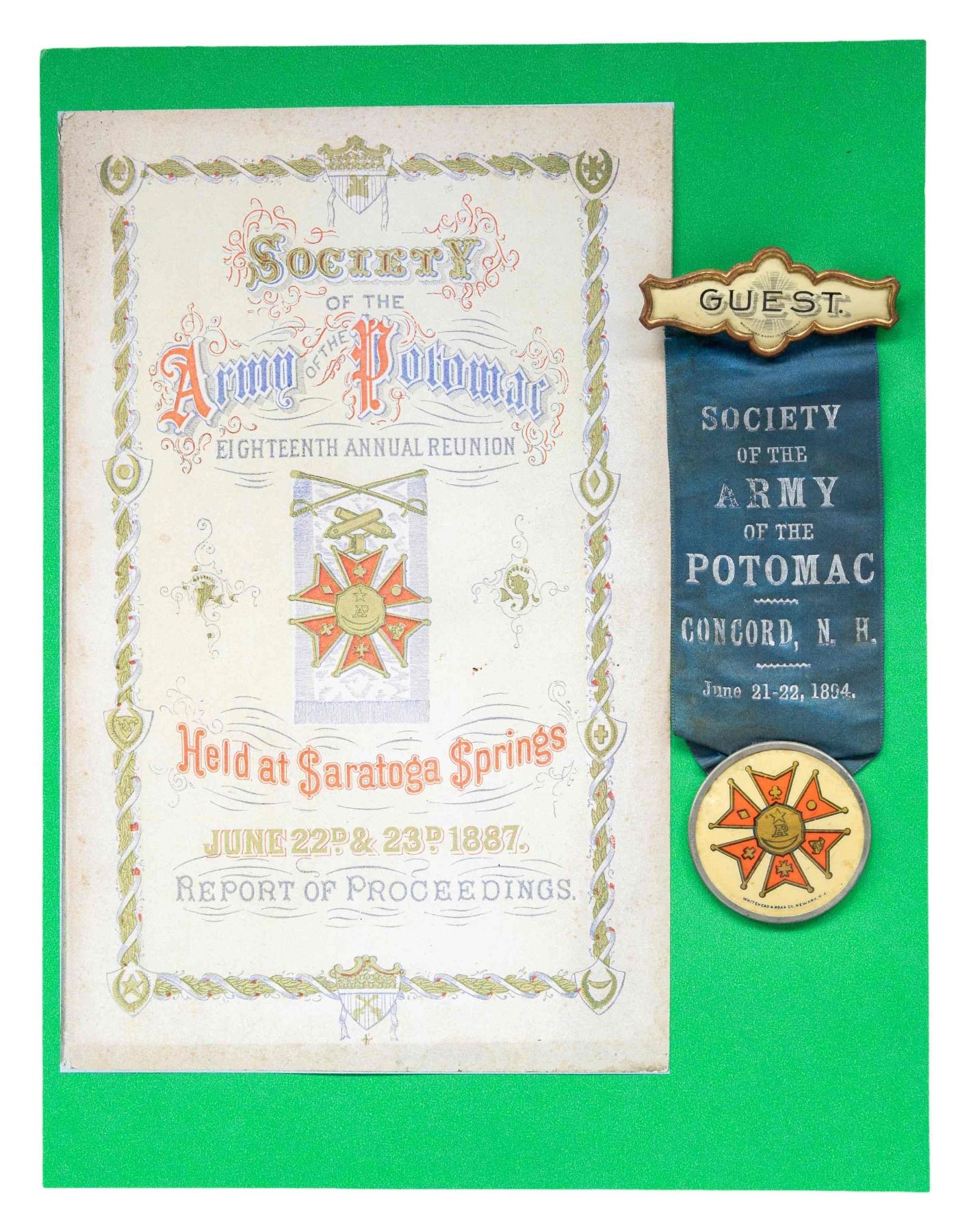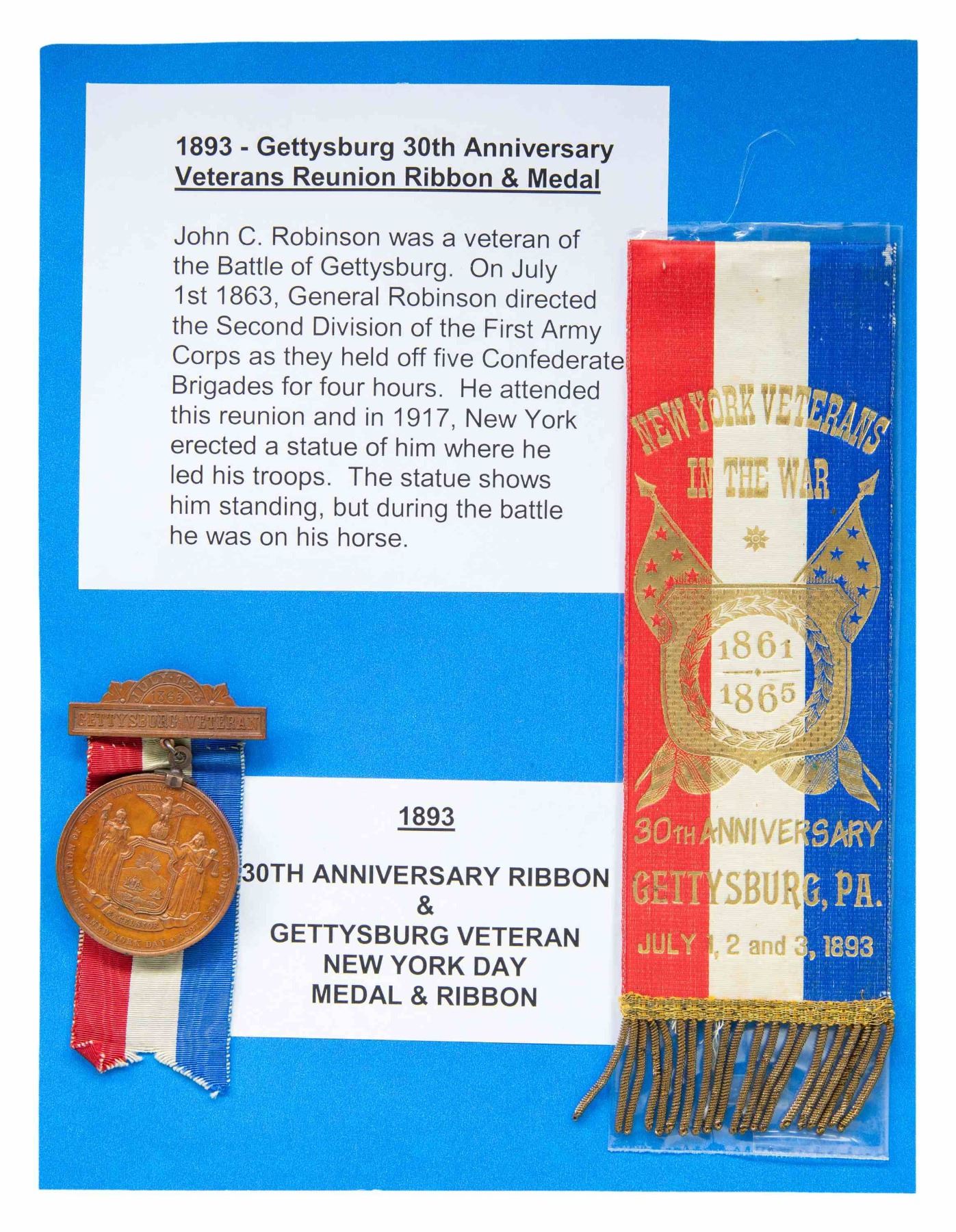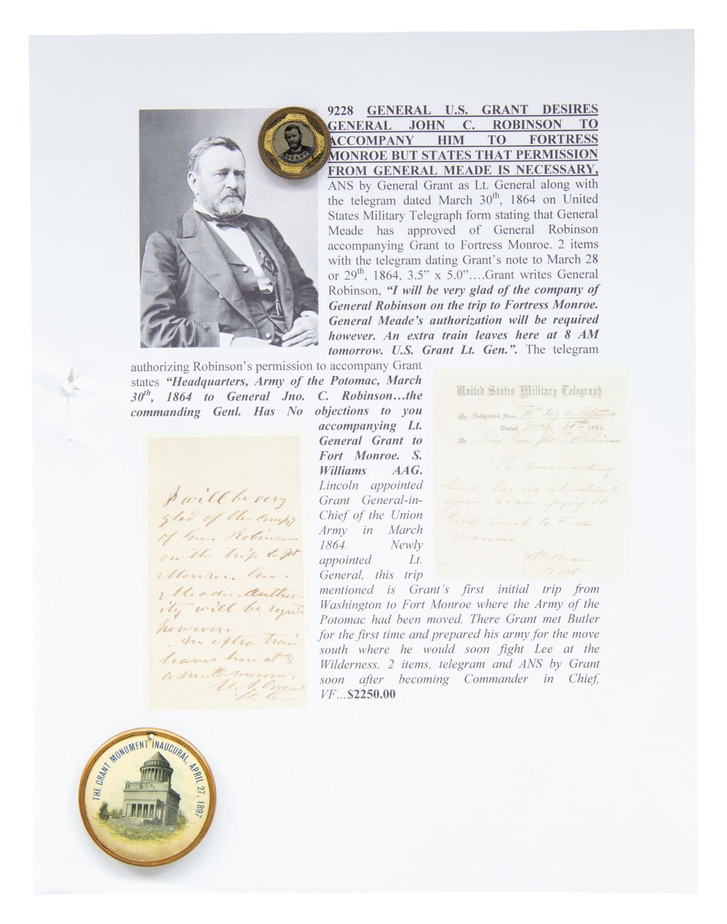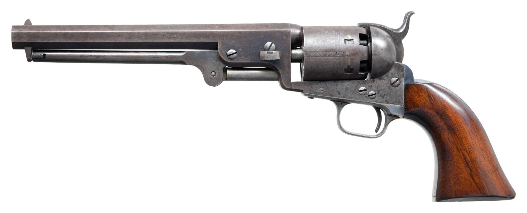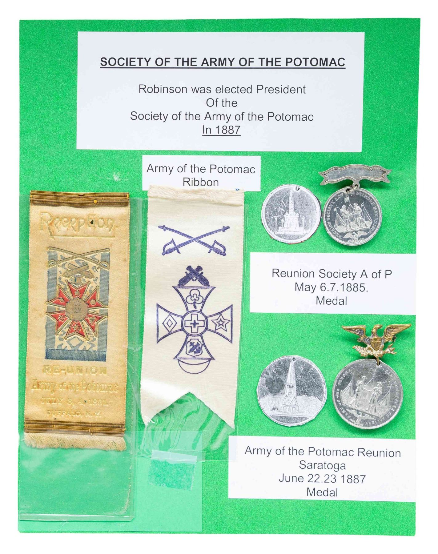 REVOLVER & MASSIVE MEMORABILIA ARCHIVE, MEDAL OF HONOR RECIPIENT. Cal. 36. S# 10225. General John Cleveland Robinson (1817-1897) had incredible military career after leaving West Point in 1838, through Seminole Wars, Mexican War, Civil War being awarded congressional medal of honor and losing his leg in 1864, headed Freedmen's Bureau in North Carolina, commander of Department of the South, retired from army May 6, 1869 with rank of Major General, later commander-in-chief of Grand Army of Republic, and Lieutenant Governor of New York. There is a full length bronze statue of Robinson on Gettysburg battlefield at intersection of Robinson & Doubleday Avenues. This archive has large file of provenance which accompanies lot. Everything in archive is very well preserved and very good condition. Revolver is standard configuration 3rd model Colt 1851 navy revolver made in 1852 when Robinson was stationed at Fort Gibson, Indian Territory [Oklahoma]. Revolver is in fine condition retaining about 20% blue finish, muted case colors, fine crisp cylinder scene and all 6 crisp safety pins, grip frame retains almost all its original silver plate, and grips retain most of their original factory varnish, mechanics functional, crisp bright rifled bore with couple patches of light pitting. Original green velvet lined Colt mahogany casing is matching very good to fine condition, stained and soiled where revolver rubbed, "COLT'S PATENT" eagle flask added has denting on back side, correct style 2-cavity "COLT'S PATENT" mold marked "36B" for 36 caliber belt is added and fair condition, empty ELEY cap tin with scarce embossed foil label. Case is missing inset lock face escutcheon but has functional key in case. "Gen'l John C. Robinson" written on bottom of case. The massive archive has over 100 individual items, mostly collected by Carl Saddlemire starting about 1950 after he purchased gun from decedents of Gen. Robinson near where he lived. His son writes that his dad and family visited Gettysburg in 1953 and he took photo of Robinson statue with his Brownie camera which is in album. Carl is shown in newspaper articles as early as 1952 showing his gun collection. Carl & Richard continued to collect pertinent Robinson related items which are part of archive. There are several Robinson letters from 1839 at West Point, 1850 letter to Capt. Robinson at Fort Gibson, IT. Good 1861 letter written as Colonel 1st Michigan & color lithograph of Camp Union, 1st Mich, Col. John C. Robinson. There is a General US Grant autograph note signed directing Robinson to accompany him at Ft. Monroe in 1864. There are several signed orders by Brigadier Gen. Robinson and many reunion badges & ribbons and related letters. UNATTACHED ACCESSORIES: large binder contains provenance and history of archive, most all memorabilia is on binder sheets with notes as to identification, handwritten 9-page 1890 "Military Record of Gen. Robinson". CONDITION: very good to fine overall as noted in description, interested bidders should view large archive in person. PROVENANCE: General John C. Robinson (1817-1897) family descent to Carl Lewis Saddlemire (1914-1997) to his son Richard D. Saddlemire who added pertinent items to archive. (01-28136/JS). ANTIQUE. $10,000-20,000.