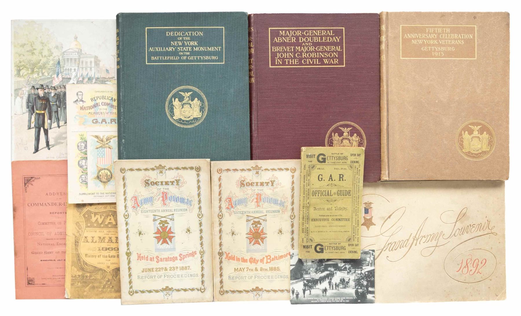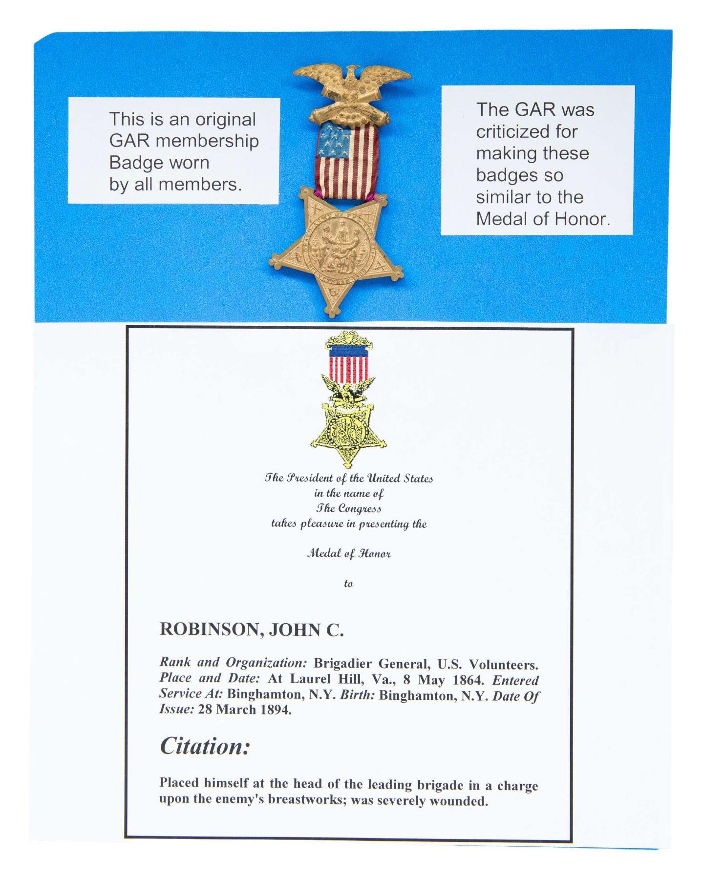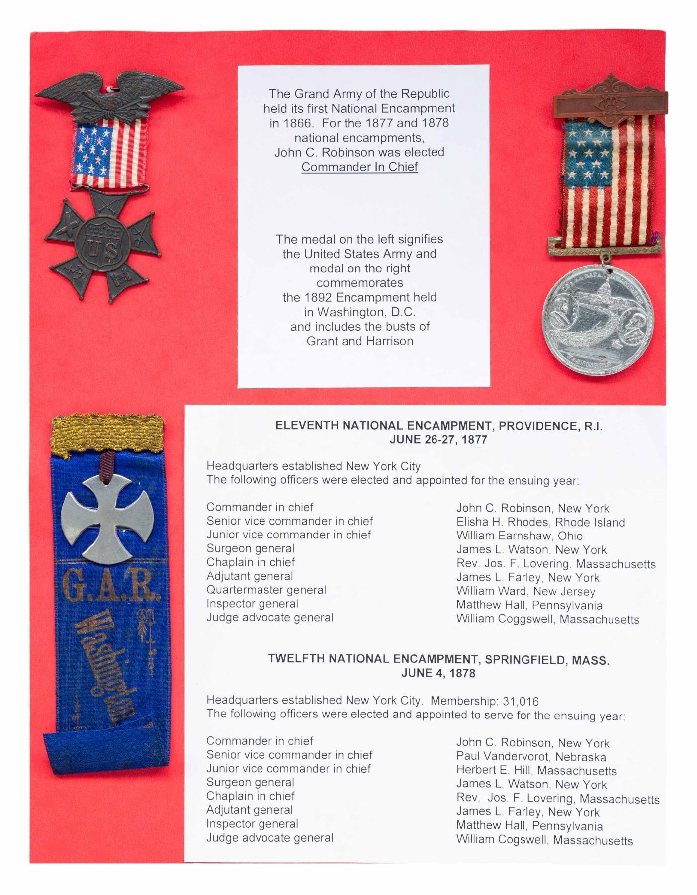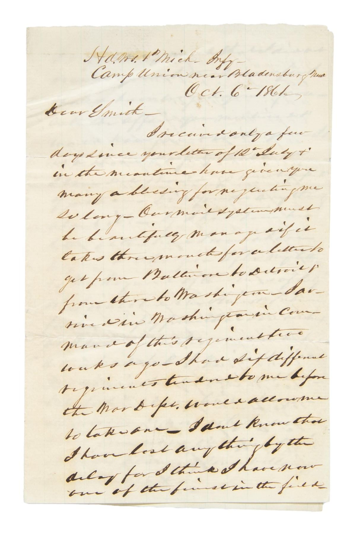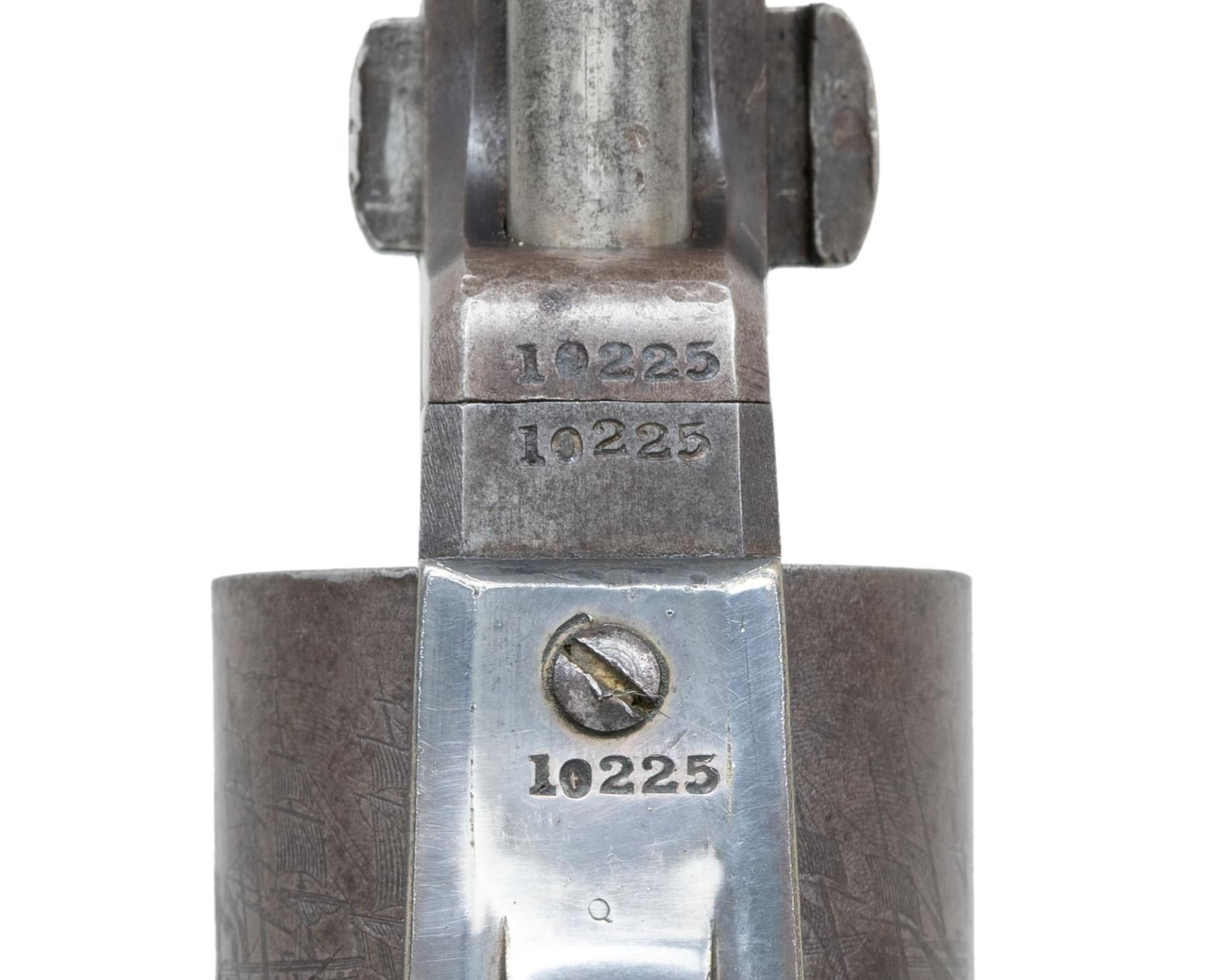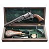 REVOLVER & MASSIVE MEMORABILIA ARCHIVE, MEDAL OF HONOR RECIPIENT. Cal. 36. S# 10225. General John Cleveland Robinson (1817-1897) had incredible military career after leaving West Point in 1838, through Seminole Wars, Mexican War, Civil War being awarded congressional medal of honor and losing his leg in 1864, headed Freedmen's Bureau in North Carolina, commander of Department of the South, retired from army May 6, 1869 with rank of Major General, later commander-in-chief of Grand Army of Republic, and Lieutenant Governor of New York. There is a full length bronze statue of Robinson on Gettysburg battlefield at intersection of Robinson & Doubleday Avenues. This archive has large file of provenance which accompanies lot. Everything in archive is very well preserved and very good condition. Revolver is standard configuration 3rd model Colt 1851 navy revolver made in 1852 when Robinson was stationed at Fort Gibson, Indian Territory [Oklahoma]. Revolver is in fine condition retaining about 20% blue finish, muted case colors, fine crisp cylinder scene and all 6 crisp safety pins, grip frame retains almost all its original silver plate, and grips retain most of their original factory varnish, mechanics functional, crisp bright rifled bore with couple patches of light pitting. Original green velvet lined Colt mahogany casing is matching very good to fine condition, stained and soiled where revolver rubbed, "COLT'S PATENT" eagle flask added has denting on back side, correct style 2-cavity "COLT'S PATENT" mold marked "36B" for 36 caliber belt is added and fair condition, empty ELEY cap tin with scarce embossed foil label. Case is missing inset lock face escutcheon but has functional key in case. "Gen'l John C. Robinson" written on bottom of case. The massive archive has over 100 individual items, mostly collected by Carl Saddlemire starting about 1950 after he purchased gun from decedents of Gen. Robinson near where he lived. His son writes that his dad and family visited Gettysburg in 1953 and he took photo of Robinson statue with his Brownie camera which is in album. Carl is shown in newspaper articles as early as 1952 showing his gun collection. Carl & Richard continued to collect pertinent Robinson related items which are part of archive. There are several Robinson letters from 1839 at West Point, 1850 letter to Capt. Robinson at Fort Gibson, IT. Good 1861 letter written as Colonel 1st Michigan & color lithograph of Camp Union, 1st Mich, Col. John C. Robinson. There is a General US Grant autograph note signed directing Robinson to accompany him at Ft. Monroe in 1864. There are several signed orders by Brigadier Gen. Robinson and many reunion badges & ribbons and related letters. UNATTACHED ACCESSORIES: large binder contains provenance and history of archive, most all memorabilia is on binder sheets with notes as to identification, handwritten 9-page 1890 "Military Record of Gen. Robinson". CONDITION: very good to fine overall as noted in description, interested bidders should view large archive in person. PROVENANCE: General John C. Robinson (1817-1897) family descent to Carl Lewis Saddlemire (1914-1997) to his son Richard D. Saddlemire who added pertinent items to archive. (01-28136/JS). ANTIQUE. $10,000-20,000.