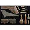 5) 4 POWDER FLASKS. This group contains an 8” flask with a copper body and brass charger. The body is covered in a net-like motif. The charger is marked “UNITED STATES FLASK CO.” / An 8” narrow bag flask with a plain copper body. Brass charger is marked “IMPROVED PATENT JAMES DIXON & SONS SHEFFIELD”. / A 4 1/4" flask with a zinc body having a scalloped fan motif. Unmarked brass charger. / A 3 1/2" flask having a plain iron body. The brass charger is unmarked. CONDITION: all non-ferrous flasks have minor shallow dents and functional chargers. The iron flask is free of dents but the charger spring does not function.