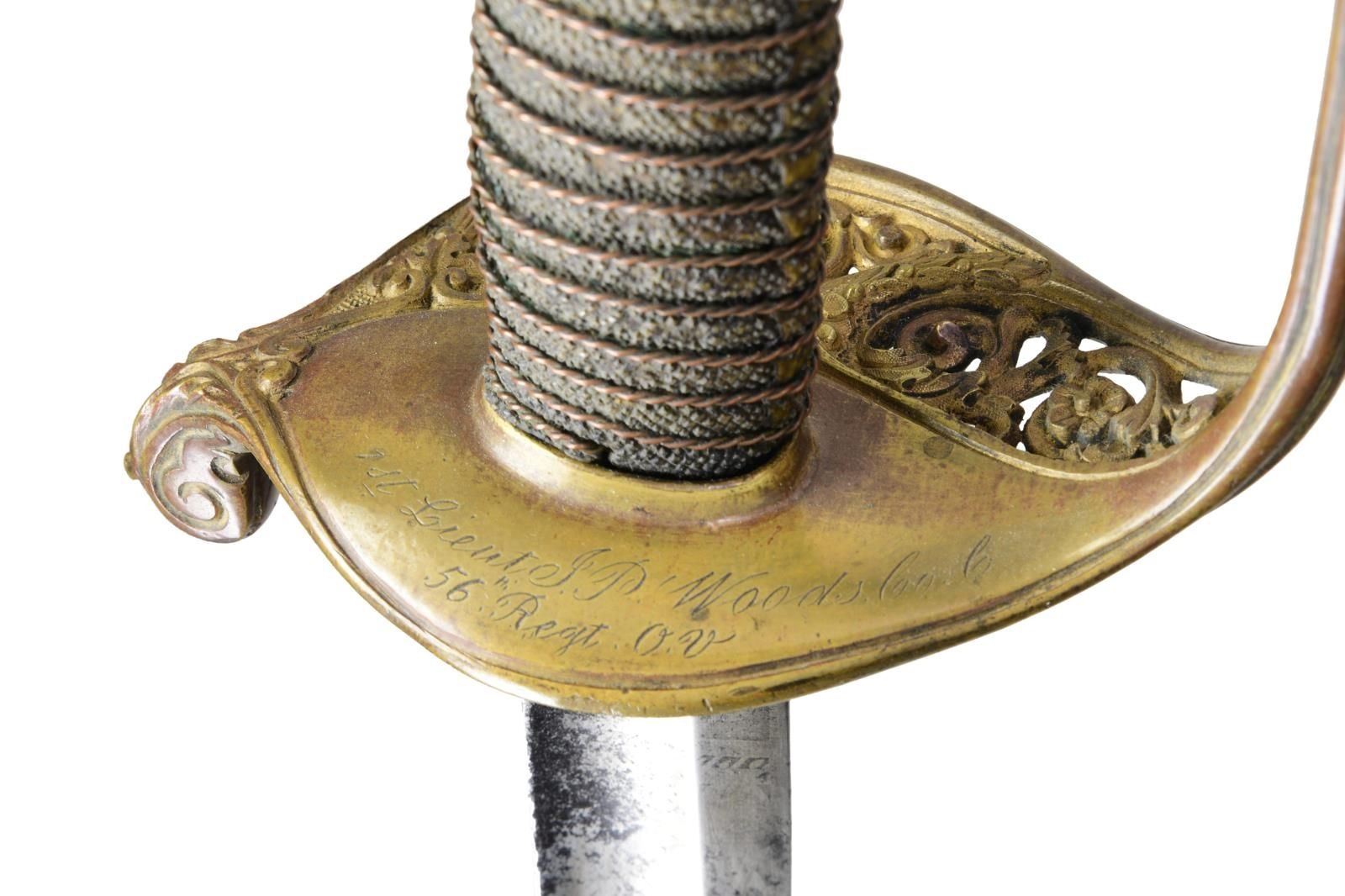 SWORD "LT J P WOOD, 56TH OVI". Import foot officer's sword patriotic etched 31" blade, shark skin grip, nicely inscribed in script on top of guard "1st lt. JP Wood Co. C, 56th Regt OV". Jeremiah P. Wood (1830-1863) Commissioned into Company "C" 56th Ohio Volunteer Infantry, November 7, 1861 as a 1st Lieutenant. Jeremiah would not survive the war and die of disease September 17, 1863. CONDITION: good overall, blade is gray, cleaned with areas of pitting, etched motifs partially visible including large "US". Hilt is with medium mustard patina, traces of plating in protected areas. Accompanying scabbard has engraved brass mounts with the restored brass throat. PROVENANCE: Lifelong collection of Robert "Mike" Bricker. (02-22321/JS). $1,500-2,000.