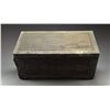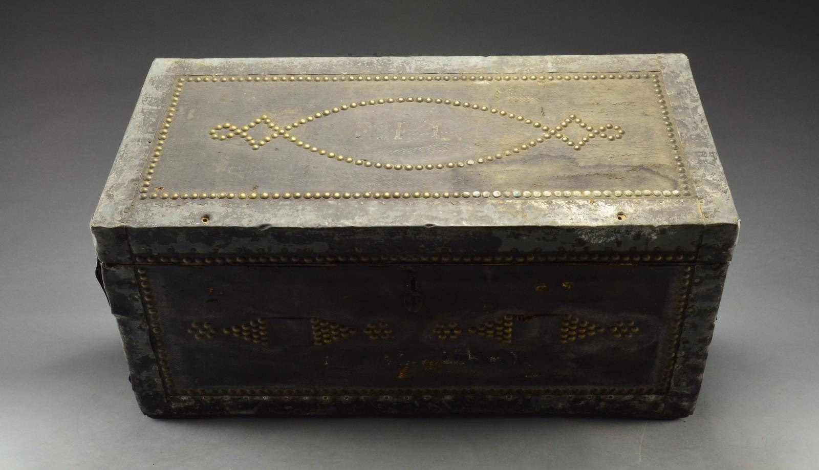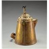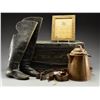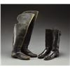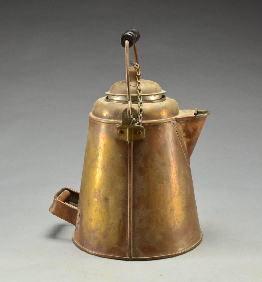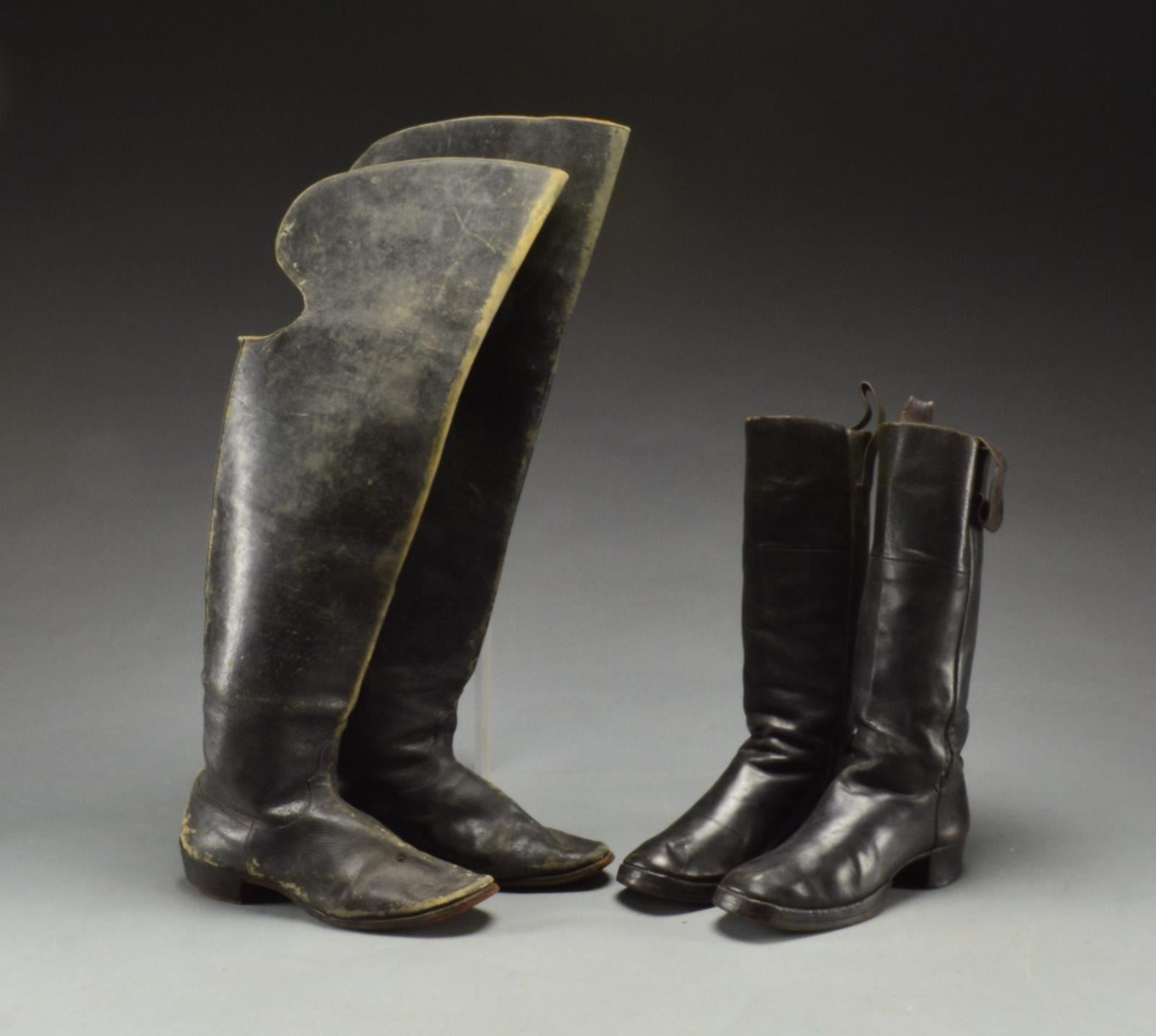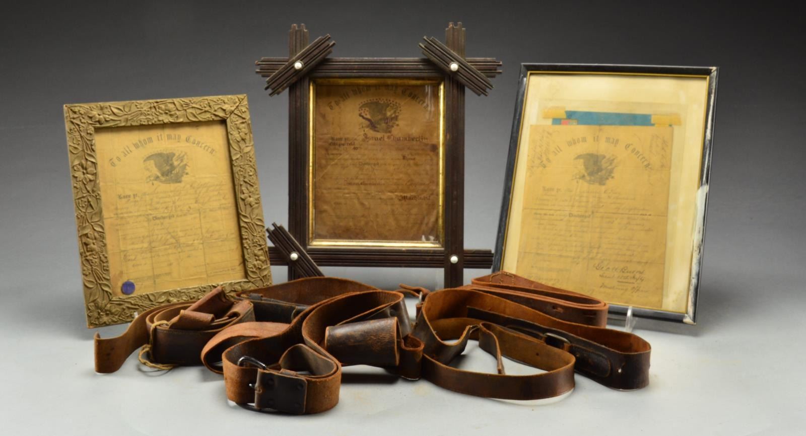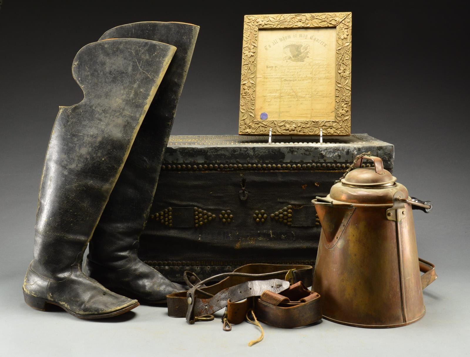& MORE. 1) BOOTS. A pair of tall leather cavalry boots measuring approx. 25 1/2" tall, 11" at the sole & 9" at the top flare. Boots appear to be post Civil War as they are right & left specific. CONDITION: finish is worn & a bit crazed but boots are substantially solid. (02-14210/BF). 2) BOOTS. Boots are approx. 15 1/2" high, 10" at the sole & 5" at the top. They are fine quality Civil War officer’s boots w/ leather pulls at the top. CONDITION: leather remains substantially supple. Overall light wear. 3) COFFEE POT. A lg. copper camp coffee pot dating to the early 20th century, measuring approx. 13" in height & 10" in diameter at the base. Lid is attached w/ a chain. Bail handle has a wooden center. CONDITION: light wear overall. (02-14286/BF). 4) LEATHER BELTS & SLINGS PLUS DISCHARGES. 20 Complete & partial leather belts & slings dating from the Civil War through the Spanish American War. There is a variety of belts & most of the slings are for canteens. Most belts are complete & just need some TLC. CONDITION: leather is generally dry but would respond well to a good cleaning & conditioning. / 3 Framed Civil War discharges. CONDITION: all discharges have colored w/ age but remain legible. 1 Has been enhanced w/ dark red coloration. (02-14288/BF). 5) EARLY TRUNK. A wooden trunk edged in metal & decorated w/ brass tacks. Trunk measures approx. 28" x 12 3/4" x 14". The outside is painted black. The inside is lined in blue paper. CONDITION: outside shows significant finish loss & deterioration to the covering. Inside has water staining & losses to the paper. (02-14314/BF). $700-1,000.