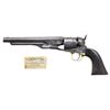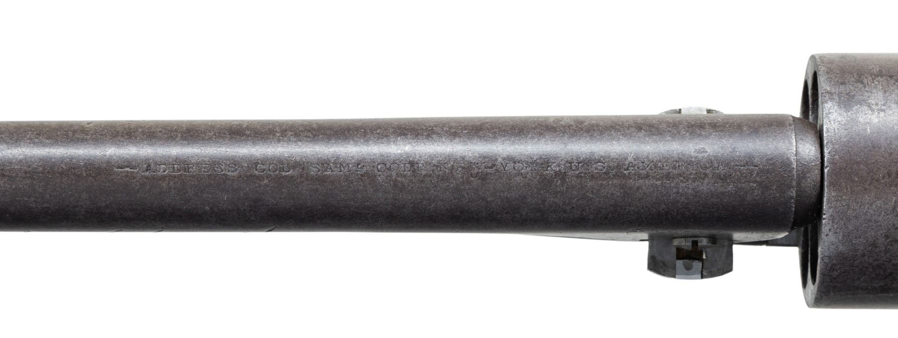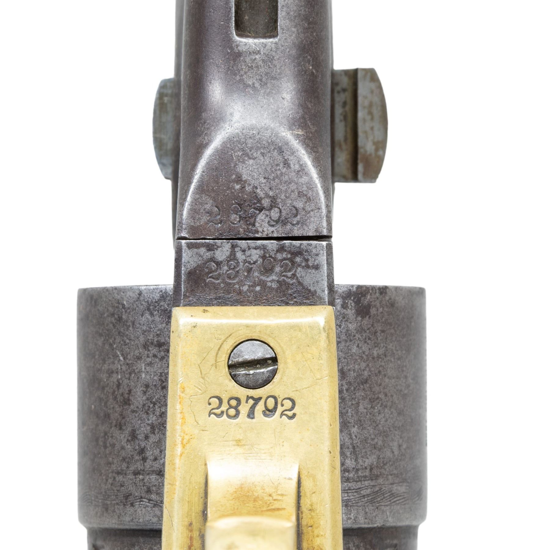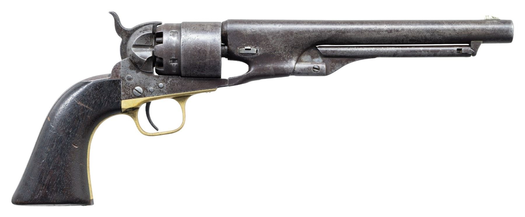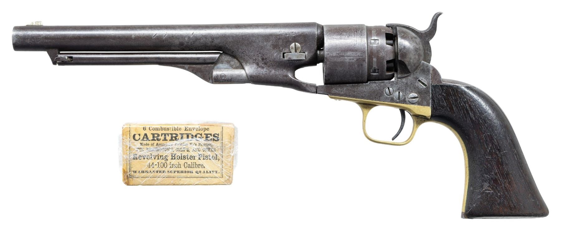 Cal. 44. S# 28792. The Colt 1860 army revolver cut for shoulder stock with 4-screw frame was manufactured early 1862. Standard configuration, notched steel backstrap, milled recoil shields, 8" round barrel with rolled address "COL. SAML COLT NEW-YORK U.S. AMERICA" with dashes, frame stamped on left "COLTS / PATENT", brass trigger guard. Cylinder has rolled Texas Navy battle scene. Sub-inspection initials observed barrel "S", cylinder "B" and "T", back strap "T", and trigger guard "T". Revolver is accompanied with original unopened paper wrapped pack of 6 Colt cartridges. CONDITION: good overall, all matching & complete except replacement reproduction wedge, grips fit well but no discernible inspection cartouches or S#, metal is overall mottled gray with scattered pitting, slightly loose at frame due to undersized wedge, cylinder scene is about 25% intact, all markings discernible, mechanics function, crisp rifled bore. Cartridge pack is very good. (01-28146/JS). ANTIQUE. $1,200-1,800.