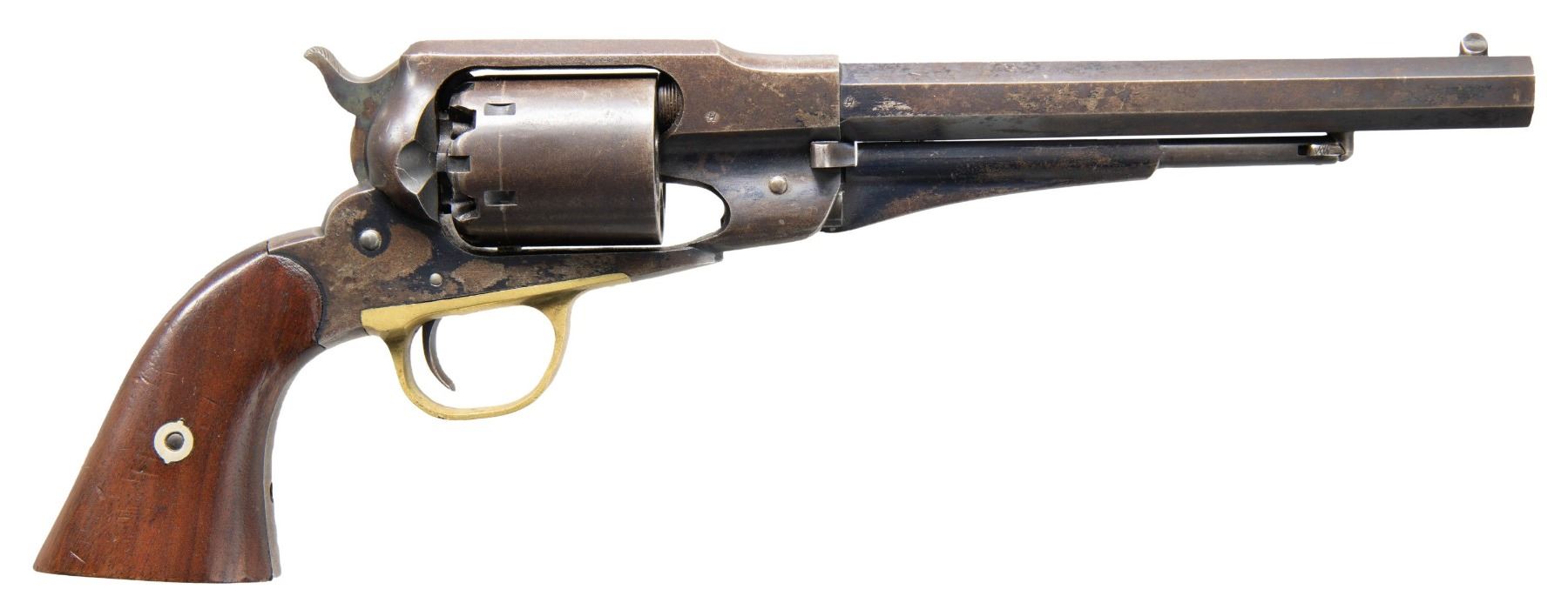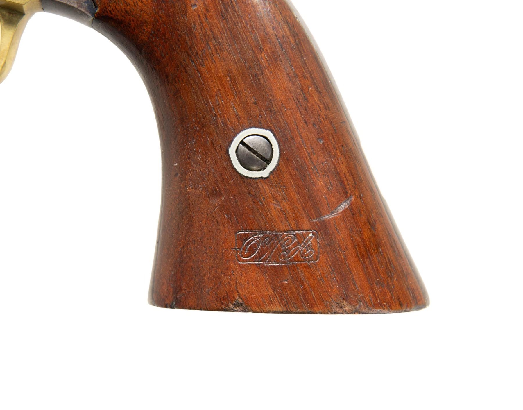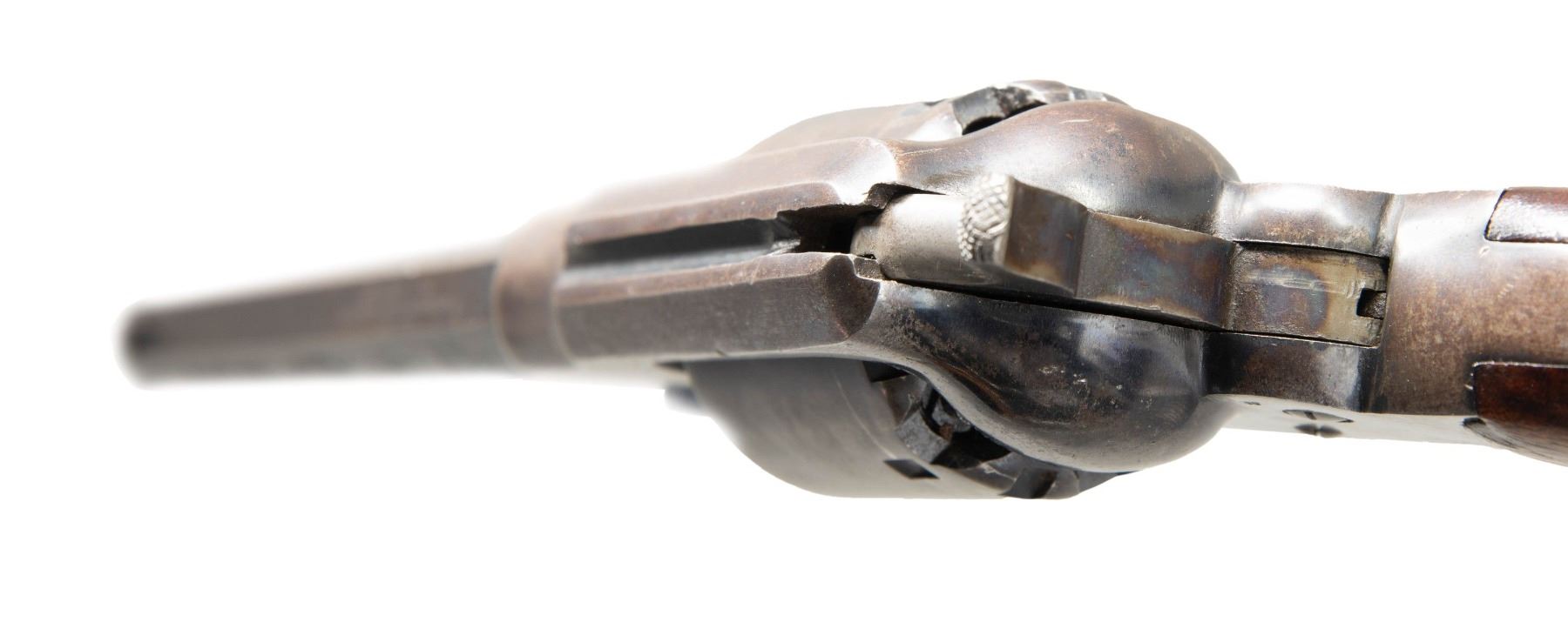 REVOLVER. Cal. 44. S# 99539. Standard configuration of the 2nd highest production US cavalry sidearm, 8" octagon barrel, 3-line address, solid steel frame and integral grip strap, brass trigger guard, 2-piece cartouched walnut grips. CONDITION: very good to fine, matching & complete, retaining about 30% blue, crisp markings, inspection initials on most parts and crisp Ainsworth cartouche on left grip. Mechanics crisp, shiny rifled bore. PROVENANCE: Estate Collection of John "Jack" Dhooghe. (01-28246/JS). ANTIQUE. $1,500-2,500.