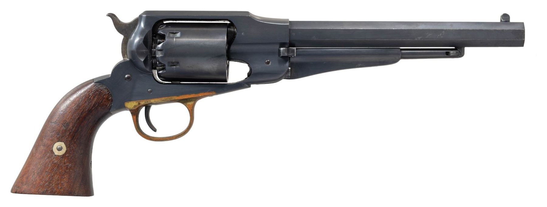 REVOLVER. Cal. 44. S# 83700. Standard configuration, 8" octagon barrel, 3-line address, solid steel frame and integral grip strap, brass trigger guard, 2-piece walnut grips. CONDITION: very good to fine as refinished, cylinder has different S#, totally refinished and reblued, crisp markings, inspection initials on most parts and good "GP" cartouche on left grip. Mechanics crisp, crisp shiny rifled bore. PROVENANCE: Estate Collection of Nicholas Apergis. (01-27494/JS). ANTIQUE. $1,200-1,500.