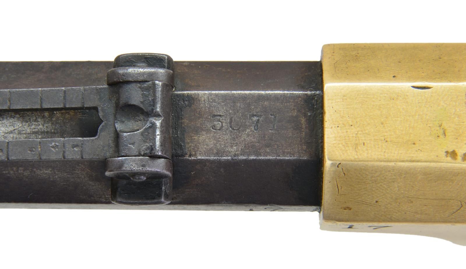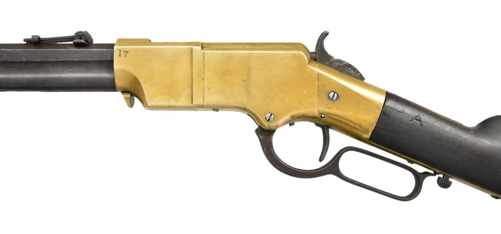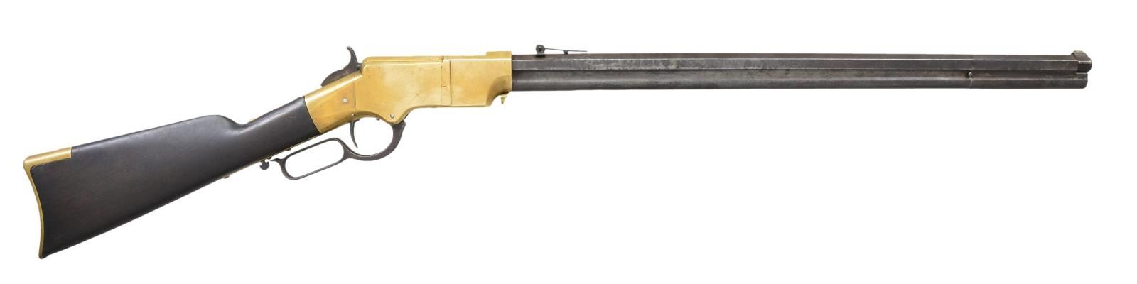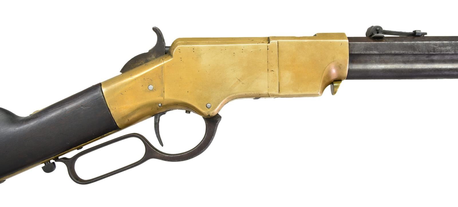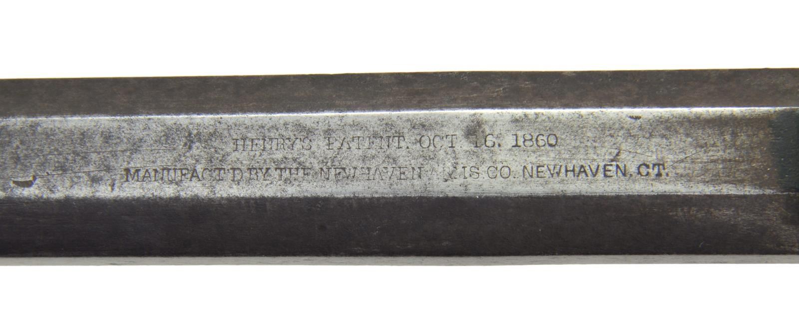DISTRICT OF COLUMBIA CAVALRY. Cal. 44 rim fire. S# 3071. Bbl. 23 1/4”. The Henry rifle was designed by B. Tyler Henry and was developed from the Volcanic lever action carbine. The Henry was a fundamental advancement in firepower during the Civil War. It allowed 15 consecutive shots to be fired before requiring a reload. This advanced armament was devastating to opposing Infantry troops armed with single shot percussion muskets. The Federal Government purchased 1,731 Henry rifles between 1862 & 1865. Nearly all rifles between the serial numbers 3000 & 4200 were issued to the 1st District of Columbia Cavalry regiments. Over 200 of the DC Cavalry Henry rifles were captured in September of 1864 during the infamous “Beefsteak Raid” by forces under the command of Confederate Major General Wade Hampton. These rifles saw subsequent issue to the 7th, 11th & 35th Virginia Cavalry. The unusual markings of the number “17” on the rear left side of the barrel and in the front left of the frame, coupled with the carved “A” at the left wrist, may indicate use and inventory by Confederate forces. This particular rifle has an octagonal barrel with a front sight and a 900 yard rear sight. The loading tube below holds 15 rounds of 44 caliber rim fire ammunition. The top of the barrel is marked “HENRY’S PATENT. OCT. 16, 1860 MANUFACT’D BY THE NEWHAVEN ARMS. CO. NEWHAVEN, CT.”. Between the rear sight and the frame the serial number “3071” can easily be seen. The right flat of the barrel bears the clear inspector’s mark “C.G.C.” for Charles G. Chapman. Under the Chapman mark is the sub-inspection letter “H”. The brass frame has another small “H” stamped approx. 3/8” back from the barrel just below the curve. Serial number “3071” may also be seen on the lower receiver tang that is concealed by the buttstock. All screws on the frame are original. The brass buttplate has a clear “H” stamped on the right-side top near the bend. The buttplate is also serial numbered on the inside “3071”, and the cleaning rod door is present, but there is no rod within the stock. The oil stained walnut stock has an “A” carved into the wood just below the frame tang. As stated above, it is important to note that the atypical marks of “17” at the rear of the barrel and in front of the frame, combined with the “A” carved into the stock, may indicate capture & reissue to Confederate Virginia Cavalry. UNATTACHED ACCESSORIES: a looseleaf binder containing information about Henry rifles in general, this particular Henry, and the 1st District of Columbia Cavalry. There is also information relating to the “Beefsteak Raid” orchestrated by Confederate General Wade Hampton. And a copy of the book “Spies, Traitors & Conspirators” by General Lafayette C. Baker with detailed information about the “Beefsteak Raid”. CONDITION: all iron parts have a pleasing dark patina with ample vestiges of the blued finish remaining. The brass frame & buttplate have a very attractive mellow patina. The cleaning rod cover in the buttplate is tight and functions freely. The stock has 2 tight, short cracks behind the receiver, as commonly seen. As expected, the barrel, frame & stock have numerous superficial bumps, scrapes & abrasions. However, the condition of this historic Henry rifle can be considered outstanding in comparison to most martially marked Henrys and particularly those associated with the 1st District of Columbia Cavalry. The mechanics operate correctly & smoothly with no observable problems. The bore shows use, but retains strong rifling. (01-23202/BF). $30,000-40,000.