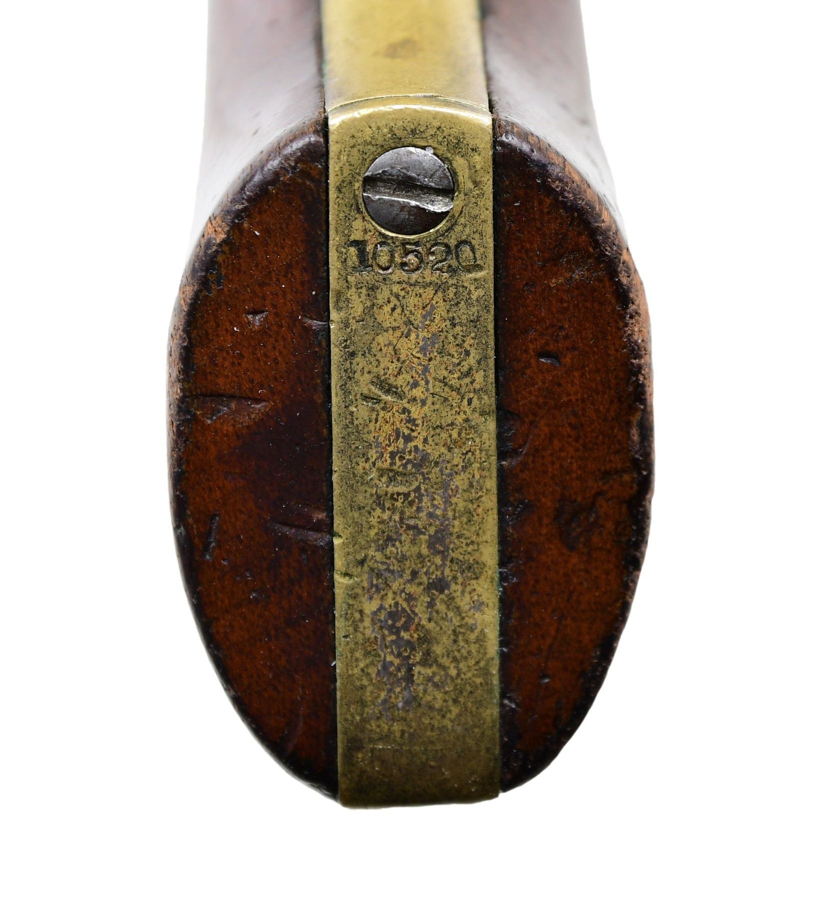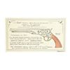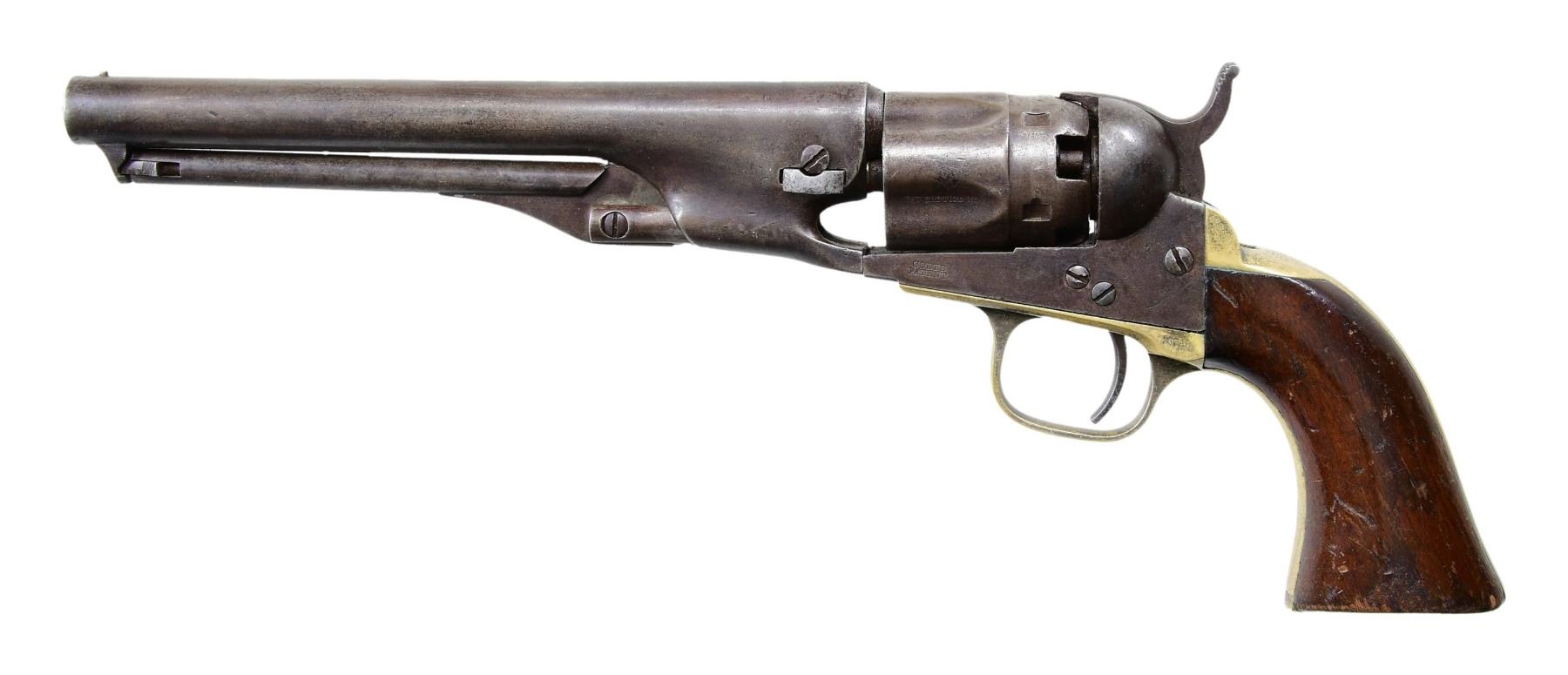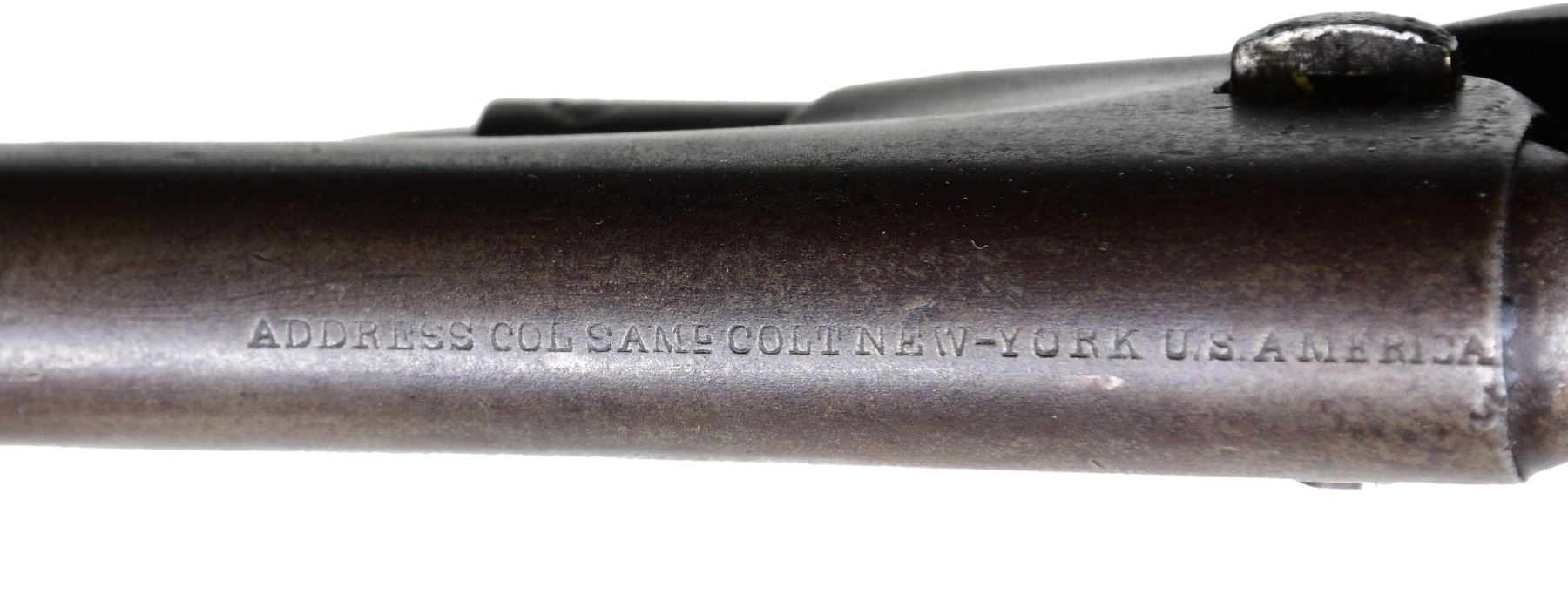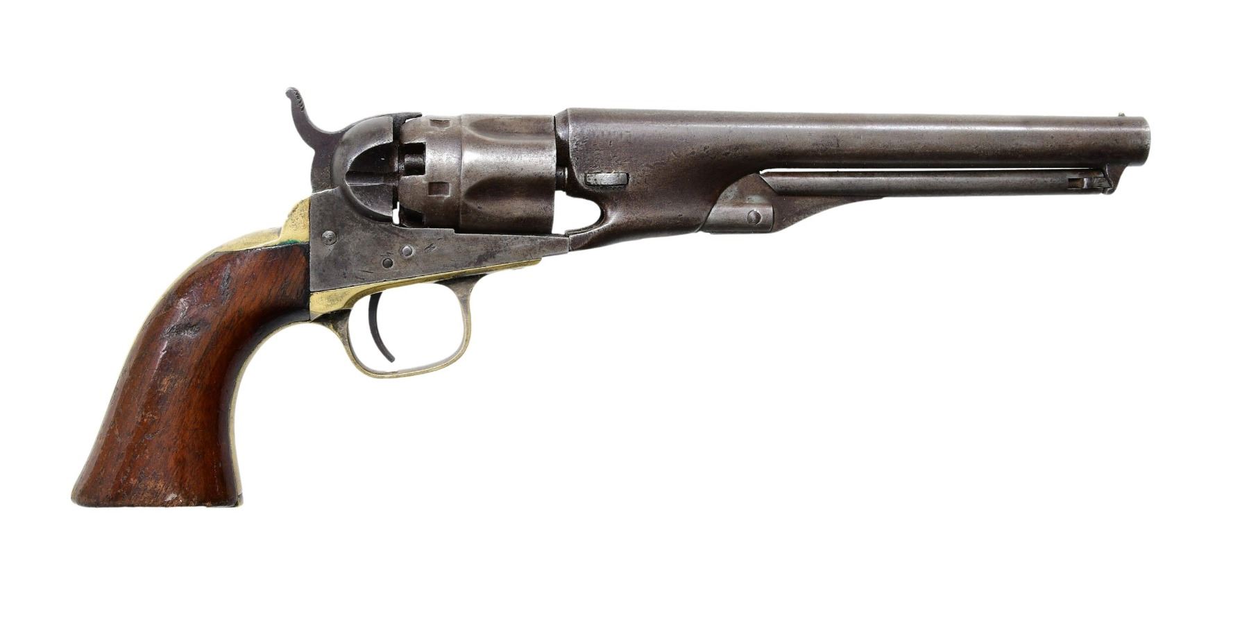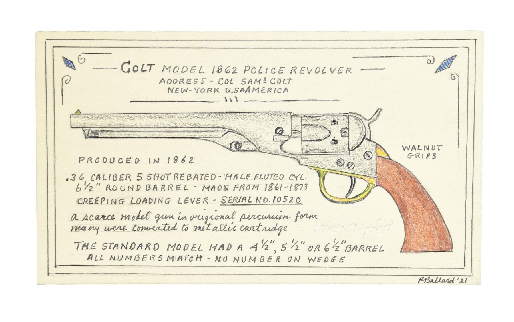 Cal. 36. S# 10520. Standard configuration made during Civil War in 1862, longest 6.5" round barrel with 1-line NEW YORK US AMERICA address, small "COLT'S / PATENT" left side of frame, "36CAL" stamped on left side of trigger guard, fluted 5-shot cylinder. Brass trigger guard and backstrap, varnished walnut grips. UNATTACHED ACCESSORIES: hand drawn colored collection card by Roger Ballard. CONDITION: very good overall, all matching and complete, metal is overall gray patina, traces of blue in protected areas, grips retain much of their original factory varnish, with heavy edge wear. Mechanically fine, good rifled bore. PROVENANCE: Roger Ballard collection. (01-26581/JS). $800-1,200.