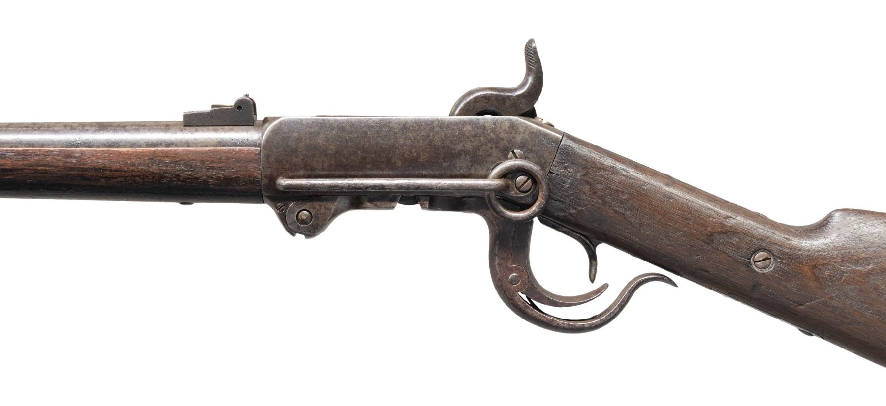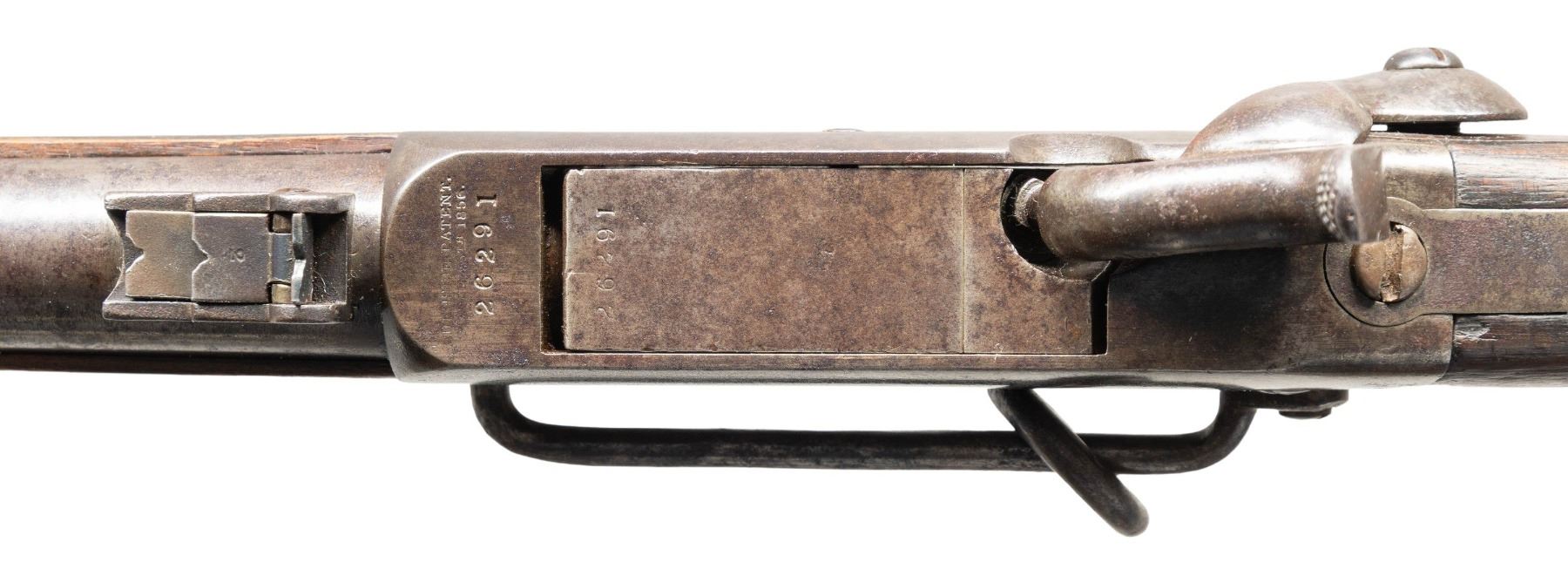 18th NEW YORK CAVALRY. Cal. 54. S# 26291. Standard configuration of this well used carbine, 21" barrel, found by serial number as being issued to private Henry Servis, Co. H. 18th NYC. Gun is listed by S# in regimental records in National Archives December 2, 1863. Henry Servis (1834-1903) entered service at 29 years old in July 1863, a farmer from St. Lawrence, NY. He saw service with his company in Louisiana and Texas, mustering out July 1866 in Victoria, Texas. UNATTACHED ACCESSORIES: copies of archive records of issue and Henry's service records. CONDITION: good to very good overall, all original, no finish, shows saddle wear, discernible markings "BURNSIDE PATENT / MODEL OF 1864" on breech & "BURNSIDE RIFLE CO / PROVIDENCE RI" on back action lock, S# match and clear, a large "H" is carved on right buttstock probably denoting Co. "H" which is Henry Servis' company. Mechanics functional, good rifled bore with pitting. PROVENANCE: Estate Collection of John "Jack" Dhooghe. (01-28273/JS). ANTIQUE. $1,500-2,500.