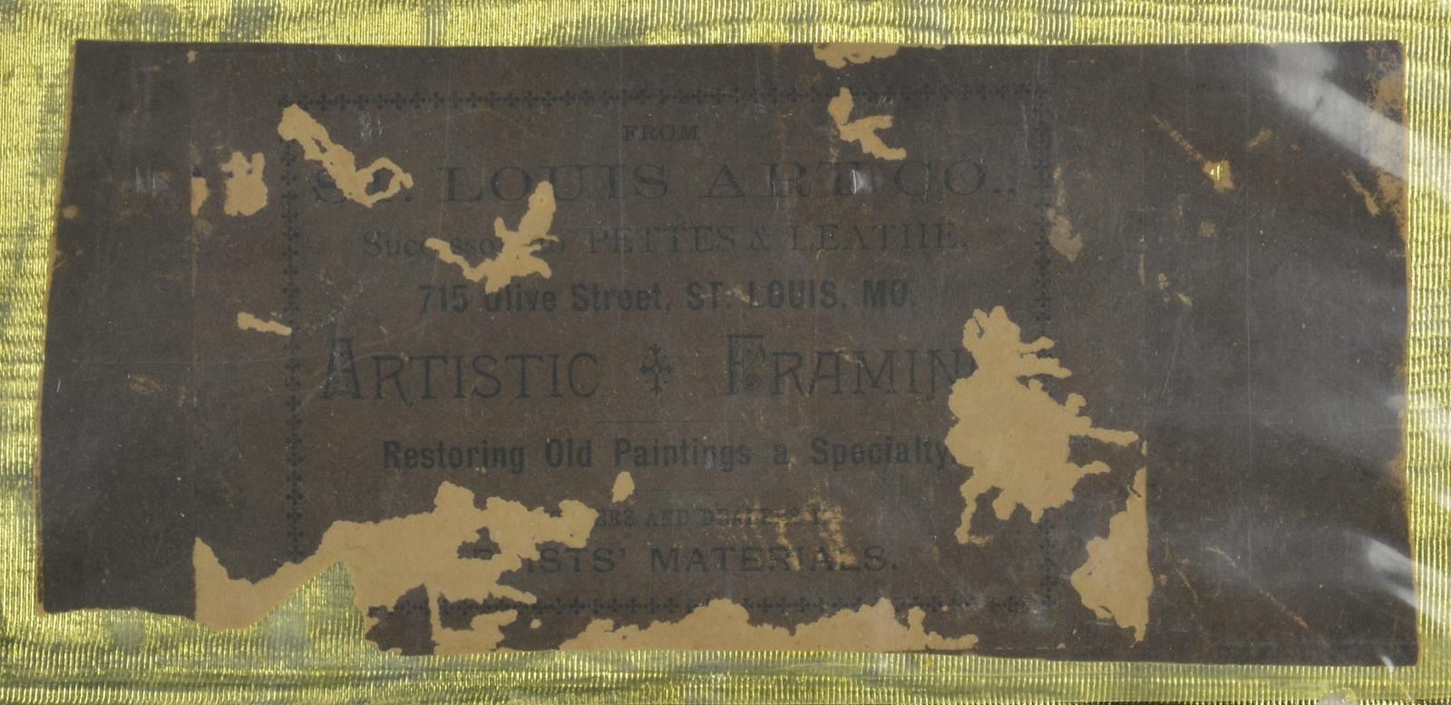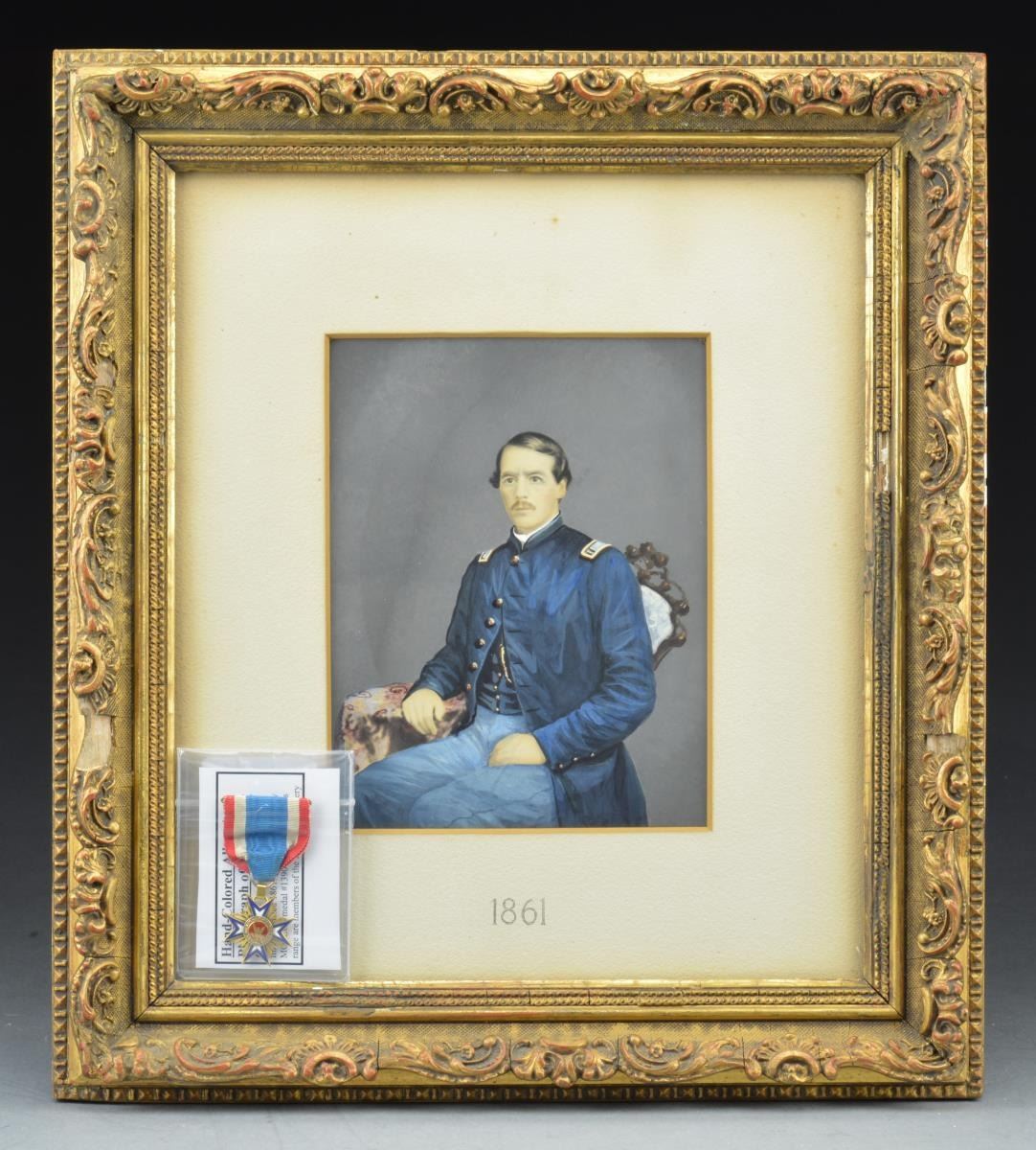 A gold MOLLUS medal numbered “13904” w/ original red, white & blue ribbon. Serial numbers in this range are generally related to the Iowa Commandery although the exact recipient of this medal has not been determined. The medal comes w/ an associated portrait of a Union captain that is dated 1861 on the mat. The portrait is a hand painted enhancement of a Civil War albumen photograph. The frame measures approx. 16" x 18" & the portrait measures approx. 6 1/2" x 8 1/2". CONDITION: the Loyal Legion medal shows no damage to the medal & only slight wear to the ribbon. The frame has some losses to the edge. The mat is a bit discolored, however the portrait is sharp & vibrant. (02-15761/BF). $500-700.