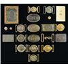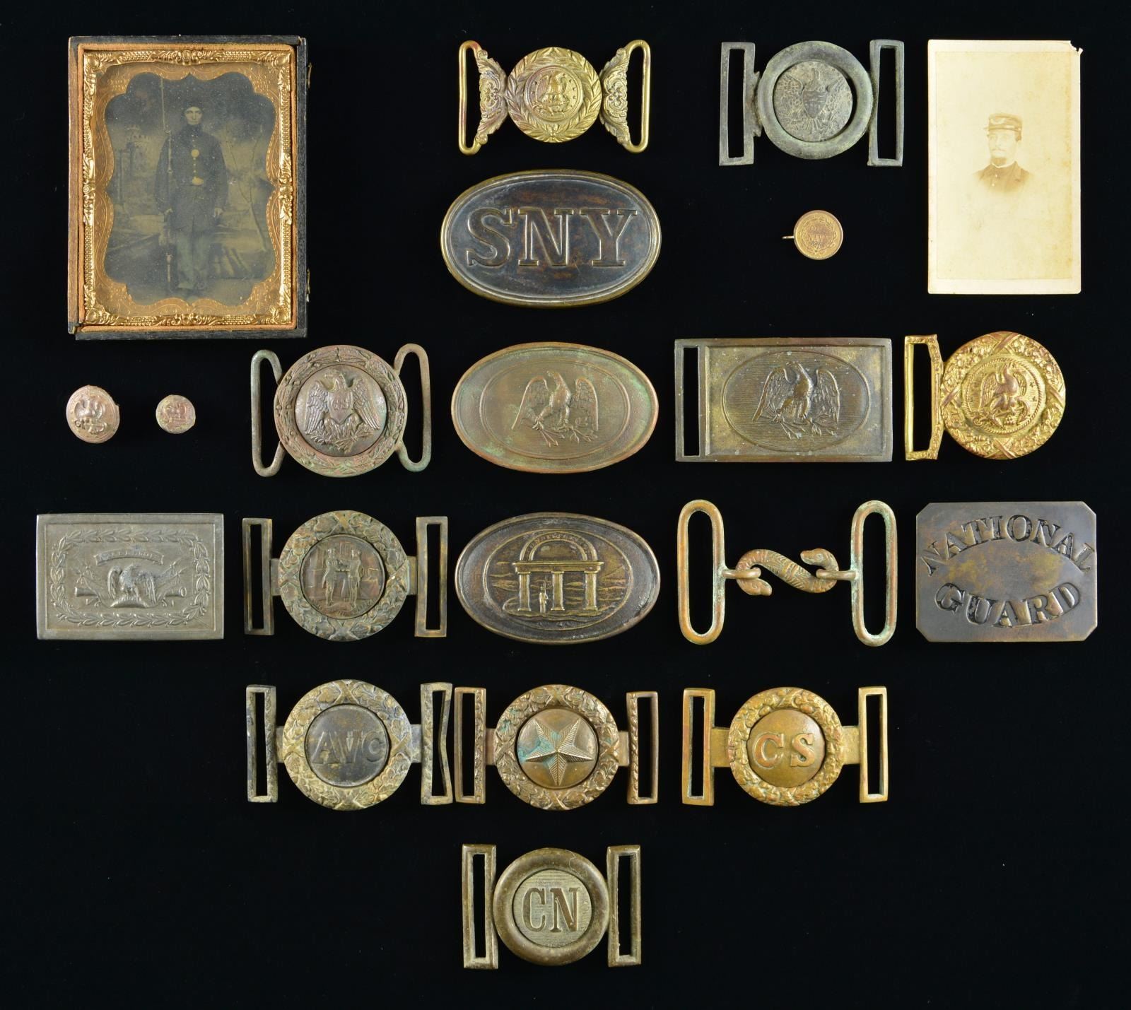 SASH BUCKLE WITH SEVERAL REPRODUCTION CIVIL WAR BUCKLES. This varied group includes 1 original oval SNY belt buckle with spade hooks. / 1 Quarter plate tintype of a standing Union enlisted man with all accoutrements and holding a musket in his right hand. Fanciful backdrop is of a castle scene. Gilded brass mat & frame. / 1 Excavated lightweight 2-piece sash buckle with an eagle on the center disc. / 1 Civil War token. / 1 CDV of a Naval Officer signed on the reverse “Compliments of Franklin Grant U.S. Navy”. / 2 Circa 1900 Naval buckles. / 2 Excavated Navy style buttons. / 12 Reproduction Civil War & earlier belt buckles, including Mississippi sword belt plate, Mississippi oval, Georgia oval, 2-piece Kentucky, circa 1820 New York, 2-piece CS on eagle, 2-piece AVC, 2-piece CN, 2-piece beveled star, 2-piece CS, National Guard clipped corner, and 2-piece snake buckle. CONDITION: SNY has a dark patina. Tintype has oxidation to the face, but remains substantially clear. CDV is a bit faded. Reproduction buckles have varying degrees of false patina. (02-17815/BF). $700-1,100.