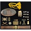 This lot includes an M1851 officer’s cavalry hat insignia. / 1 curry brush with embossed logo on top. / 1 large brass snake buckle with both keepers attached. / 1 brass snake buckle with no keepers. / 10 excavated round balls in 69cal. / 1 paper wrapped 69 cal. cartridge. / 1 Virginia staff button with “EXTRA QUALITY” backmark. / 1 cleaned excavated plain clip-corner buckle with no hooks. The buckle has begun to acquire a nice patina. / 1 brass belt sizing keeper. / 1 yellow cavalry hat cord. / 1 Civil War or earlier 2” section of train rail. / 1 excavated lightweight sash buckle with an eagle on the front and an adjustment keeper. / 1 interlocking 2-piece brass star buckle on a leather belt. It is likely this buckle is of post Civil War manufacture. CONDITION: all items generally show light wear. Excavated items have an oxidized patina. Leather belt shows moderate wear. (02-17465/BF). $600-800.