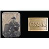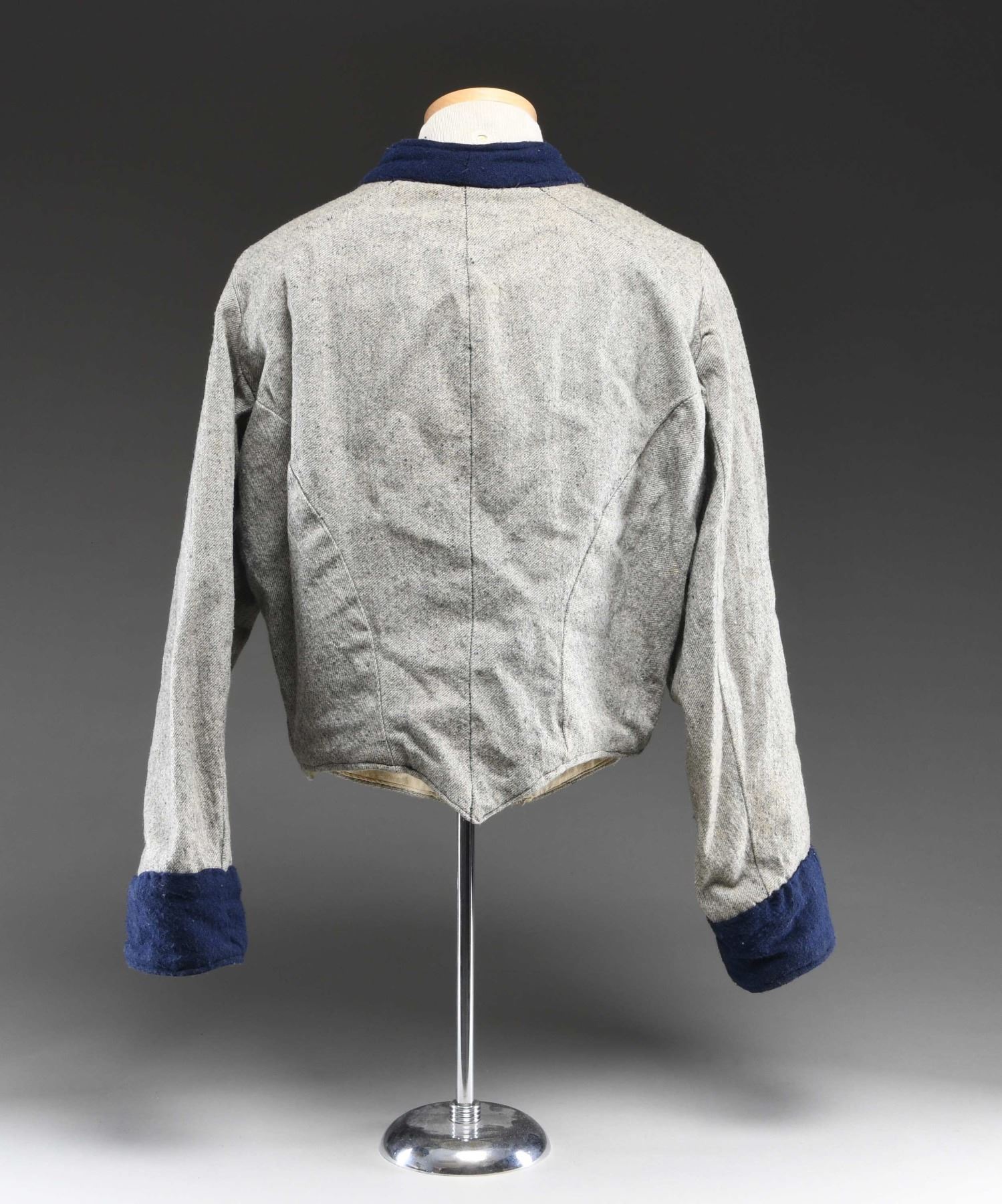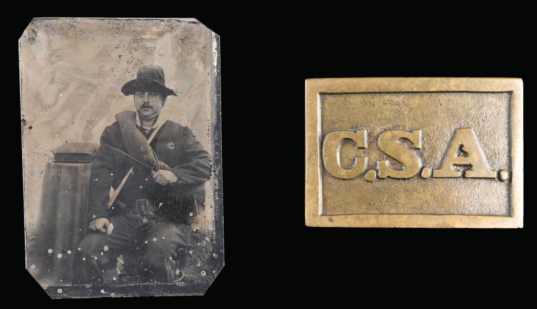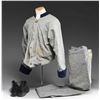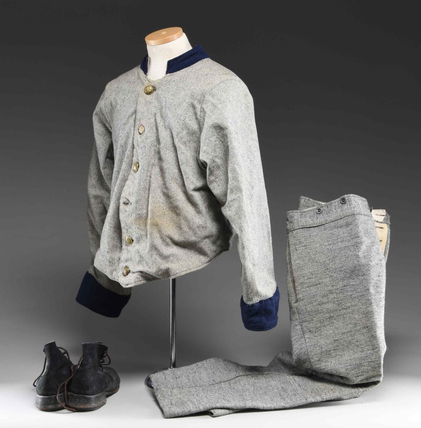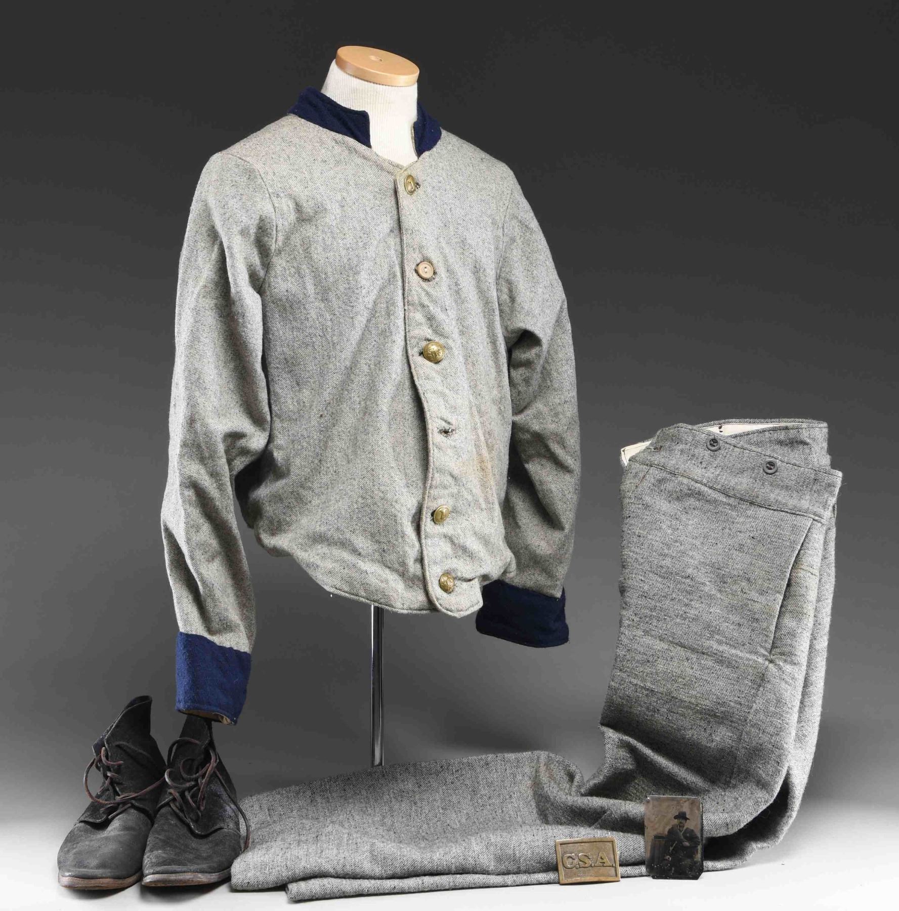 This lot consists of 1 gray Confederate reenactor's coat with blue cuffs and collar. Coat has a mixture of buttons, including 2 cast "I" buttons, 1 wooden, 1 Georgia, and 1 Yankee general service. / 1 pair of gray pants. / 1 pair of black leather boondocker-style boots. / 1 C.S.A. belt buckle. / 1 modern tintype photograph of a Georgia Confederate soldier. CONDITION: uniform shows light wear. Boots show moderate wear. Buckle and tintype show light wear. All items are of modern production. (02-24282/BF). $300-400.