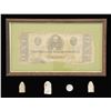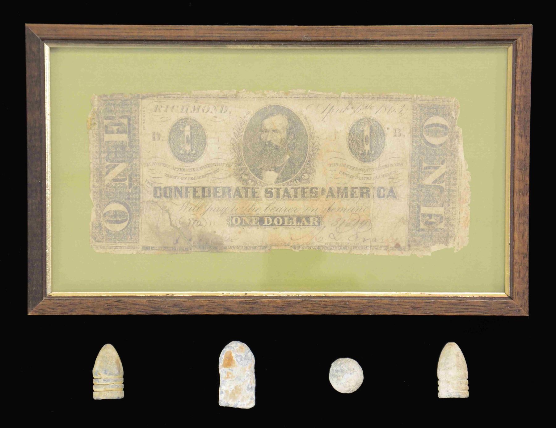 This lot includes 2 dropped 58 cal. mini balls. / 1 Round ball of 69 cal. / 1 Fired Enfield bullet. / 1 Confederate $1 bill of the 1863 series. CONDITION: mini balls are drops. Round ball and Enfield bullet are fired. $1 bill is faded, stained, and has tattered edges. (02-22737/BF). $10-20.