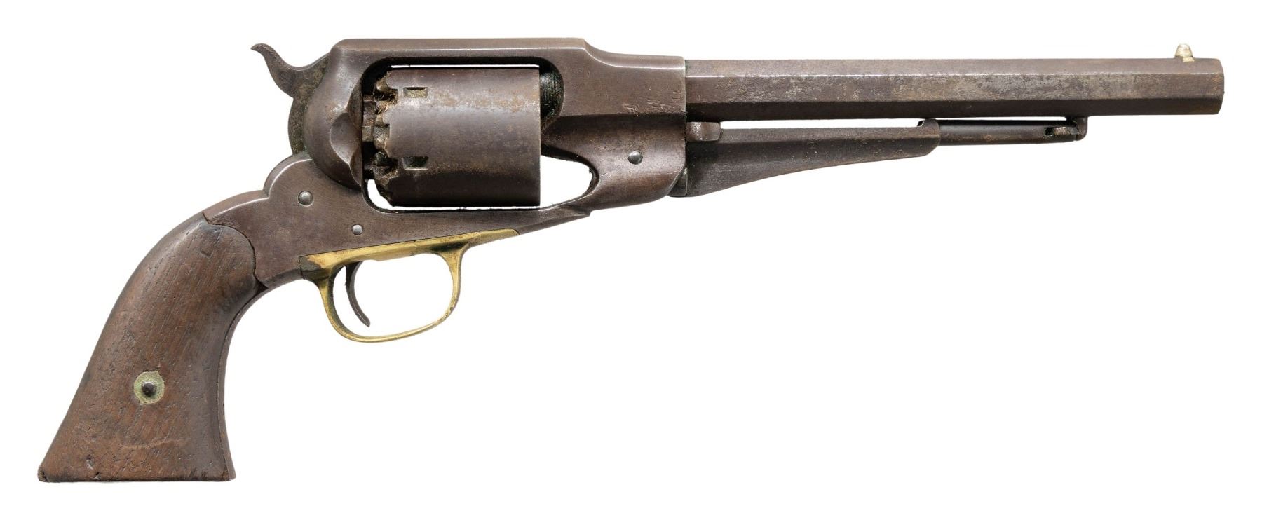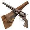 REVOLVER & HOLSTER. Cal. 44. S# S 8653. Standard configuration of Model 1861 "Old Model" Army single action percussion revolver, 8" octagonal barrel with 2-line address "PATENTED DEC 17, 1861 / MANUFACTURED BY REMINGTONS' ILION N.Y.", brass trigger guard and German silver cone front sight. Accompanying military flap holster fits well. CONDITION: good overall, cylinder has mismatched S# D 581, replaced loading leaver pivot screw and grip screw, no finish, iron patina, discernible address and sub-inspector initials "PS" on barrel & frame. Grips have no discernible inspection marks, chipped toes, moderate edge wear. Mechanically cocks, but cylinder will not lock in place, work pitted rifled bore. Holster is fair, solid & supple, no finish, missing belt loop, closure tab is torn. (01-28298/JS). ANTIQUE. $1,000-1,200.