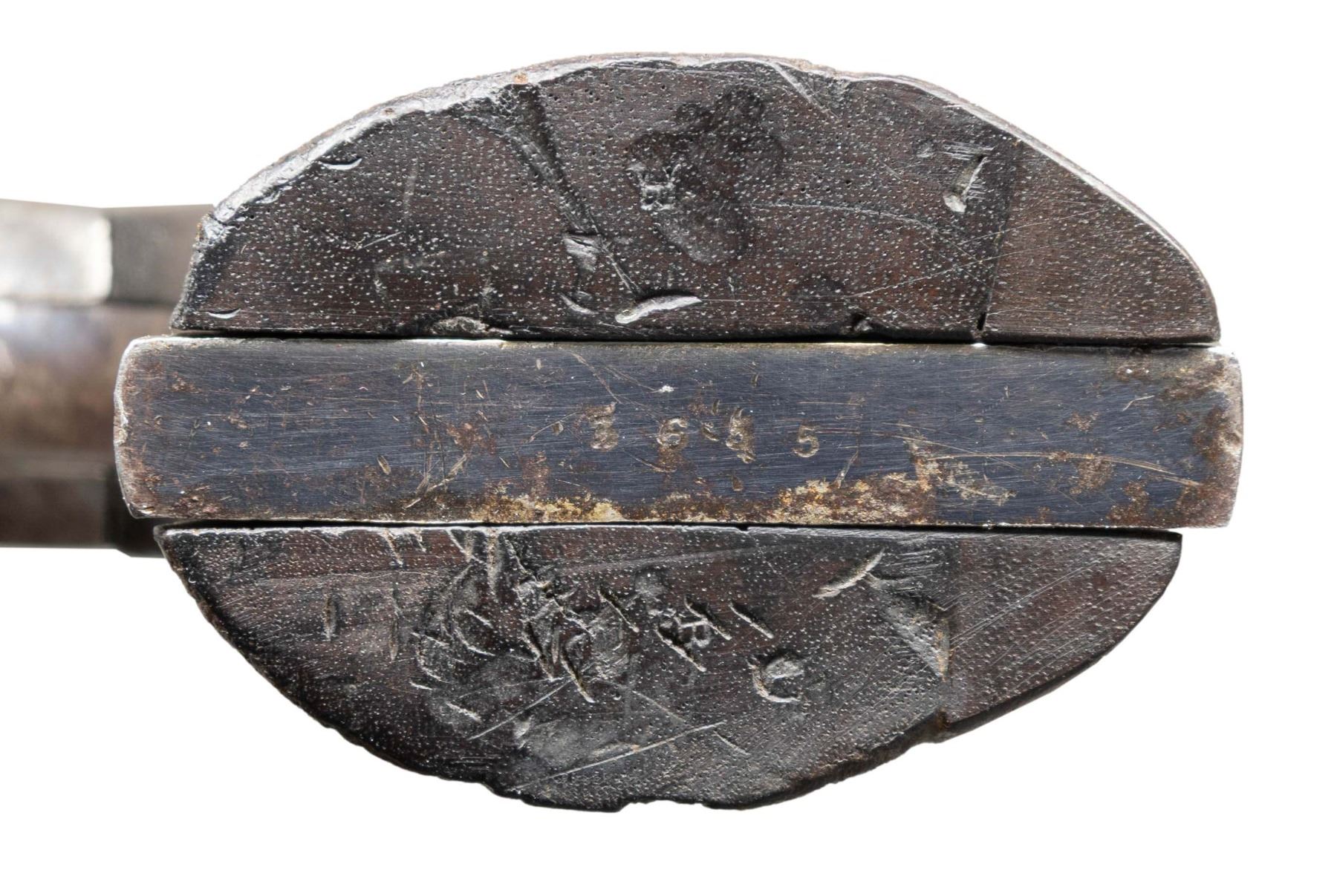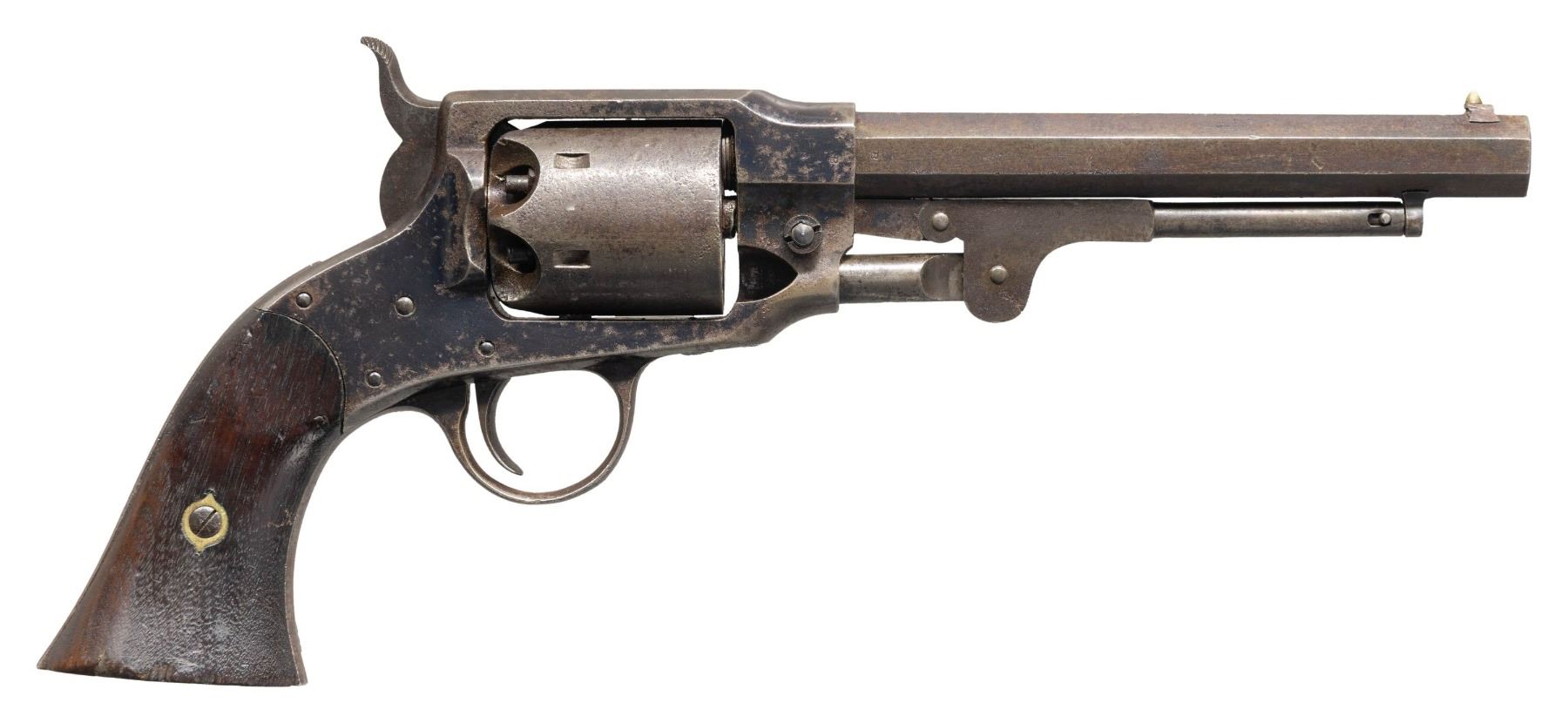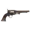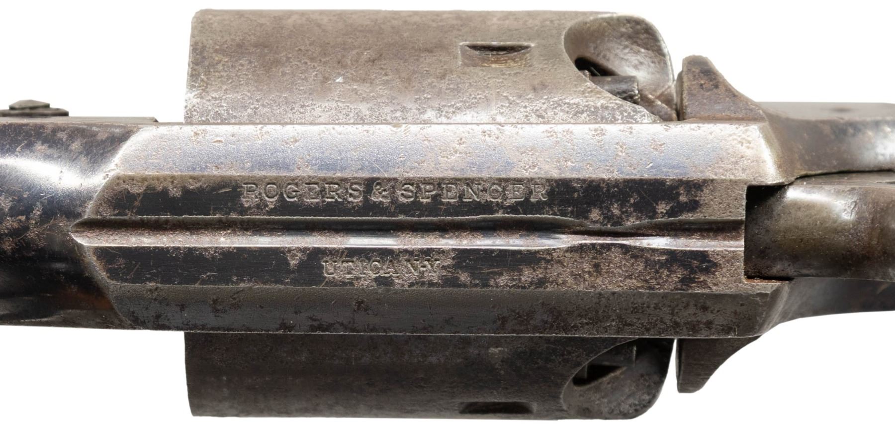 Cal. 44. S# 3655. Standard configuration, 7.5" octagonal barrel, solid frame, slotted top strap stamped: "ROGERS & SPENCER / UTICA, NY". Sharply flared grips at butt, inspector cartouched on left. CONDITION: very good overall, revolver retains about 20% blue on frame, cylinder & barrel have traces of finish with staining & pitting, grips have heavy edge wear, tacking on bottom, cartouche has discernible "RPB" (Capt. RP Barry-inspector), loading lever screw is replaced, Mechanics fine, crisp rifled bore. (01-28537/JS). ANTIQUE. $1,000-1,500.