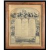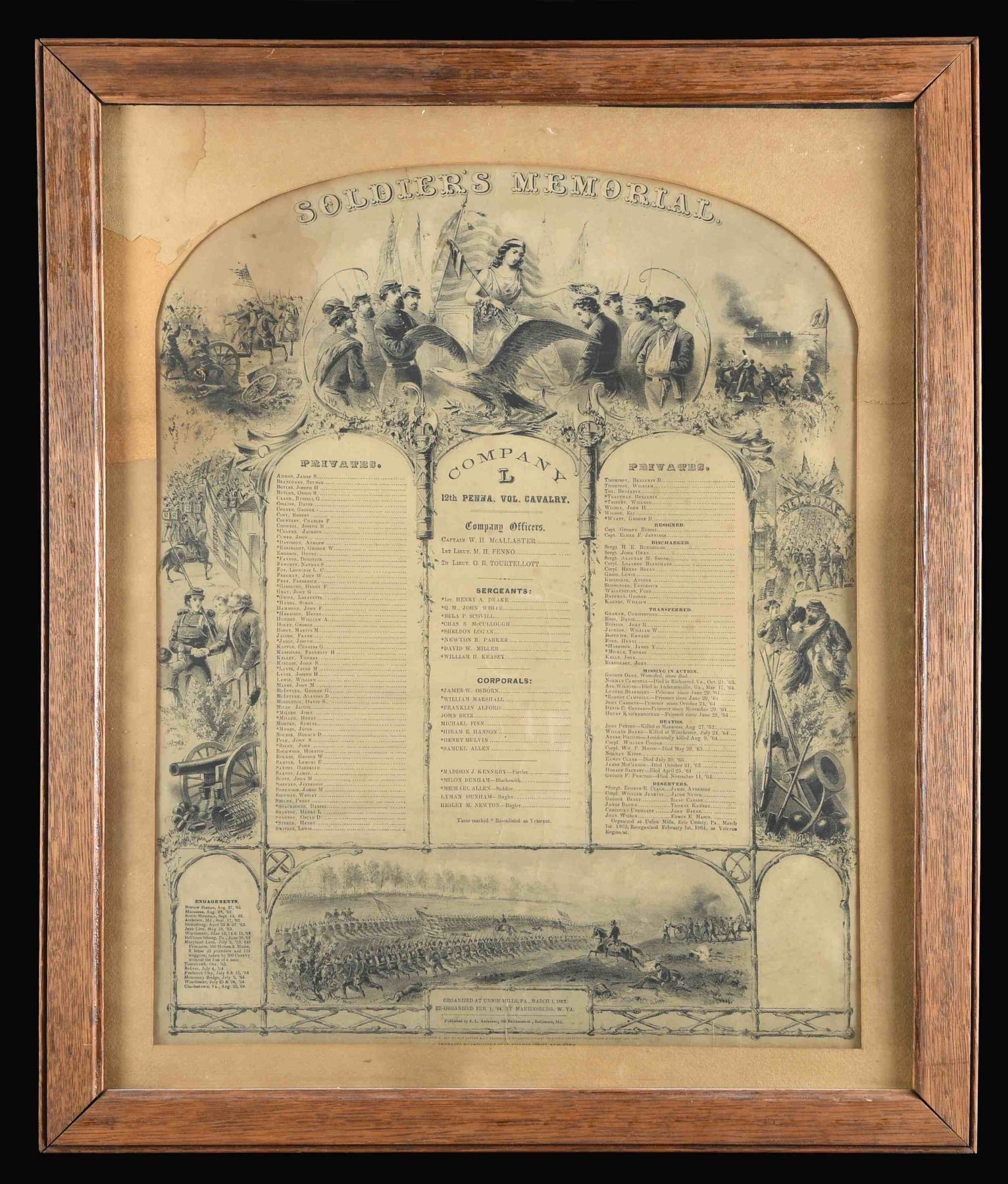 12TH PENNSYLVANIA CAVARLY. This Monochromatic memorial measures 26 1/2" x 22". It memorializes Company L of the 12th Pennsylvania Cavalry who were organized in 1861 and 1862. Their major battles included Second Manassas, Monocacy, Frederick, Antietam and all three battles of Winchester, VA. During the War, the 12th had 2 officer's and 32 men killed. They also had 1 officer and 107 men die of disease. CONDITION: the memorial has a bit of fading and water damage. The frame shows light wear. (02-24524/BF). $200-300.