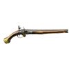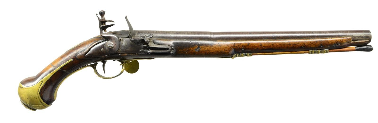 PISTOL. Cal. 54. NSN. Bbl. 13 3/4" w/ faceted transitions. Top of bbl. has a crown over Hartford marking at breech w/ U-219 on the right. Left side has 3 worn proof marks. Banana style lock marked “CLARKSON” who was a gunmaker to ordnance 1723-1728. Pin fastened walnut stock. Brass fittings consist of grotesque mask butt cap, trigger guard, engraved wrist plate, engraved side plate, faceted thimble & single faceted pipe. Replacement hardwood ramrod w/ contrasting tip. CONDITION: metal has faded brown appearance showing light pitting & wear. Dark pitted bore w/ noticeable bulge 8 1/2" from muzzle. Stock has added finish over heavy wear & handling marks. Wrist is broken & repaired, trigger guard tang is broken in the same general area. Forearm section of stock is missing large chips along the bbl. channel w/ cracks at the tip. Sound lock. (01-23047/DS). ANTIQUE. $1,500-2,000.