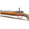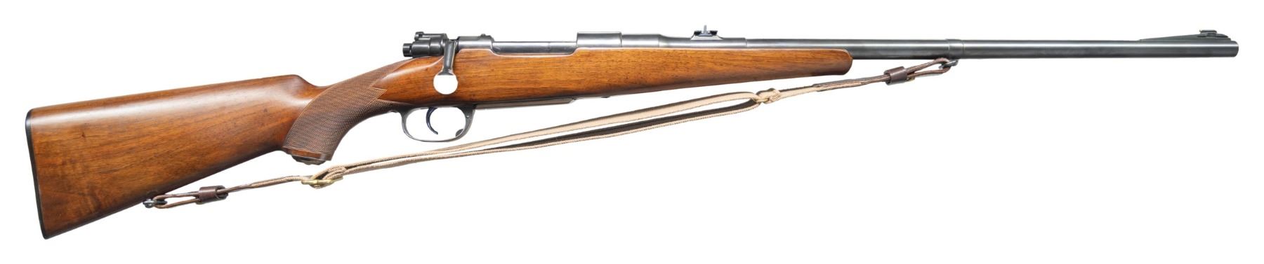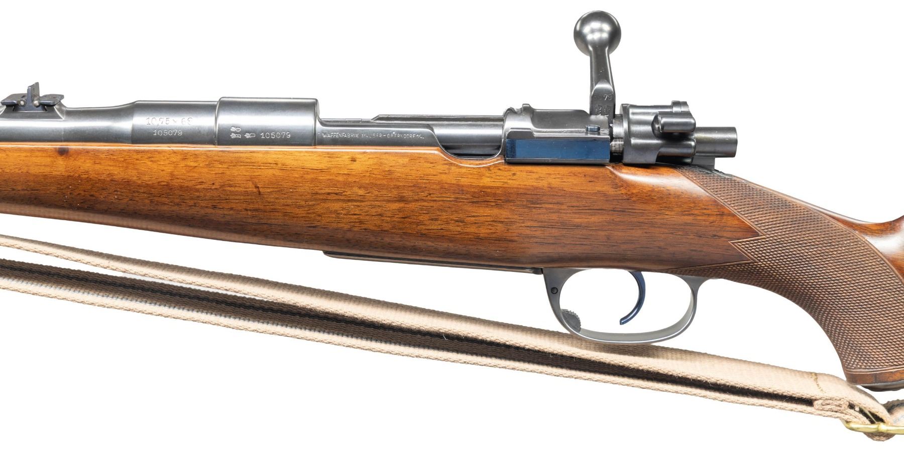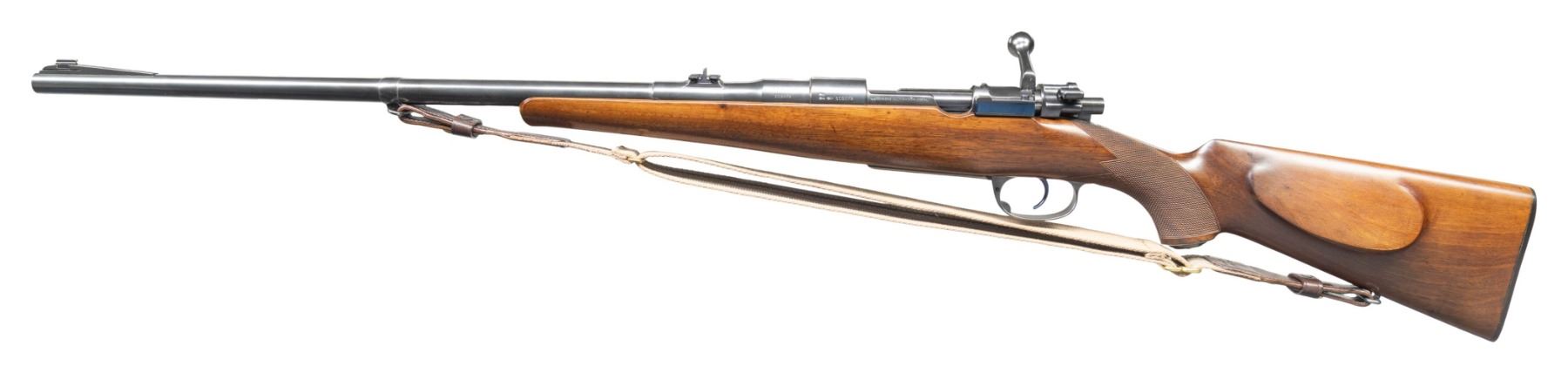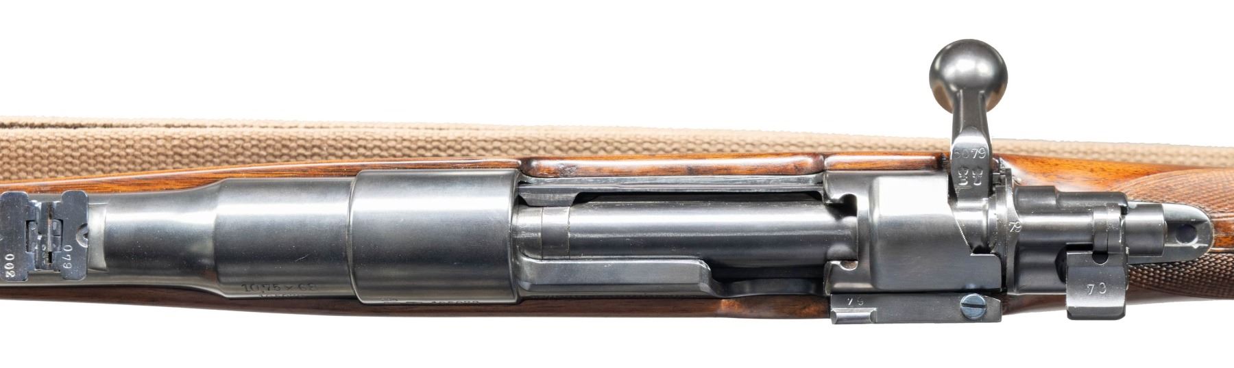SPORTING RIFLE. Cal. 10.75x68. S# 105079. Standard configuration with 24" barrel holding sleeved on base with one standing, two folding leaf rear sight, banded on sling eye and long front ramp holding gold bead. Caliber and S# are in usual place on left rear of barrel. Standard length large ring model 98 commercial Mauser action has all correctly placed markings and matching numbers. Double stage trigger is retained and bottom metal with hinged floorplate has release button in trigger guard bow. Original capped pistol grip stock measures 14-1/2" over replaced checkered buttplate and features usual Mauser style right hand cheekpiece, grip checkering and schnabled uncheckered forend. Rifle is fitted with Trader Keith leather and cotton web sling. CONDITION: very fine as completely refinished. Metal with traditional rust blue on barrel and action along with correct temper blue accents. Stock is nicely refinished; checkering is re-cut. Bore is fine with light wear. Mechanically good. PROVENANCE: From the Buckstix Collection. (25-6475/MGM). CURIO. $3,000-4,500.
