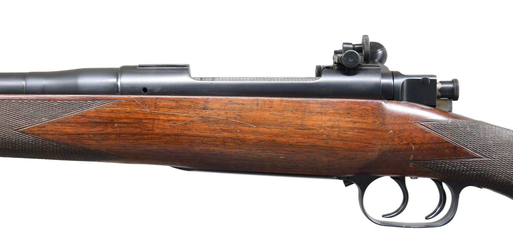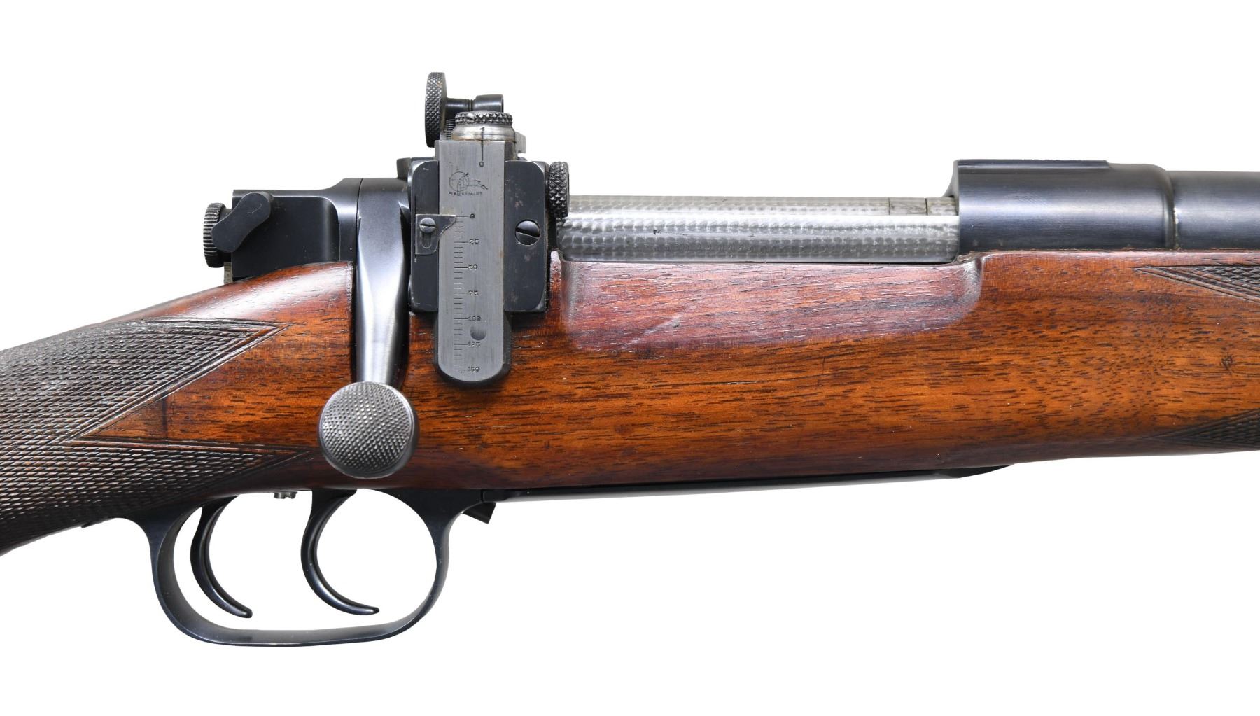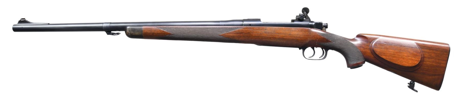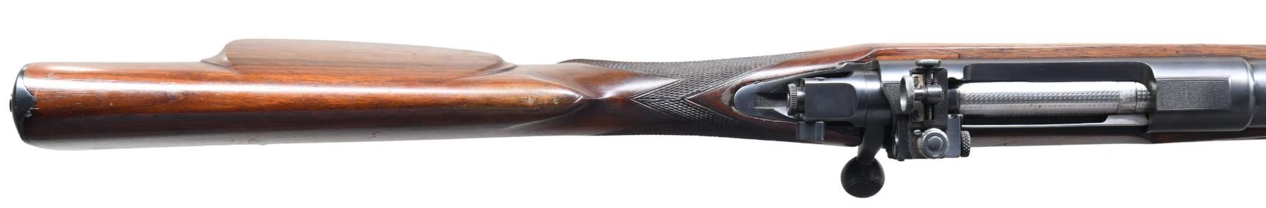 ACTION. Cal. 270 Win. (consignor states). S# 791 (found on bolt root). The 1916 Newton action incorporates the times latest technology with interrupted screw thread locking lugs, turned down bolt handle and rotating safety in bolt shroud. The early actions like this one are very nicely machined with two raised squares on receiver ring and bridge. Triggers are double set and the original rifles could be taken down with hinged floorplate acting as handle for removal of front stock bolt. This attractive rifle has been rebuilt with addition of 23-1/2" heavy tapered barrel fitted with Williams front ramp with gold bead and banded on sling eye. Action has been fitted with Lyman 48 receiver sight. Bolt body and extractor are engine turned. Bolt knob has checkered panels. This and the classically styled pistol grip stock appear to be the work of Griffin & Howe. Stock features scroll engraved pistol grip cap, M70 type steel buttplate, right hand shadow line cheekpiece, horn forend tip and well cut point pattern checkering at grip and around forend. CONDITION: very fine as mostly refinished. Metal parts retaining nearly all of a very nicely done rust re-blue. Stock retains most of what appears to be its original oil finish with many scratches and marks. Checkering is somewhat worn. There are plugged screw holes in top of barrel at center and breech end. Action has been glass bedded. Takedown feature no longer works. (25-549/MGM). CURIO. $1,500-2,000.