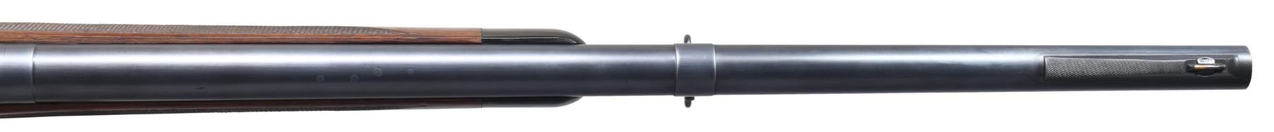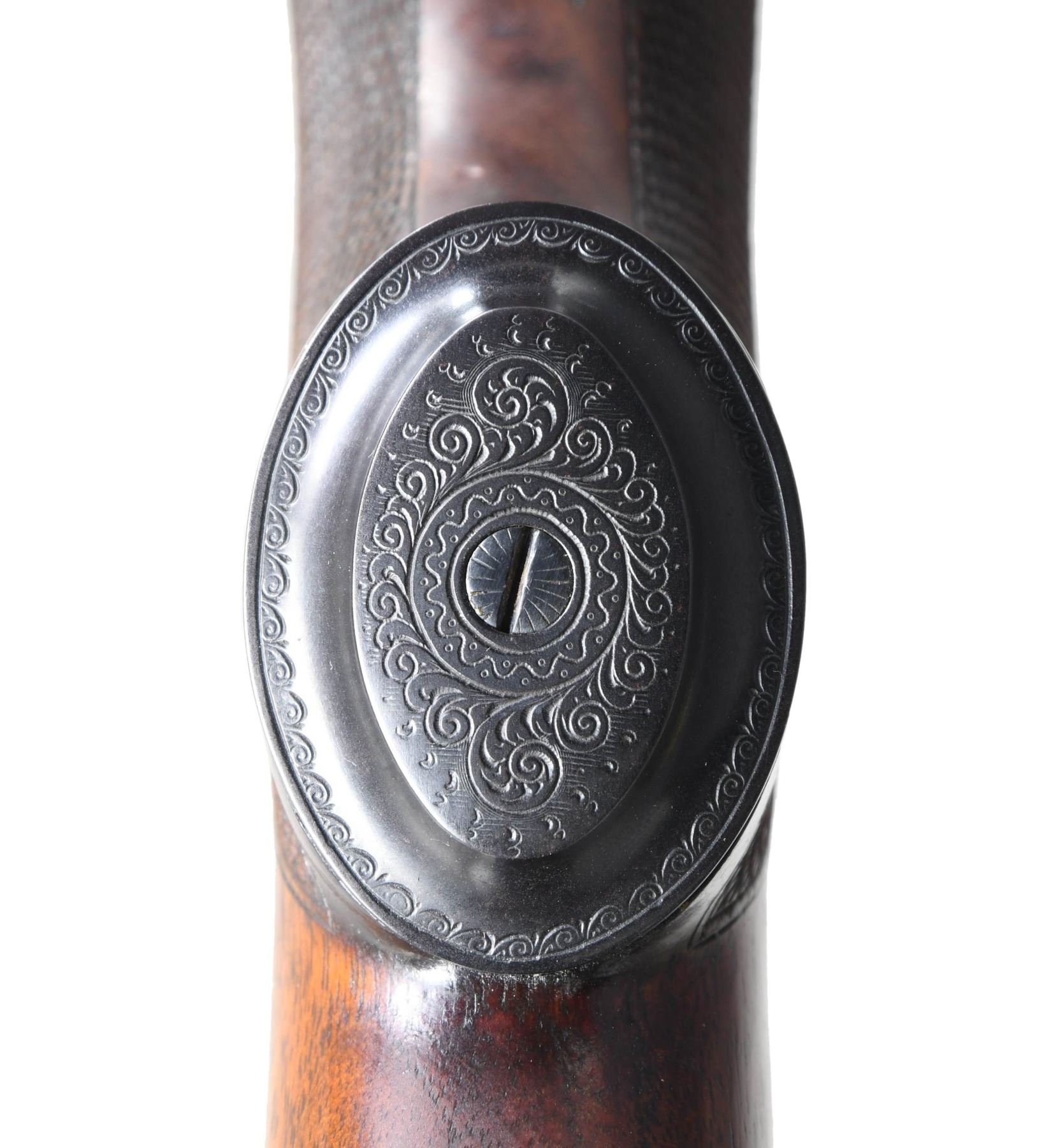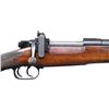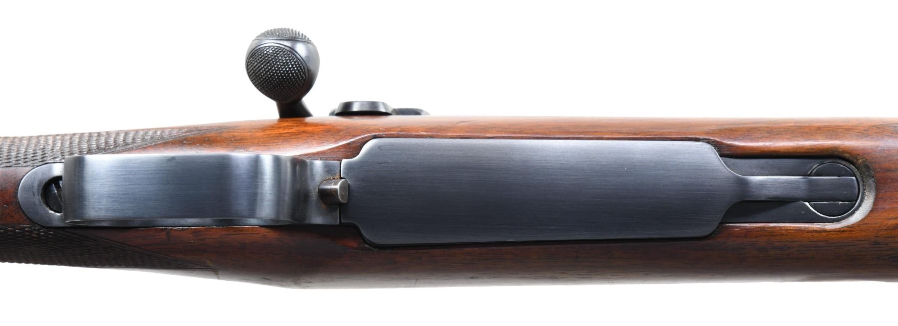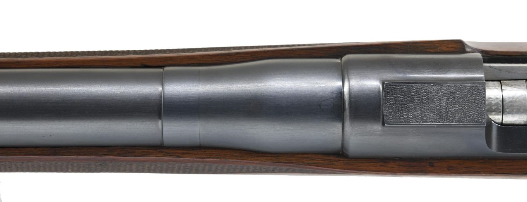 ACTION. Cal. 270 Win. (consignor states). S# 791 (found on bolt root). The 1916 Newton action incorporates the times latest technology with interrupted screw thread locking lugs, turned down bolt handle and rotating safety in bolt shroud. The early actions like this one are very nicely machined with two raised squares on receiver ring and bridge. Triggers are double set and the original rifles could be taken down with hinged floorplate acting as handle for removal of front stock bolt. This attractive rifle has been rebuilt with addition of 23-1/2" heavy tapered barrel fitted with Williams front ramp with gold bead and banded on sling eye. Action has been fitted with Lyman 48 receiver sight. Bolt body and extractor are engine turned. Bolt knob has checkered panels. This and the classically styled pistol grip stock appear to be the work of Griffin & Howe. Stock features scroll engraved pistol grip cap, M70 type steel buttplate, right hand shadow line cheekpiece, horn forend tip and well cut point pattern checkering at grip and around forend. CONDITION: very fine as mostly refinished. Metal parts retaining nearly all of a very nicely done rust re-blue. Stock retains most of what appears to be its original oil finish with many scratches and marks. Checkering is somewhat worn. There are plugged screw holes in top of barrel at center and breech end. Action has been glass bedded. Takedown feature no longer works. (25-549/MGM). CURIO. $1,500-2,000.