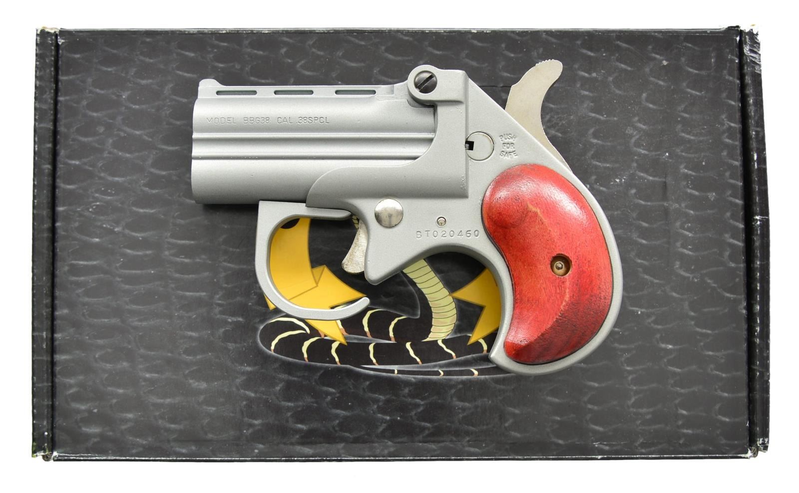 DERRINGER. Cal. 38 Spl. S# BT020460. Bbls. 2 3/4". Fixed sights. Stain finish. Crossbolt safety. Rosewood grips. UNATTACHED ACCESSORIES: box w/ lock. CONDITION: near excellent including bore. (22-5597/MD). MODERN. $75-150.