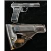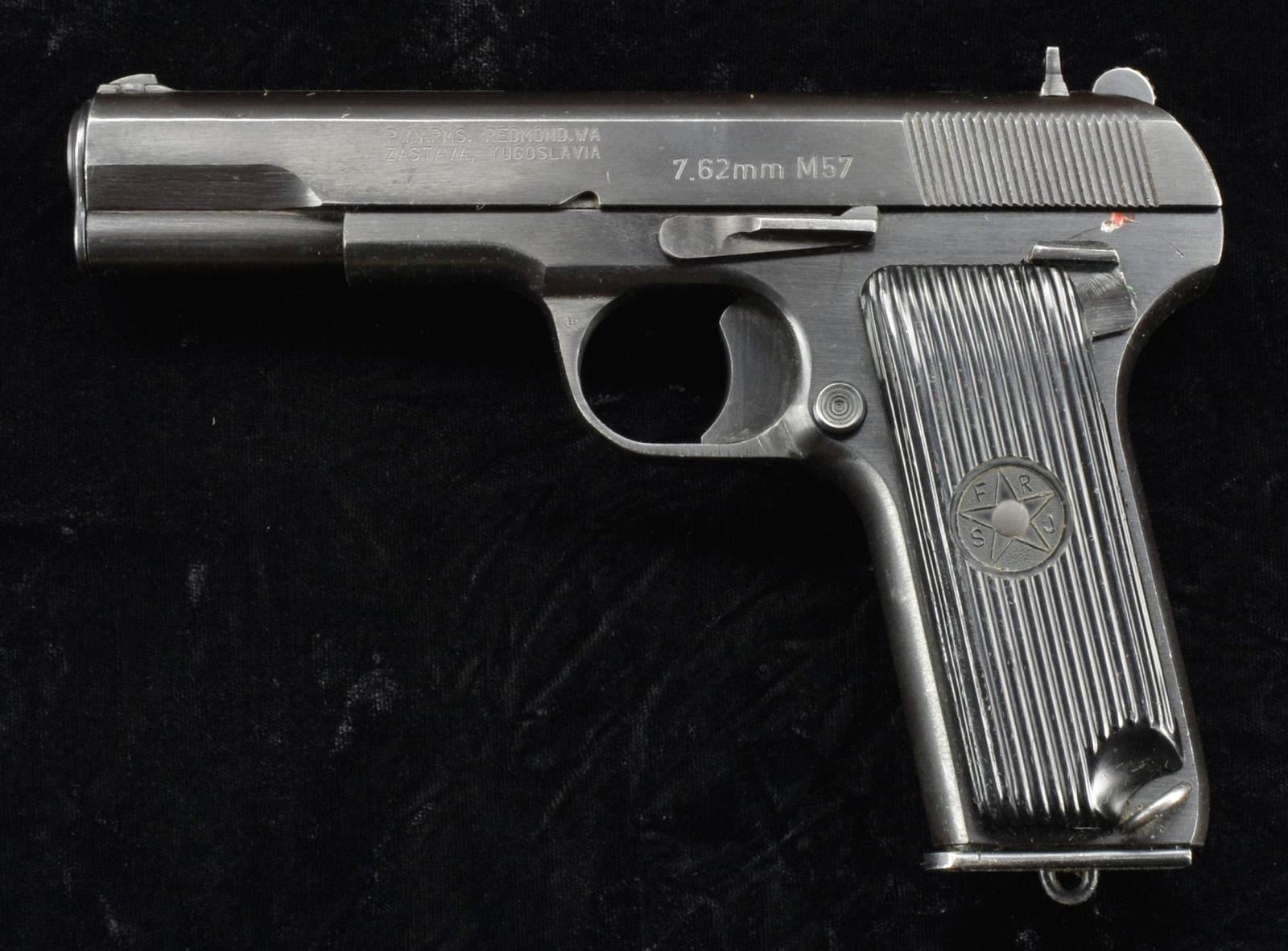 PISTOL. Cal. 7.62x25. S# O161325. Matching numbered 4.6" bbl. PW Arms import mark slide w/ Communist crest on top. Pistol is import compliant w/ added thumb safety on frame along w/ lanyard loop at butt. 2 Piece black plastic grips w/ "SFRJ" & star logo. MAGS: 2 - 9 rd. UNATTACHED ACCESSORIES: brown flap holster w/ cleaning rod. CONDITION: Very good as arsenal refinished. Very good bore. (22-773/MD). MODERN. $200-400.