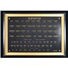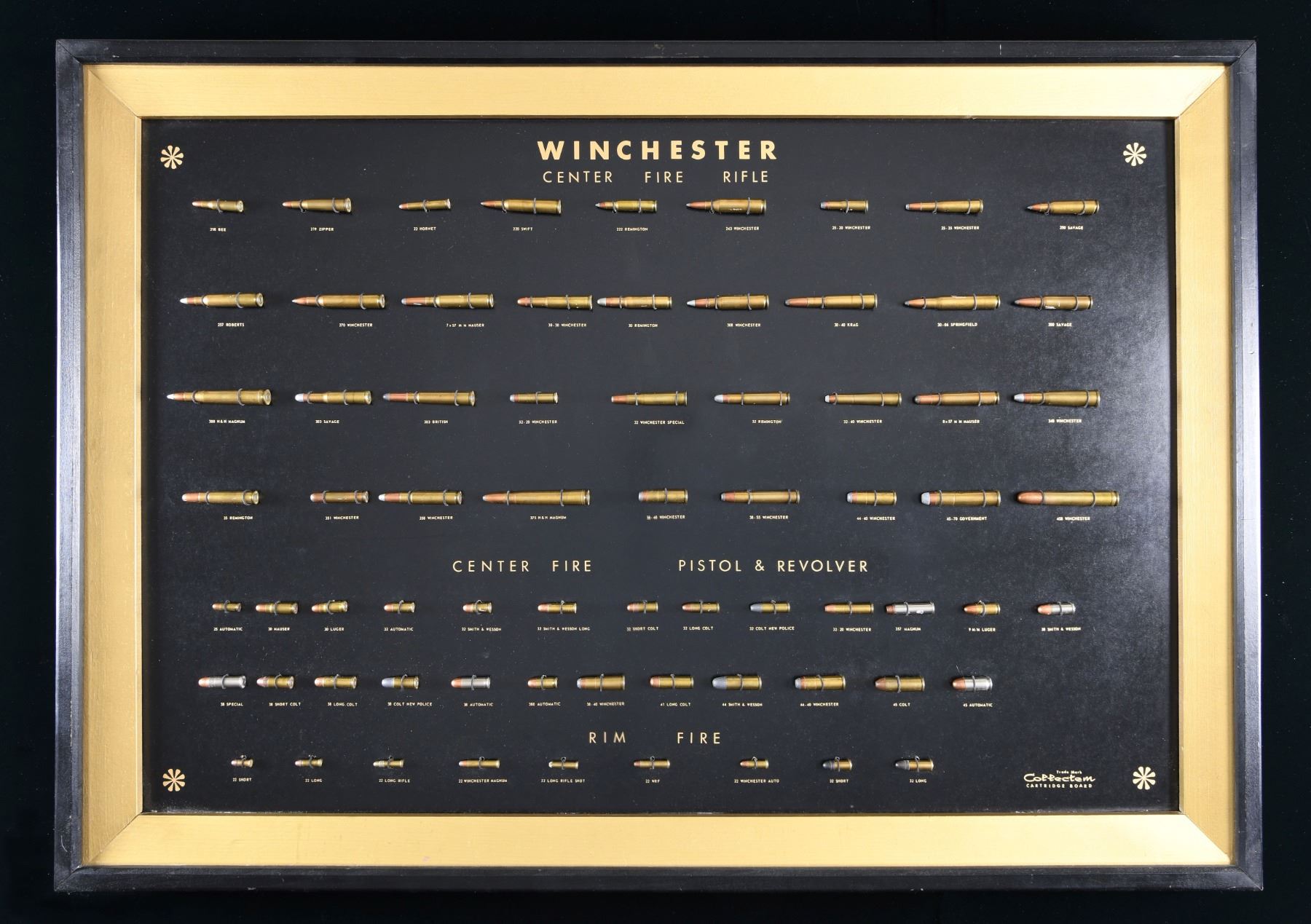 PISTOL CARTRIDGES. Attractive black & gold cartridge board displaying Winchester ammunition. Board includes 36 center fire cartridges, ranging in size from 218 Bee to 458 Mag. Center fire pistol & revolver cartridges include 25 cartridges ranging from 25 ACP to 45 Automatic. Rimfire cals. include 9 cartridges ranging from 22 Short to 32 Long. Image size is 35" by 23". Board is displayed in a wooden black & gold colored frame. Frame size is 39 3/4" by 27 3/4". Lower right corner has manufacturer's identification "Trade Mark / Collectem / Cartridge Board". CONDITION: very good condition w/ all cartridges present. Frame shows a few small handling marks. (02-23973/DS). NON-GUN. $600-1,000.