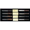 KNIVES. 1) USMC MK2 FIGHTING KNIFE. Overall length: 12". 7" Parkerized blade marked “U.S.M.C.” on 1 side & “KA-BAR” on the other. Steel crossguard & pommel. Stacked leather washer grip. Original leather sheath w/ 9 black rivets. CONDITION: very good to fine overall. 2) USMC MK2 FIGHTING KNIFE. Overall length: 12". 7" Parkerized blade marked “USMC” on 1 side & “KA-BAR OLEAN, N.Y.” on the other. Steel crossguard & pommel. Stacked leather washer grip. Leather sheath. CONDITION: knife shows moderate wear overall, sharp & sheath shows heavy wear, replaced snap closure. 3) USMC MK2 FIGHTING KNIFE. Overall length: 13". 7" Blade marked “USMC” on 1 side & “PAL” on the other. Steel crossguard & pommel. Stacked leather washer grip. Leather sheath. CONDITION: very good overall, gray blade w/ sharpening. 4) USMC MK2 FIGHTING KNIFE. Overall length: 12". 7" Parkerized blade unmarked. marked, Steel crossguard marked “USN / MK2” and “R.C.C.” for Robeson Cutlery Co. Stacked leather washer grip. Leather sheath. CONDITION: knife & sheath are fine overall. 5) USMC MK2 FIGHTING KNIFE. Overall length: 12". 7" Parkerized blade unmarked. Steel crossguard marked “USN / MK2” & “R.C.C.” for Robeson Cutlery Co. Stacked leather washer grip. Leather sheath marked “USN”. CONDITION: knife & sheath are very good to fine overall. 6) USN MK2 FIGHTING KNIFE. Overall length: 12". 7" Parkerized blade marked “USMC” on 1 side & “KA-BAR” on the other. Steel crossguard & pommel. Stacked leather washer grip. Leather sheath. CONDITION: good to very good overall. 7) USMC MK2 FIGHTING KNIFE. Overall length: 12". 7" Parkerized blade marked “U.S.M.C.” on 1 side & “KA-BAR” on the other. Steel crossguard & pommel. Stacked leather washer grip. Leather sheath marked “USN”. CONDITION: very good overall. 8) USMC MK2 FIGHTING KNIFE. Overall length: 13". 7" blade marked “USMC” on 1 side & “PAL” on the other. Steel crossguard & pommel. Stacked leather washer grip. Leather sheath. UNATTACHED ACCESSORIES: 4 of these knives have hand drawn descriptive cards. CONDITION: very good overall, gray blade w/ sharpening. PROVENANCE: Collection of Roger Ballard. (02-15157/JS). $1,000-1,500.
