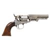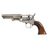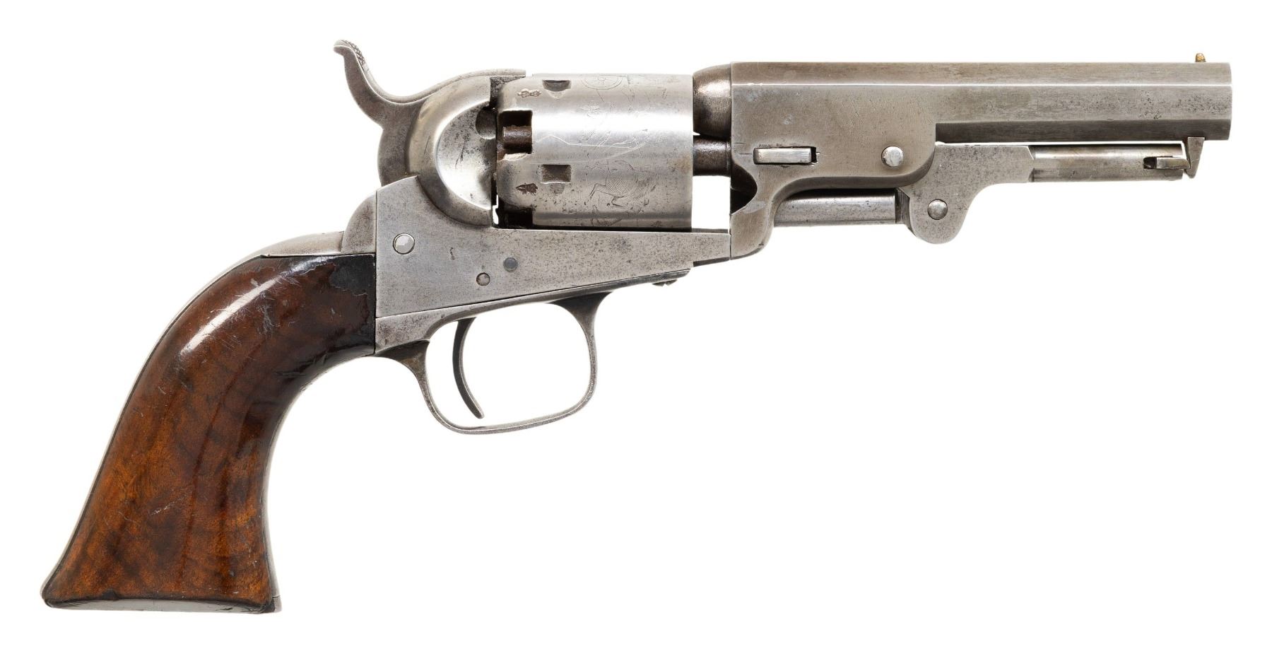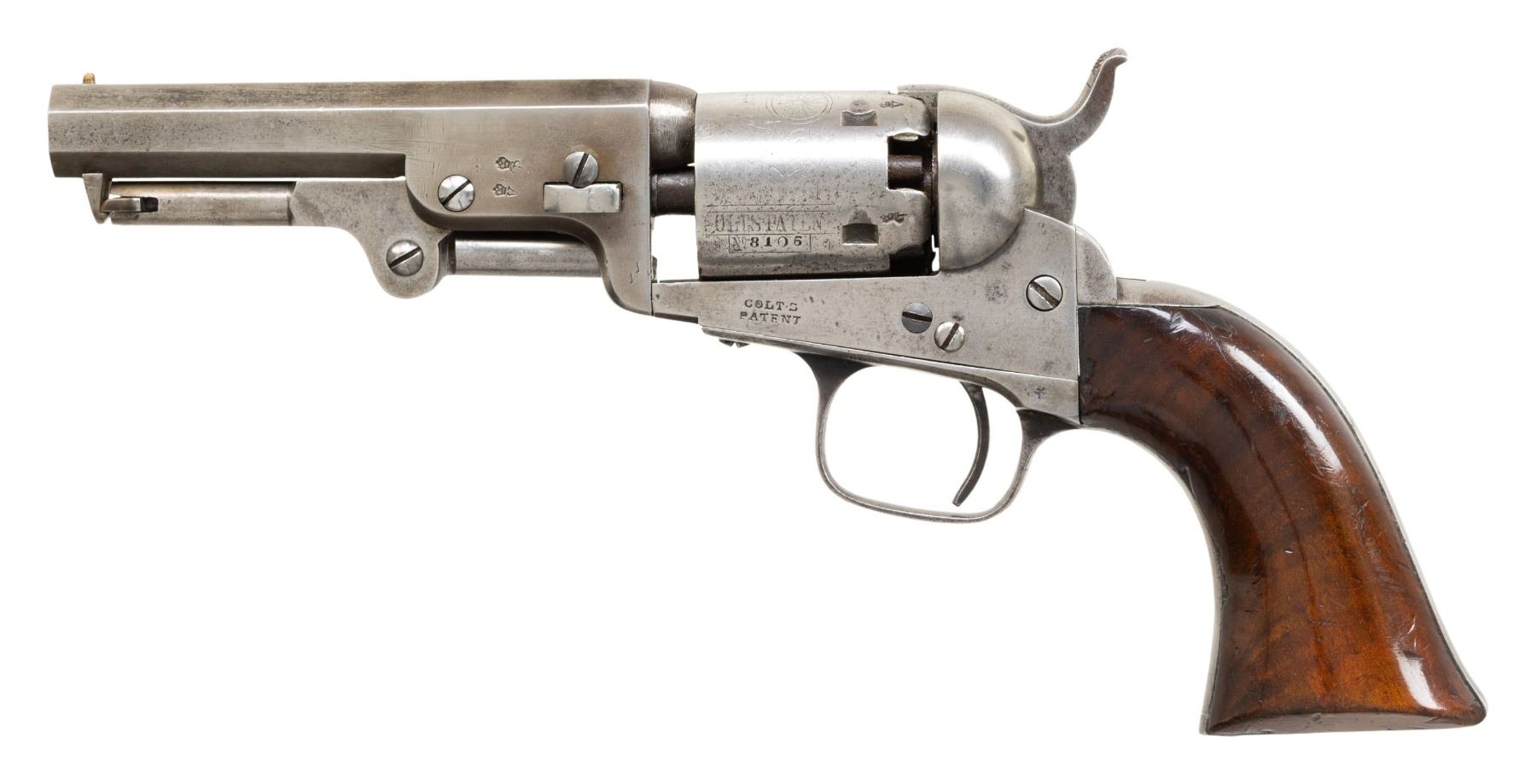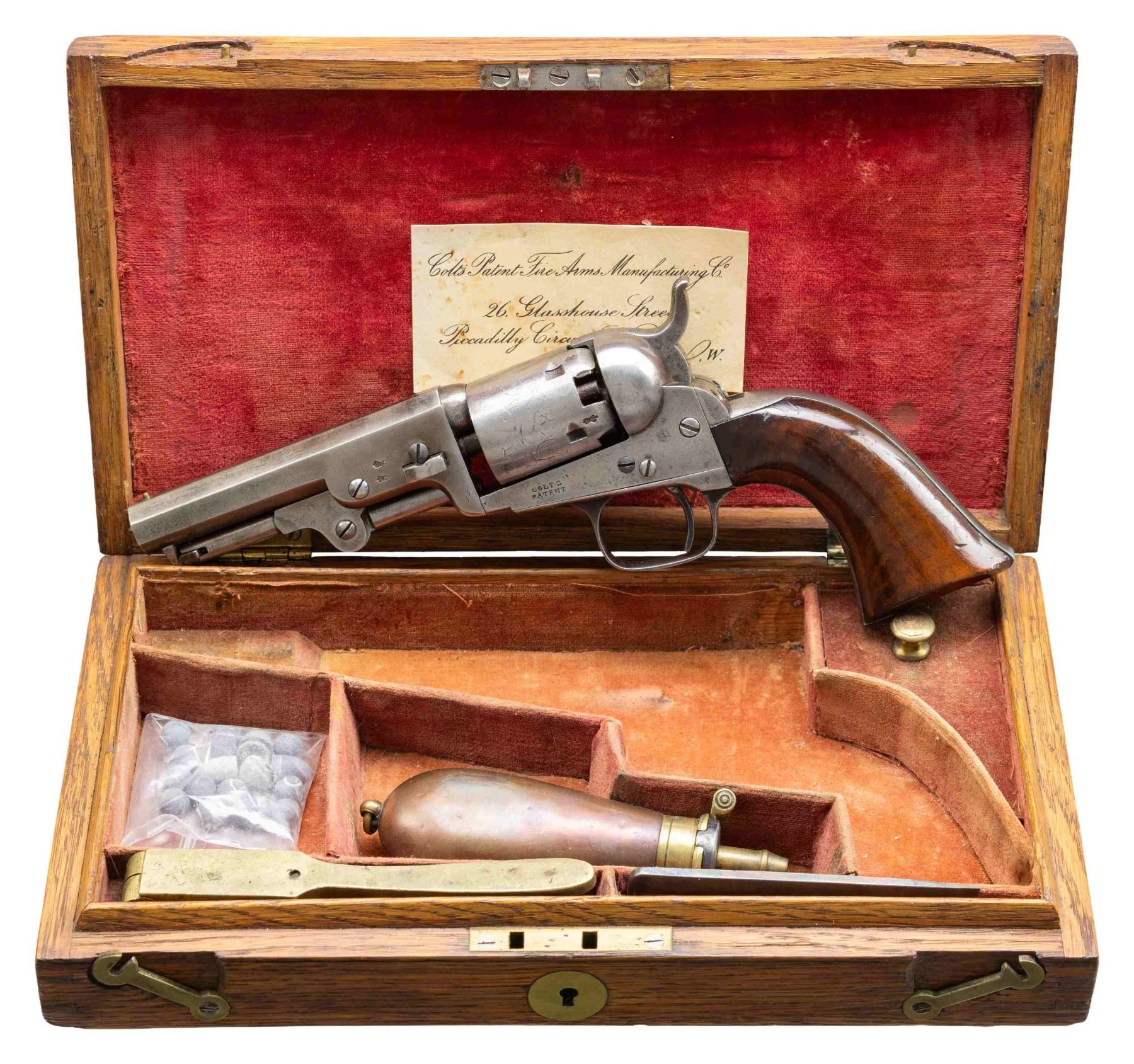 Cal. 31. S# 8106. Bbl 4" oct with London address and steel bead. Left bbl flat and cyl have British proofs. 5-shot round cyl with stagecoach scene roll engraving. Frame, bbl, grip straps, cyl, loading lever and wedge have matching numbers. 1-pc walnut grip. Mfg. 1855. UNATTACHED ACCESSORIES: wood case with red velour interior. Inside of case lid has Colt label with London address. Case contains powder flask, two cavity bullet mold, nipple wrench, cap tin along with a few bullets and round balls. Case interior shows fading and wear. CONDITION: metal has faded to gray. Cyl retains 50% lightly visible scene. Grips have lightly worn finish showing scratches and marks with small chips at toe and heel. Some action screws are replacement. Sound action. Bore retains sound rifling showing small spots of very light pitting. (01-28513/DS). ANTIQUE. $1,500-2,000.