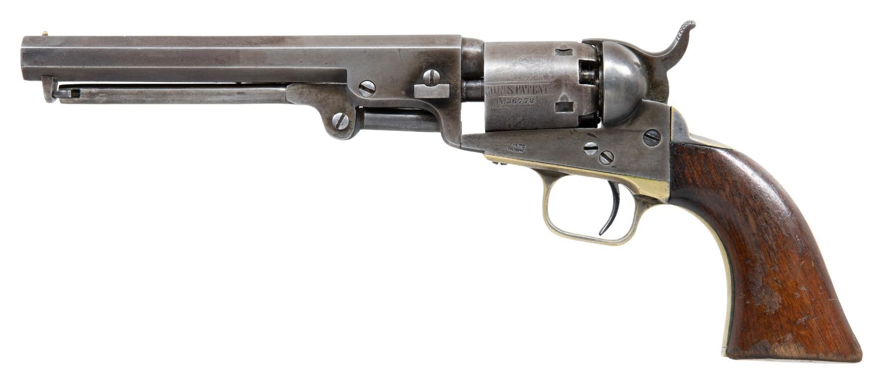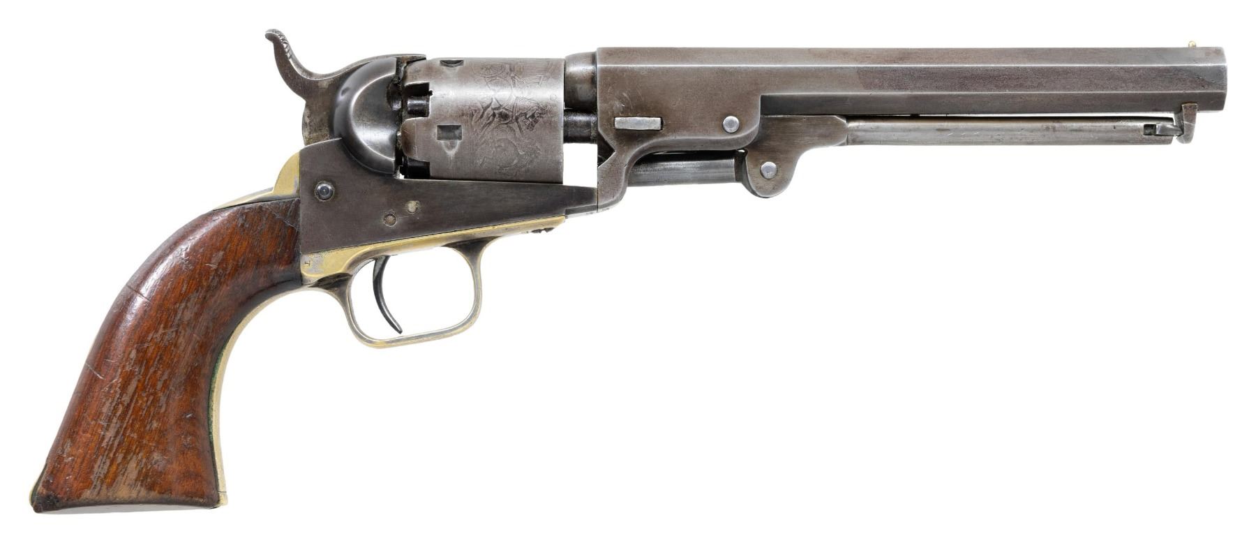 Cal. 31. S# 36778. Bbl. 6" octagon with New York address and cone type brass front sight. 5-shot rnd. cyl. with stagecoach scene roll engraving. Bbl., frame, grip straps, cyl., loading lever, and wedge have matching S#s. Blue and case colored finish with silver finish small brass trigger guard and backstrap. 1-piece walnut grip. Mfg. 1853. CONDITION: metal has faded to gray. Grip straps show small amounts of silver finish. Cyl. has lightly worn scene. Grips have worn finish showing scratches and marks. Functioning action. Bore retains sound rifling showing small spots of very light pitting. (01-26672/DS). ANTIQUE. $1,000-1,500.