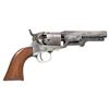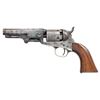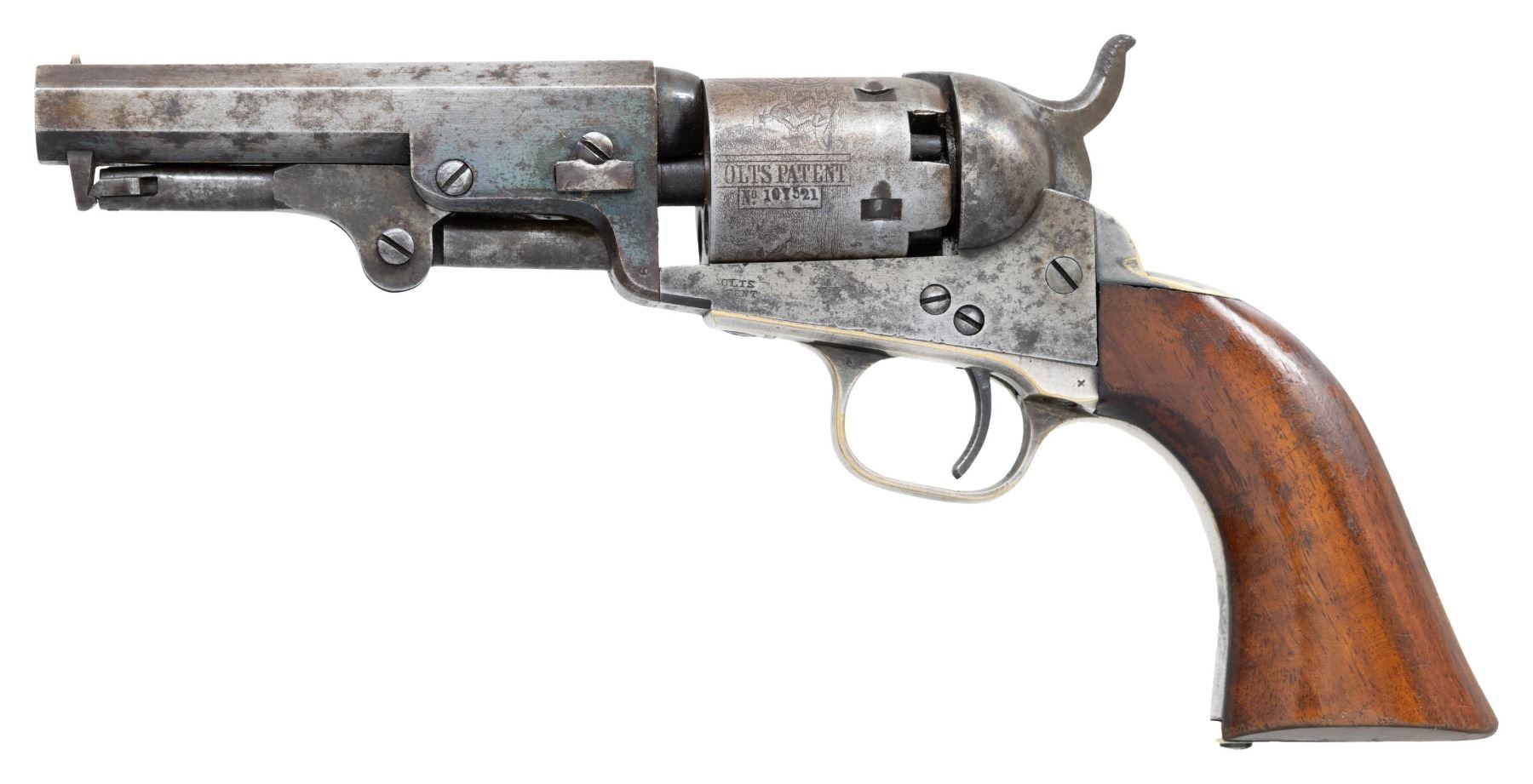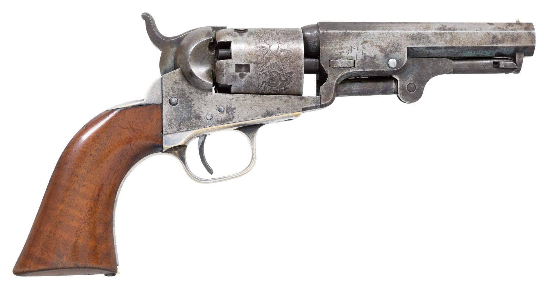 Cal. 31. S# 107521. Bbl. 4" octagon with New York address and brass cone type front sight. 5-shot rnd. cyl. with stagecoach scene roll engraving. Bbl., frame, grip straps, loading lever, and wedge have matching numbers. Blue and case colored finish with silver finished small brass trigger guard and backstrap. 1-piece walnut grip. Mfg. 1862. CONDITION: bbl. and action have faded to gray showing scattered light pitting. Grip straps retain 80% silver finish showing spots of dark tarnish. Cyl. retains very good scene. Grip has lightly worn finish showing scratches and marks. Cyl. fails to rotate properly when action is cycled. Lightly pitted bore retains sound rifling. (01-26671/DS). ANTIQUE. $800-1,200.