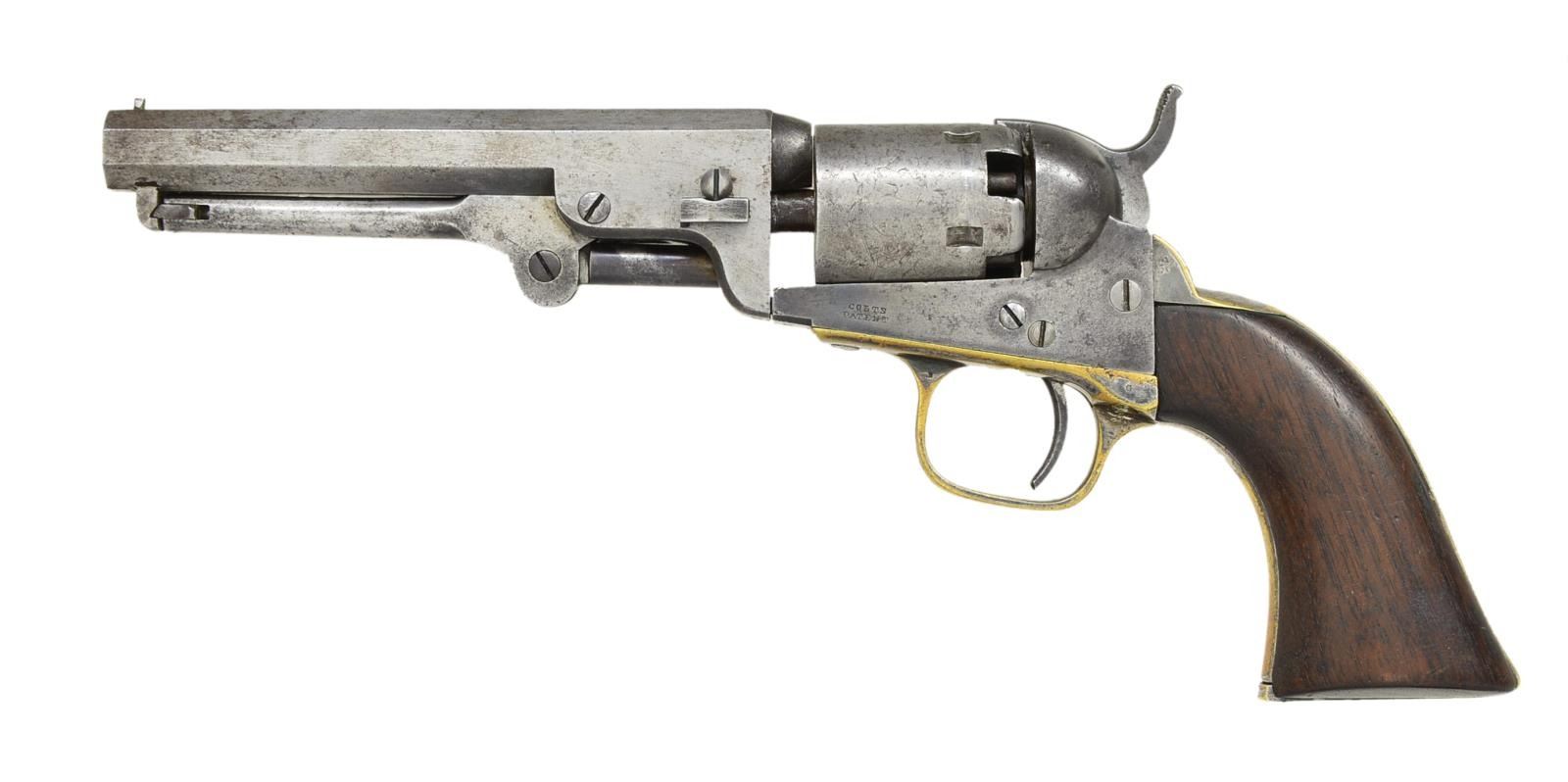 Cal. 31. S# 187483. Bbl. 5" oct. w/ New York address. 5 Shot rnd. cyl. w/ stage coach scene roll engraving. Silver finished brass trigger guard & back strap. 1 Piece walnut grip. Frame, cyl, & bbl. have matching numbers. Trigger guard & back strap have non matching "201415". Rear left side of trigger guard has "G" inspection mark at rear corner & "J" inspection mark on front left side bow. 1861 Mfg. CONDITION: metal has cleaned gray appearance w/ scattered spots of light pitting. Right front corner of frame shows coloring from heat. Grip straps retain 20% silver finish. Heavily sanded & refinished grips have dark appearance w/ sm. handling marks. Front sight is replacement. Bore is lightly pitted & retains sound rifling. (01-19116/DS). ANTIQUE. $600-800.