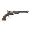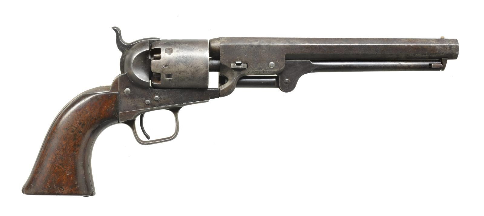Cal. 36. S# 37518. Bbl. 7 1/2" oct. w/ brass bead front sight. Top flat marked "ADDRESS COL. COLT LONDON". 6 Shot roll engraved cyl. Cyl. & bbl. have British proofs. Iron trigger guard. 1 Piece walnut grip. Bbl., frame, grip straps, cyl. & wedge have matching numbers. CONDITION: metal has dark patina appearance w/ scattered spots of pitting. Cyl. retains 30% naval scene engraving. Grips have dark appearance w/ spots of worn finish having sm. dents & chips at toe. Wedge screw & some action screws are replacements. Dark lightly pitted bore. (01-18315/DS). ANTIQUE. $700-1,100.