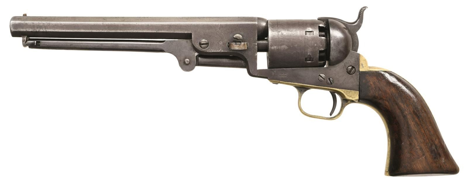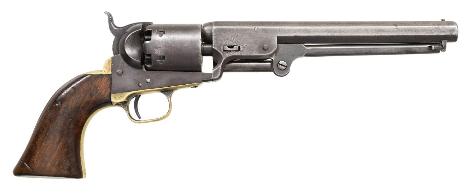 Cal. 36. S#. 14026. Bbl. 7 1/2" octagon with New York address & bead front sight. Round 6 shot roll engraved cyl. with naval scene roll engraving. Brass grips straps with small trigger guard. 1 piece walnut grip. 1852 mfg. CONDITION: Metal has a worn gray appearnce with small dents around wedge area and rounding at the muzzle. Brass has spots of tarnished silver in protected areas. Refinished grips show heavy wear with dents having small chips at toe. Action exhibits wear. Bbl. is loose on spindle. Lightly pitted bore has intact rifling. PROVENANCE: From the Lifelong Collection of Glen E. Mattox. (01-22381/DS). ANTIQUE. $1200-1800.