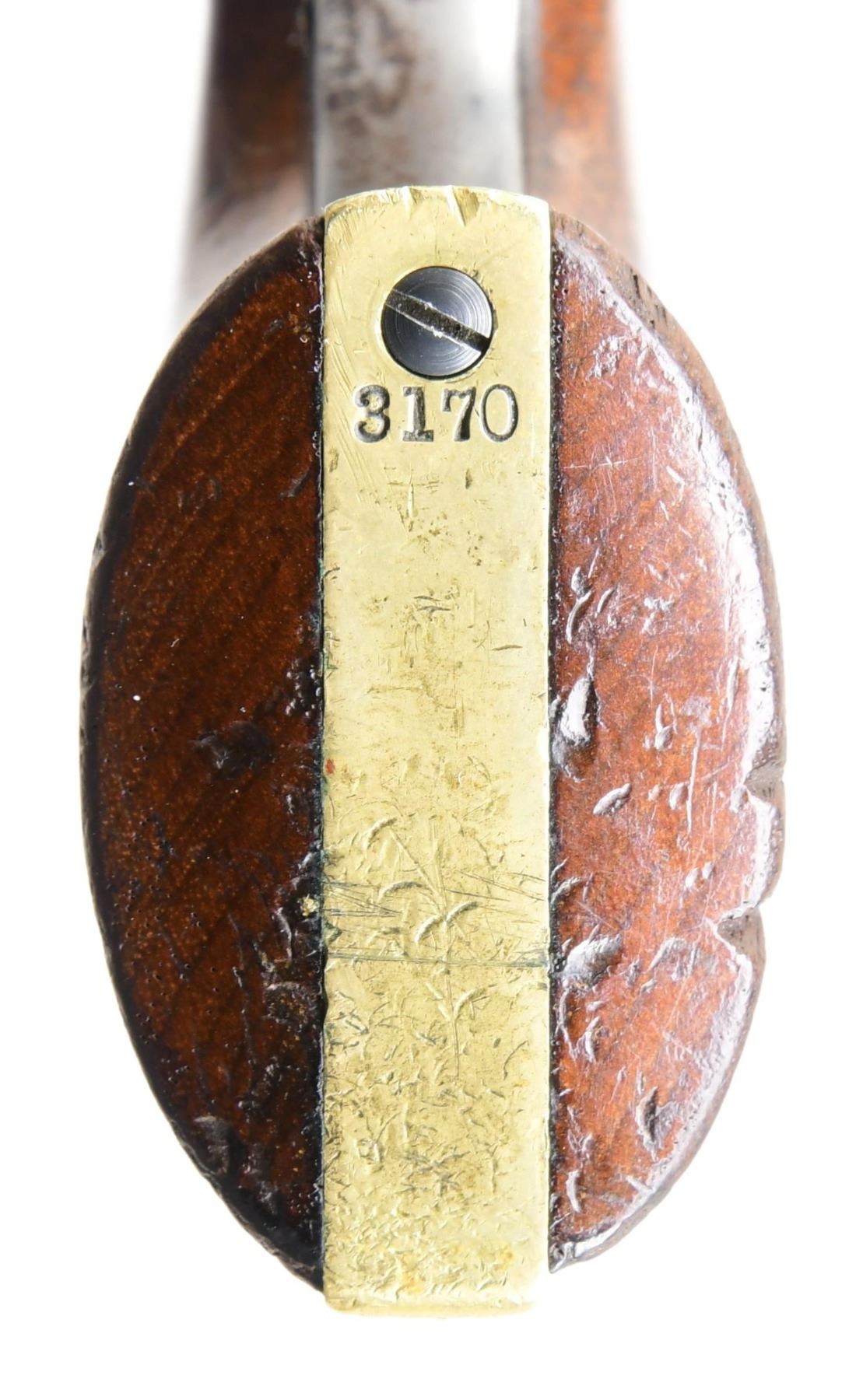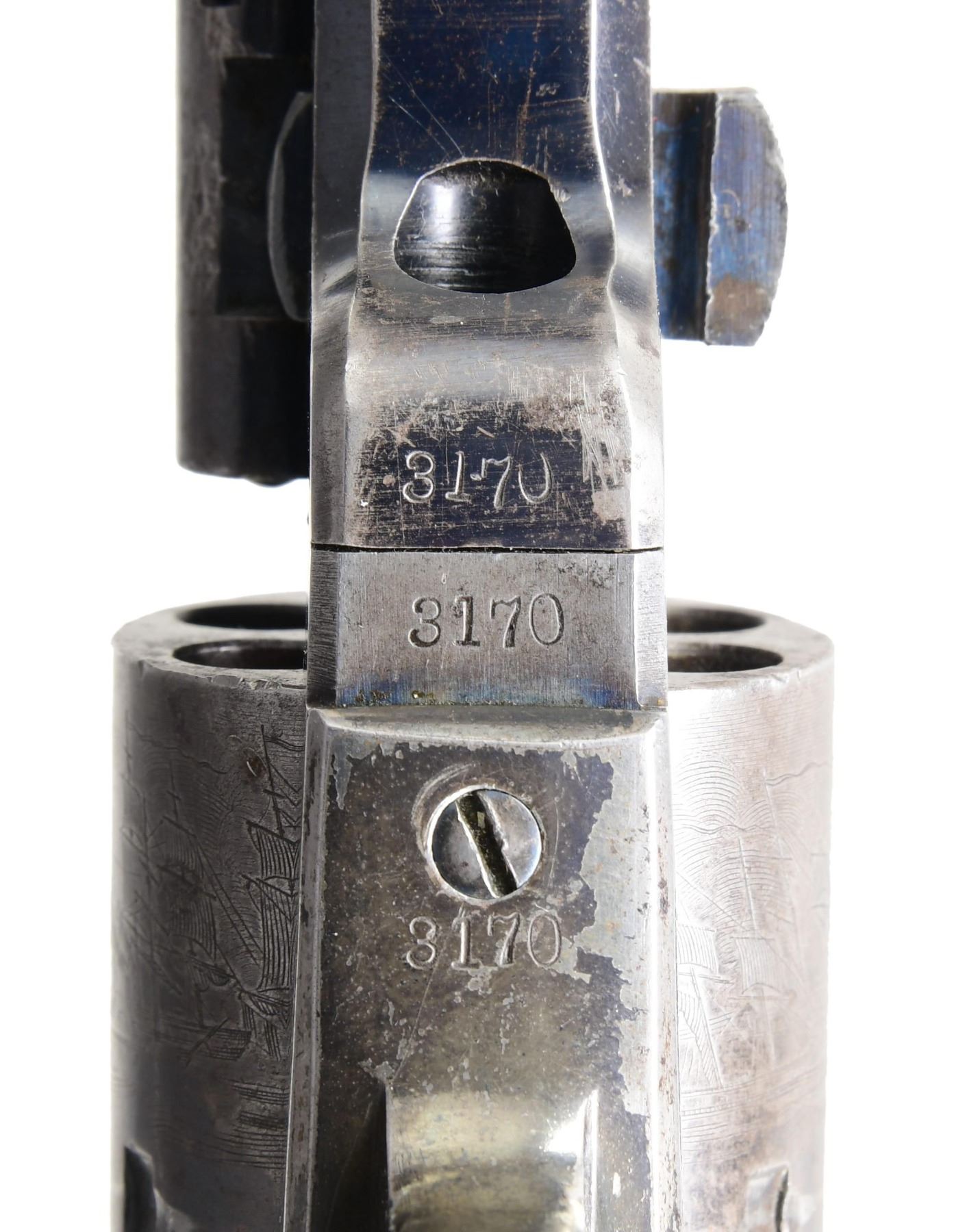 Cal. 38 RF. S# 3170. Bbl. 7 1/2" octagon w/ New York address & brass sight. Right side mounted ejector. Six shot round cyl. w/ naval scene engraving. Blue finish w/ case colored frame & brass backstrap. Backstrap has a hand checkered panel near the top of the grips. 1 piece walnut grips. Left panel has hand-carved initials "JDS". Right panel has carving in shape of a triangle. Total of about 3,800 converted in the mid 1870s. CONDITION: bbl. retains 60% blue showing carry wear w/ spots of corrosion. Cyl., ejector & trigger guard have fading blue. Frame retains 30% lightly visible case colors on sides. Cyl. retains good scene. Grips show heavy wear w/ dents & handling marks. Tight action. Bore retains sound rifling. (01-25538/DS). ANTIQUE. $4,000-6,000.