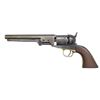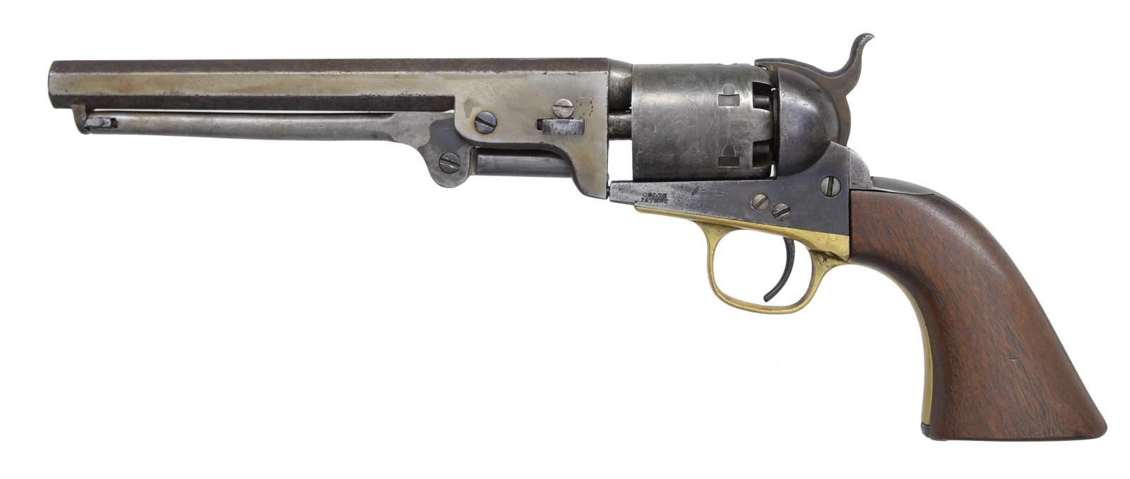 Cal. 36. S# 119148. Bbl. 7 1/2" w/ New York address. 6 Shot rnd. roll engraved Italian replacement cyl. Brass trigger guard. 1 Piece walnut replacement grip. Bbl., frame, & trigger guard have matching numbers. Replacement back strap renumbered to match. Loading lever have number "8908". Replacement cyl. & wedge have non matching numbers. 1862 Mfg. CONDITION: bbl. shows filing marks on all the left & lower flats. Action has mottled patina appearance. Cyl. has cold blue finish. Trigger guard shows polishing showing numerous dents & marks. Grips show handling marks. Wedge screw & some action screws appear to be replacement. Functioning action. Dark lightly pitted bore. PROVENANCE: Collection of Alan Bradley Shepherd. (01-18661/DS). ANTIQUE. $500-700.