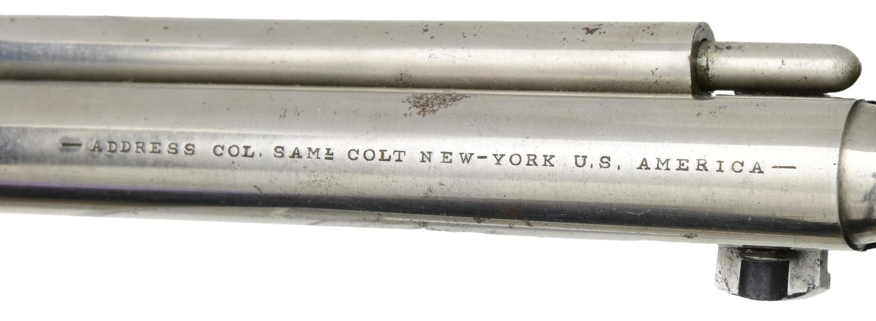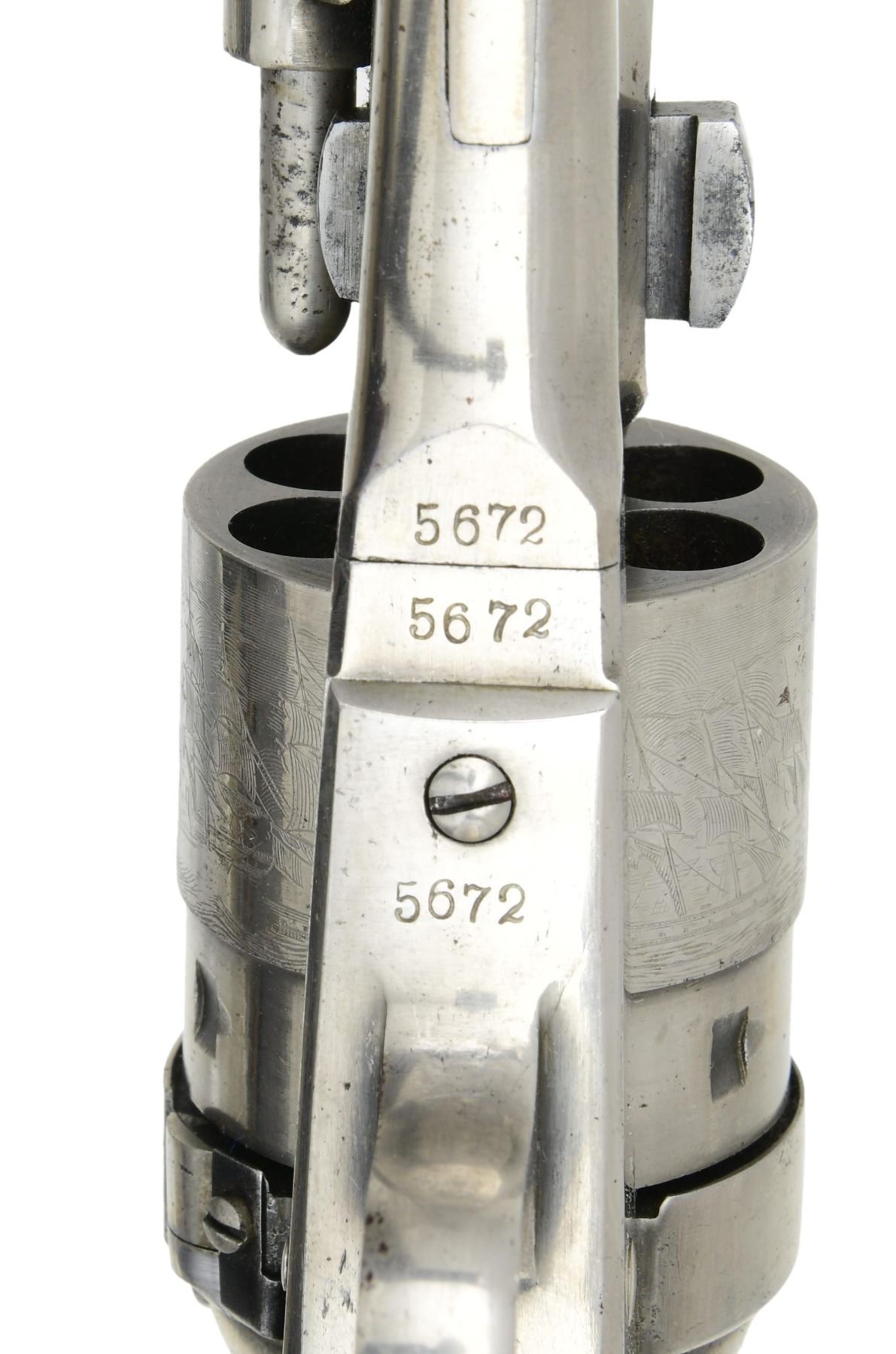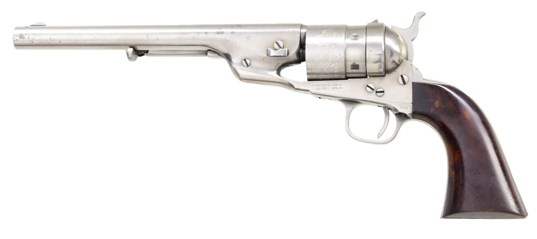 Cal. 44. S# 5672. Bbl. 8", round with a New York address and blade sight. Ejector is mounted on the right side. Six-shot round, rebated conversion cyl. with naval scene roll engraving. Left side of frame has 1871 and 1872 patent dates. One-piece walnut grips. Bbl., frame, grip straps, and cyl. have matching numbers. Total of about 9,000 were converted 1871-78. One group of revolvers began at serial number 1-8700, and another group was within the 1860 army sequence 167,000-200,614. CONDITION: fine; retaining over 90% of its nickel finish. Grips show light finish wear and marks with grain checking in left panel. Sound mechanics. Bore retains strong rifling, showing areas of pitting near muzzle. PROVENANCE: From the Collection of a Tennessee Gentleman. (01-25669/DS). ANTIQUE. $4,000-6,000.