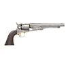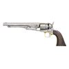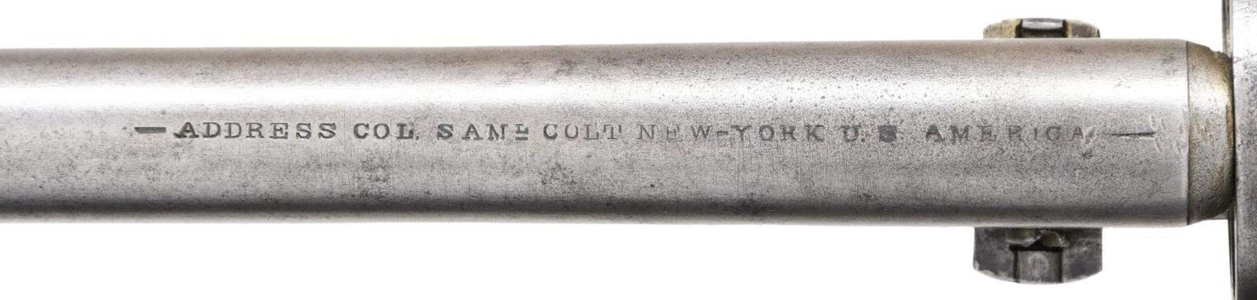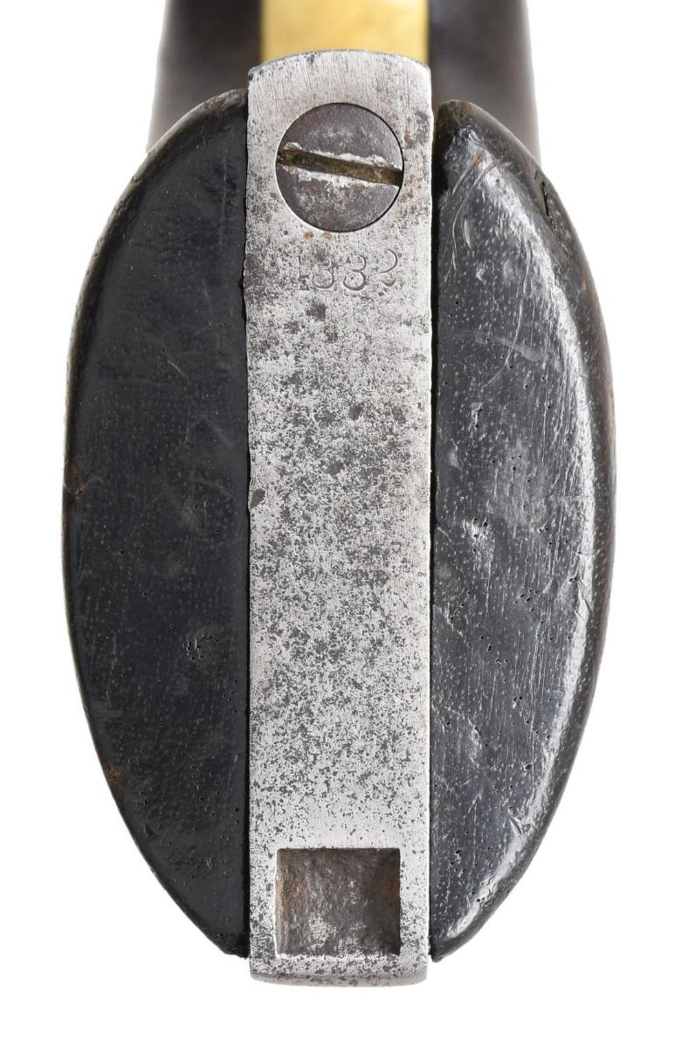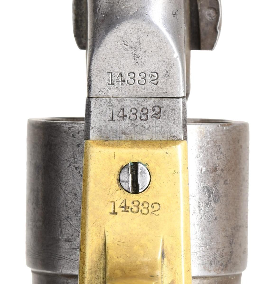 Cal. 44. S# 14332. Bbl. 8" w/ blade sight. Six shot round rebated roll engraved cyl. Action is cut for shoulder stock attachment. Brass trigger guard. 1 Piece walnut grips. Inspector's initials "H" & "T" are found on the bbl. & cyl. respectively. Bbl., frame, grip straps & cyl. have matching numbers. Wedge has non-matching number "002". Mfg. 1862 during the American Civil War. CONDITION: metal has cleaned gray appearance showing some light pitting w/ series of small dents on right bbl. flat. Cyl. retains 30% visible scene. Grips have an age darkened appearance showing heavy wear w/ chips & dents at butt. Action shows light wear, trigger pull is very light. Lightly pitted bore retains intact rifling. (01-24479/DS). ANTIQUE. $800-1,200.
