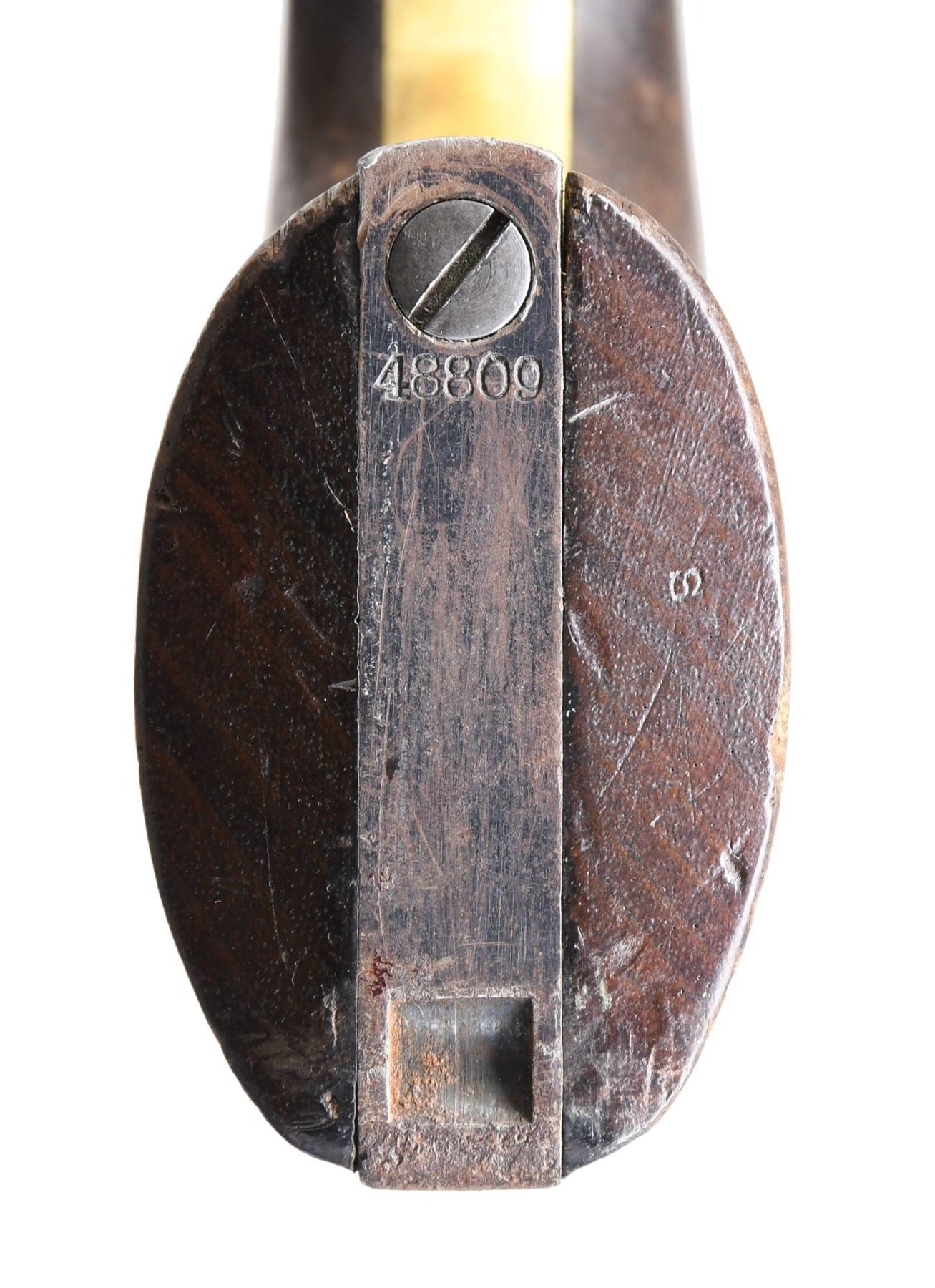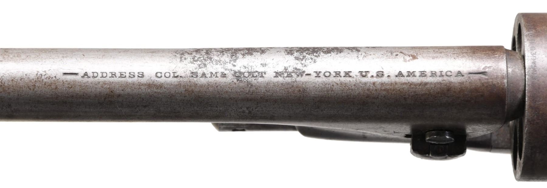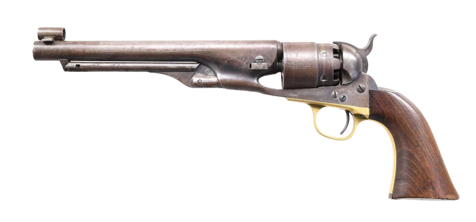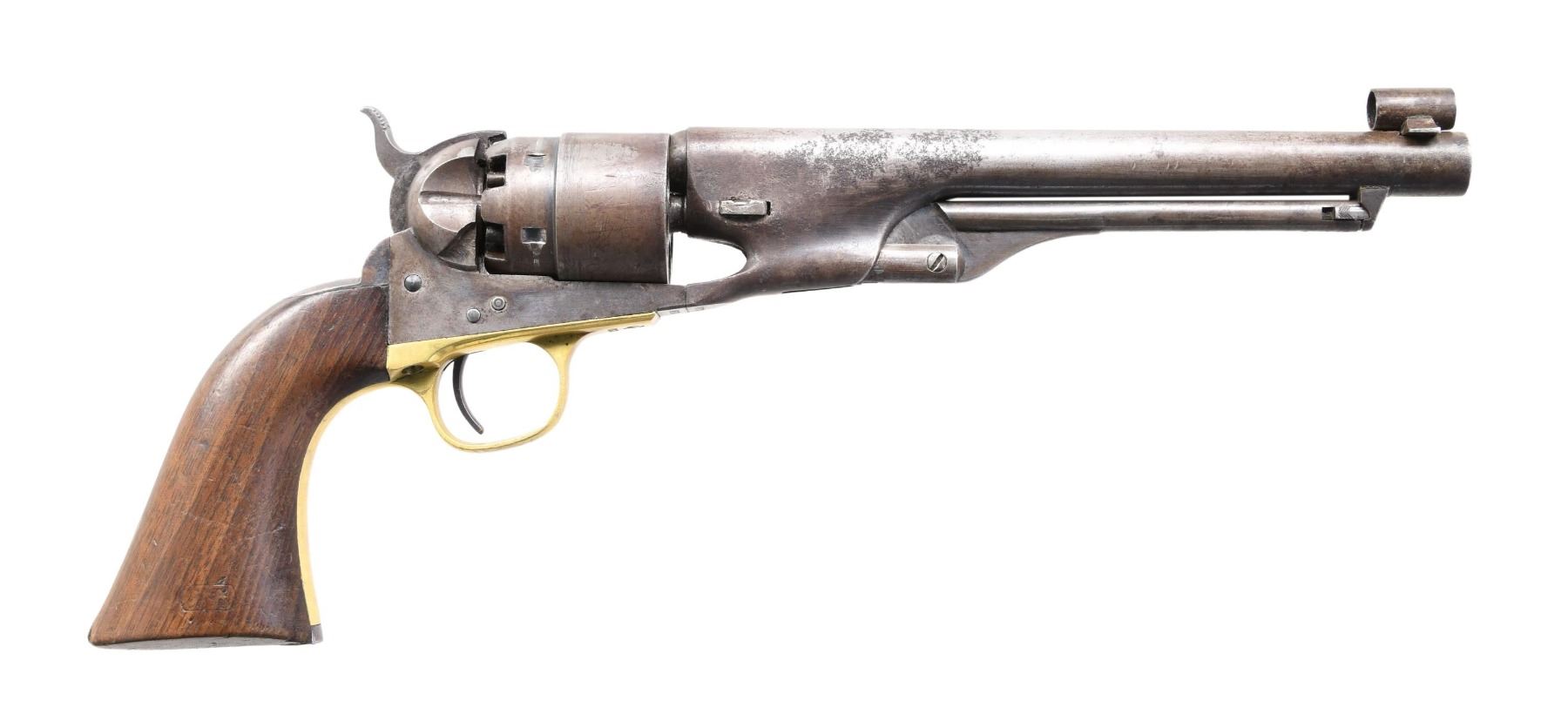 Cal. 44. S# 48809. Bbl. 8", round with a New York address. Replacement hooded bead front sight. Six-shot round, rebated cyl. with naval scene roll engraving. Blue and case-colored finish with silver-finished brass trigger guard. Action has provisions for shoulder stock attachment. One-piece walnut grips; both panels have partially visible cartouches. Bbl., frame, grip straps, cyl., and wedge have matching numbers. Mfg. 1862 during the American Civil War. CONDITION: bbl. shows a small amount of fading blue, with area of pitting on the left side and evidence of cleaning on middle portions. Cyl. has faded to brown, retaining 50% of its scene. Frame has 40% of its case colors on sides. Brass grip strap is cleaned bright. Backstrap has an added hole for an unknown purpose. Grips show wear and handling marks with dents at the butt and small chips at the toe. Cyl. shows some side play. Lightly pitted bore with sound rifling. PROVENANCE: From the Collection of a Tennessee Gentleman. (01-25673/DS). ANTIQUE. $1,200-1,800.