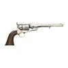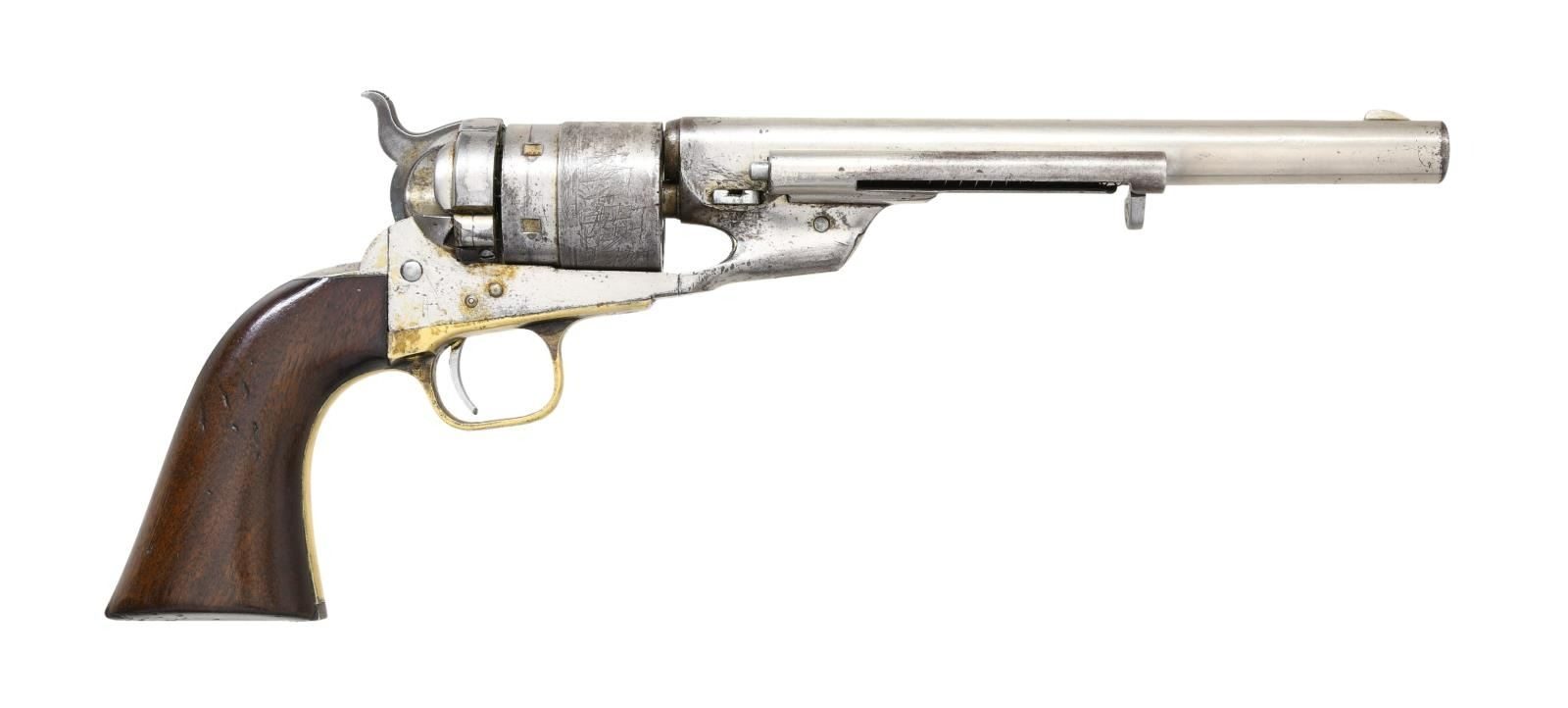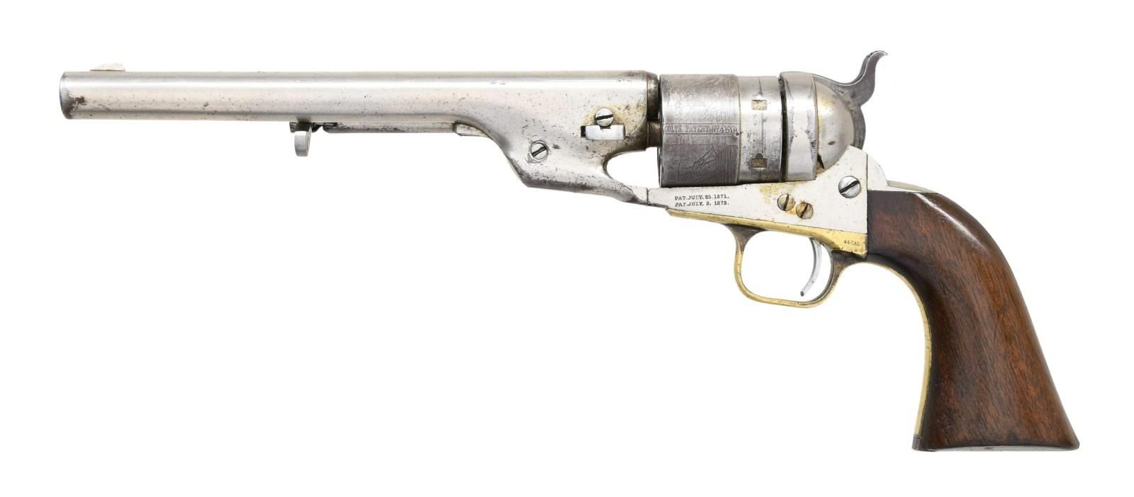 REVOLVER. Cal. 44 Colt CF. S# 184548. Bbl. 8" round w/ New York address & blade front sight. Ejector housing is fitted on left side. Six shot round rebated conversion cyl. w/ naval scene roll engraving. Second model w/ Richards style ejector having Richards-Mason style conversion plate & hammer. Left side of frame has 1871-72 patent dates. Nickel finish w/ silver finished black trigger guard. Bbl., frame, grip straps & cyl. have matching numbers. Wedge is unnumbered. 1 piece walnut grip. About 9,000 converted 1871-78. CONDITION: iron parts retain 60% nickel finish w/ backstrap & cyl. having turned brown. Brass trigger guard shows a small amount of silver finish w/ a black tarnish. Areas around wedge show numerous small dents. Cyl. retains nicely visible scene. Sanded & refinished grips show numerous dents & marks w/ numerous chips at toe. Functioning action has stiff operation. Pitted bore retains largely intact rifling w/ evidence of a light ring approx. 1 1/2" from muzzle. (01-25168/DS). ANTIQUE. $2,250-3,000.