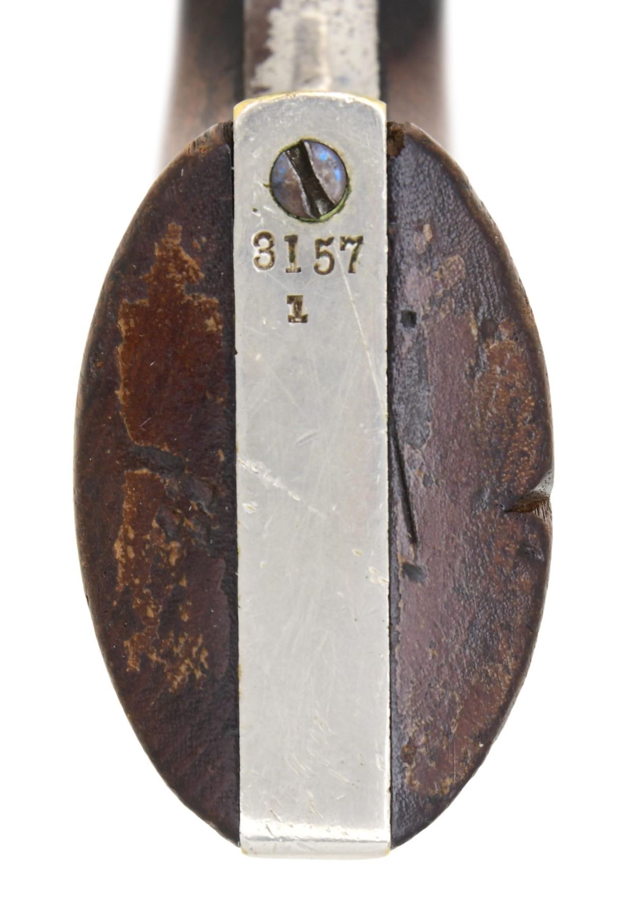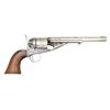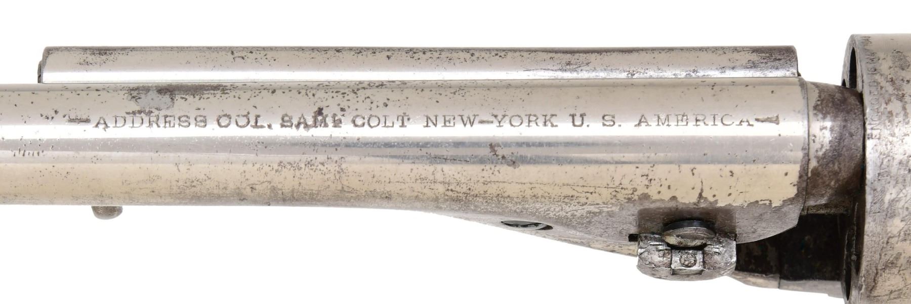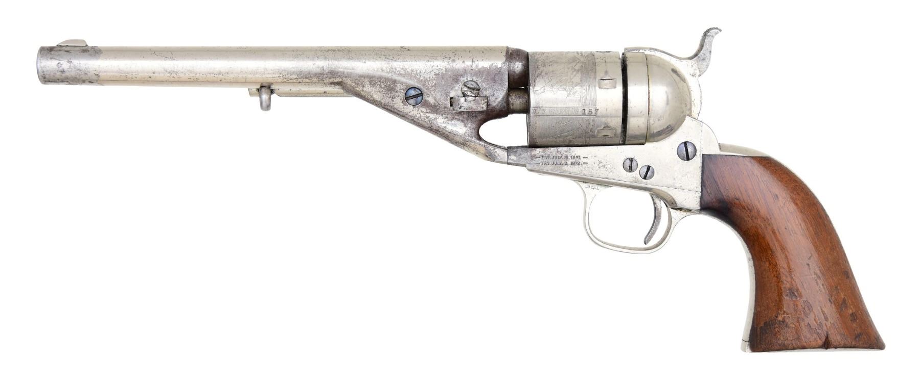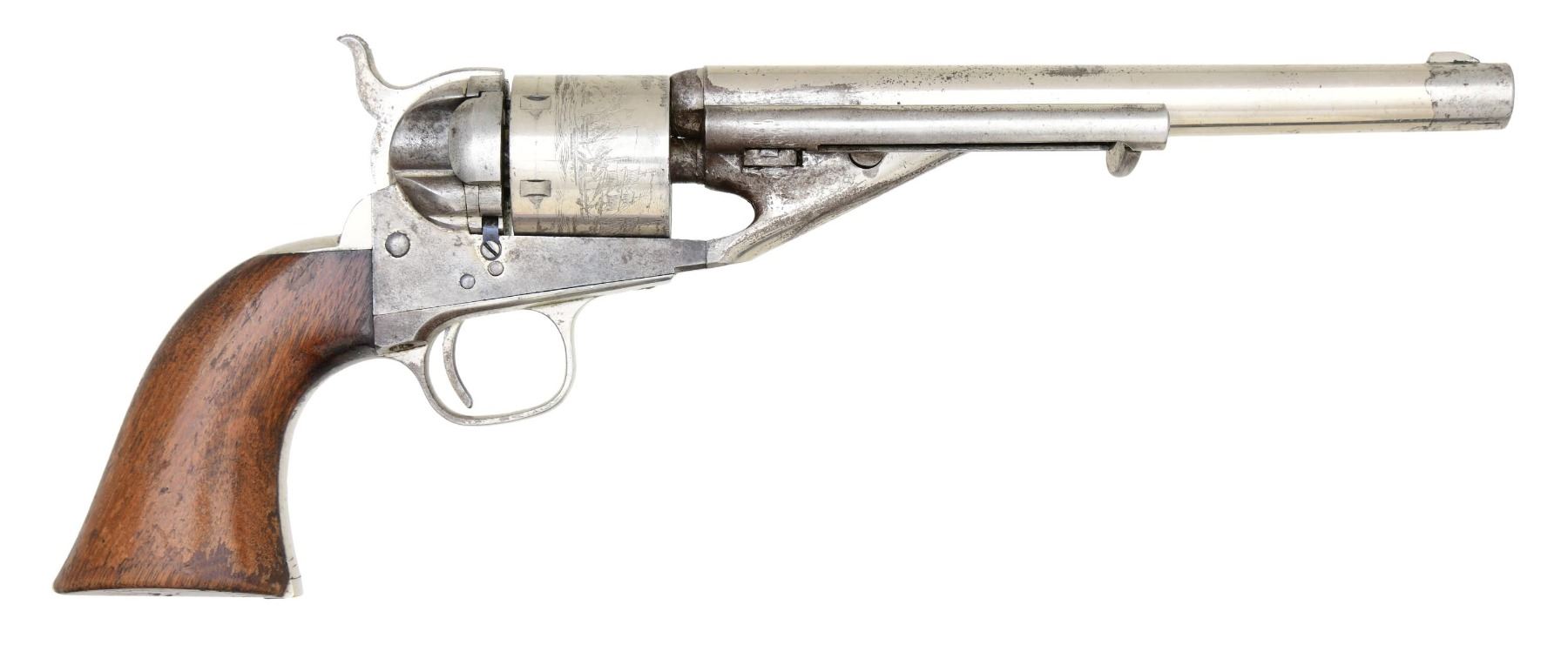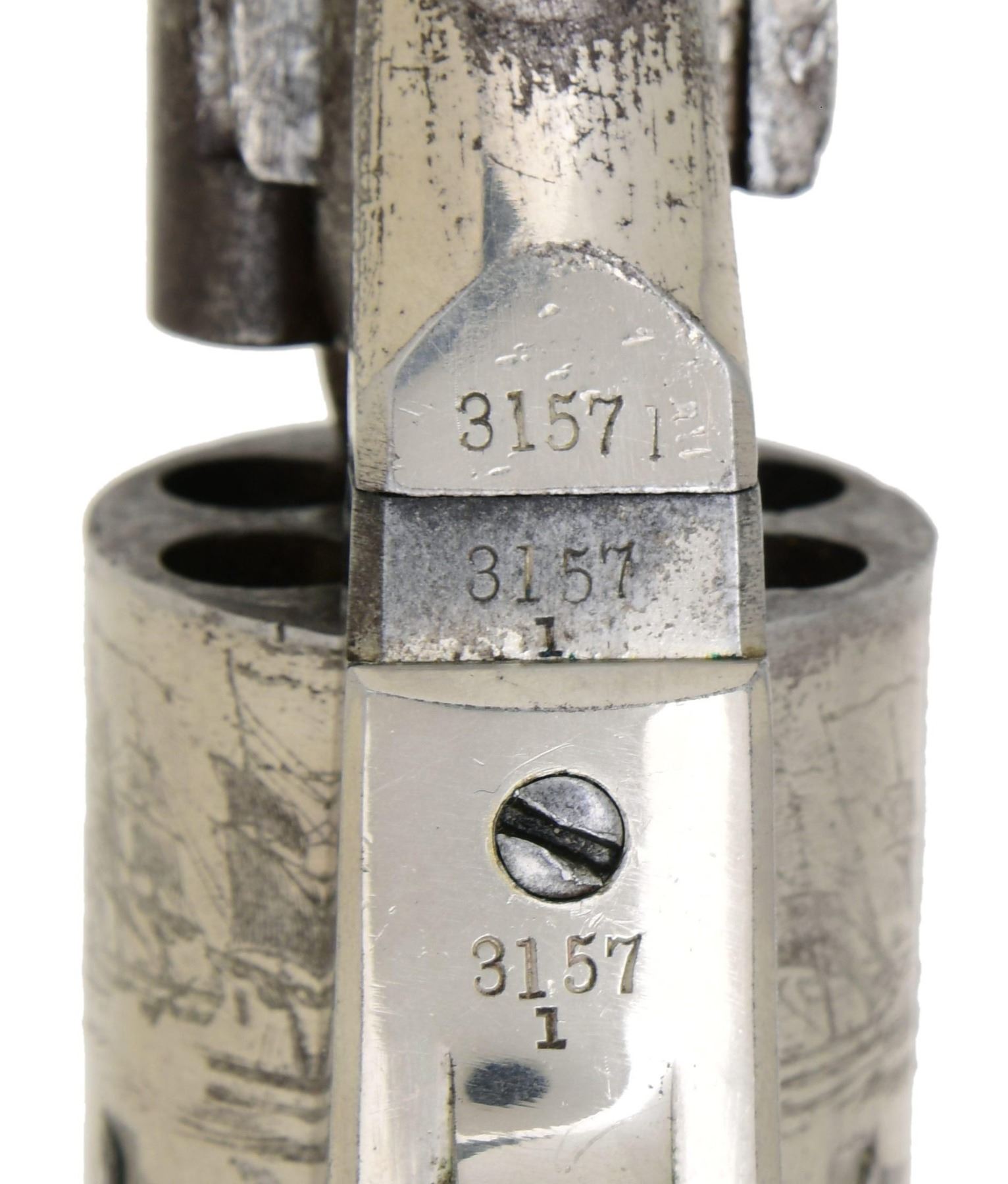 Cal. 38 CF. S# 3157. Bbl. 7 1/2" round w/ blade sight & ejector. Six shot round cyl. w/ naval scene roll engraving. Nickel finish. 1 piece walnut grip. Bbl., frame, grip straps & cyl. have matching numbers w/ additional no. 1 below them. Loading gate has conversion no. "1841". Approx. 2,200 mfg. in the mid 1870s. CONDITION: 60% nickel showing handling marks & spots of corrosion. Grips show wear w/ peeling finish, handling marks & chips at toe. Left panel has a deep dent at butt. Tight sound action. Bore retains sound rifling showing spots of light pitting. (01-25533/DS). ANTIQUE. $4,000-6,000.