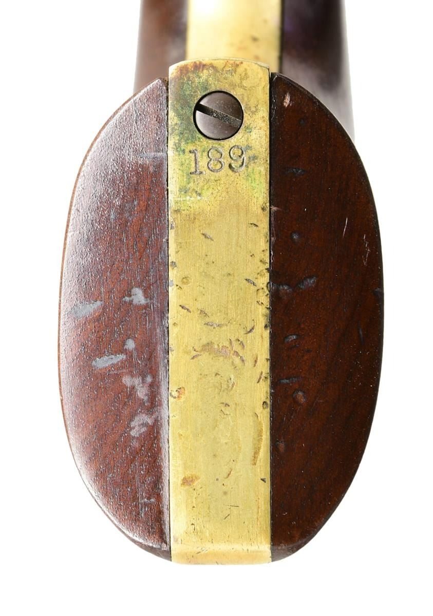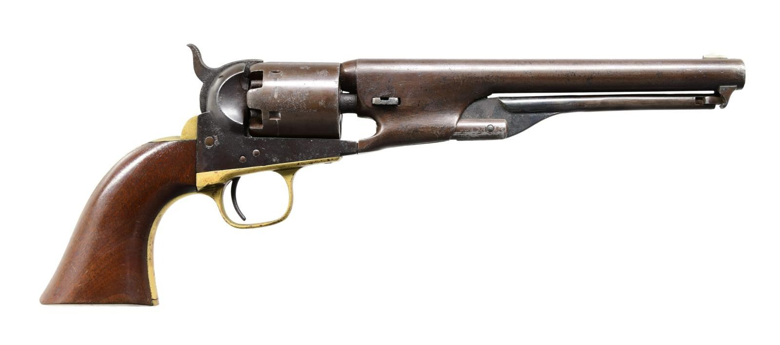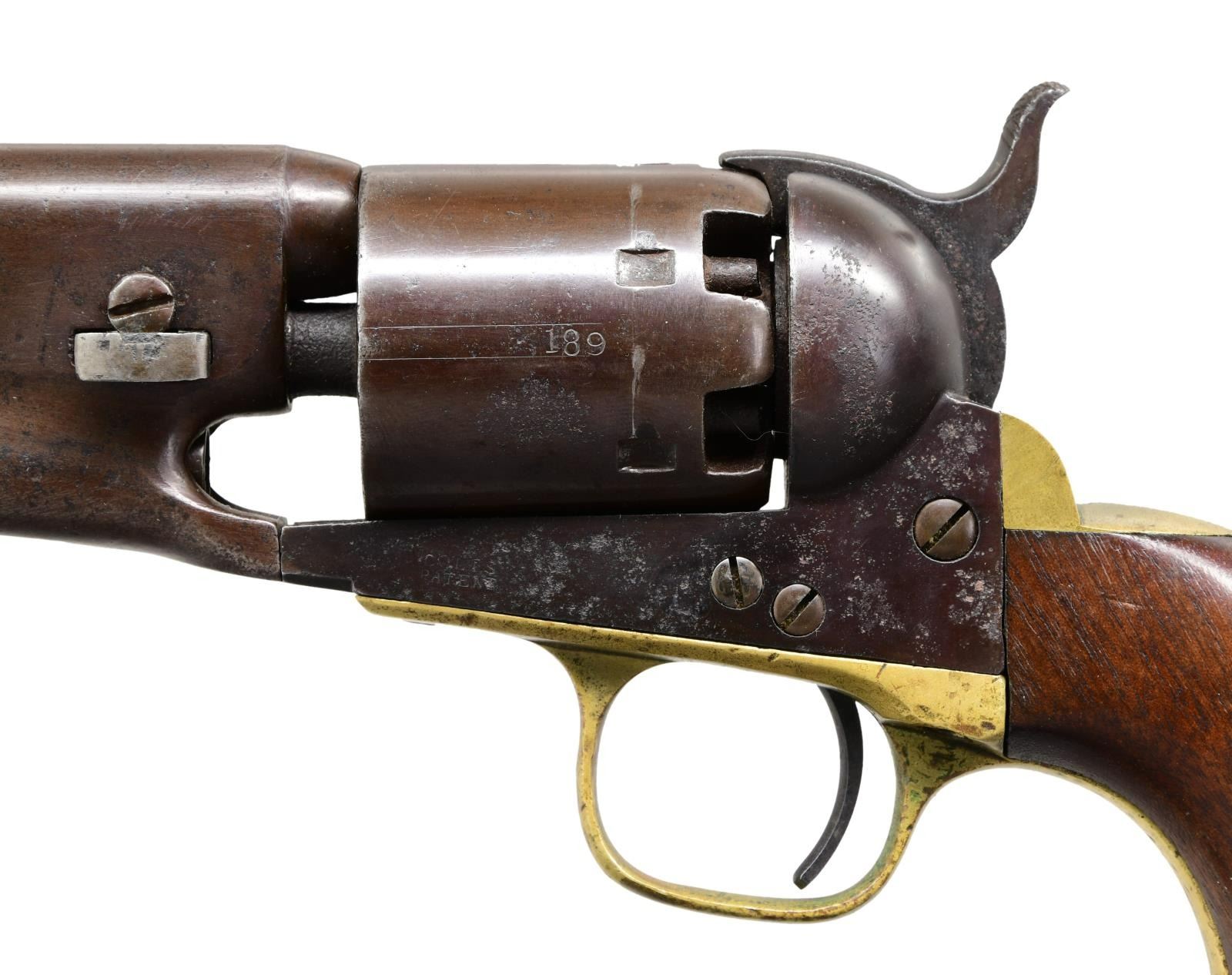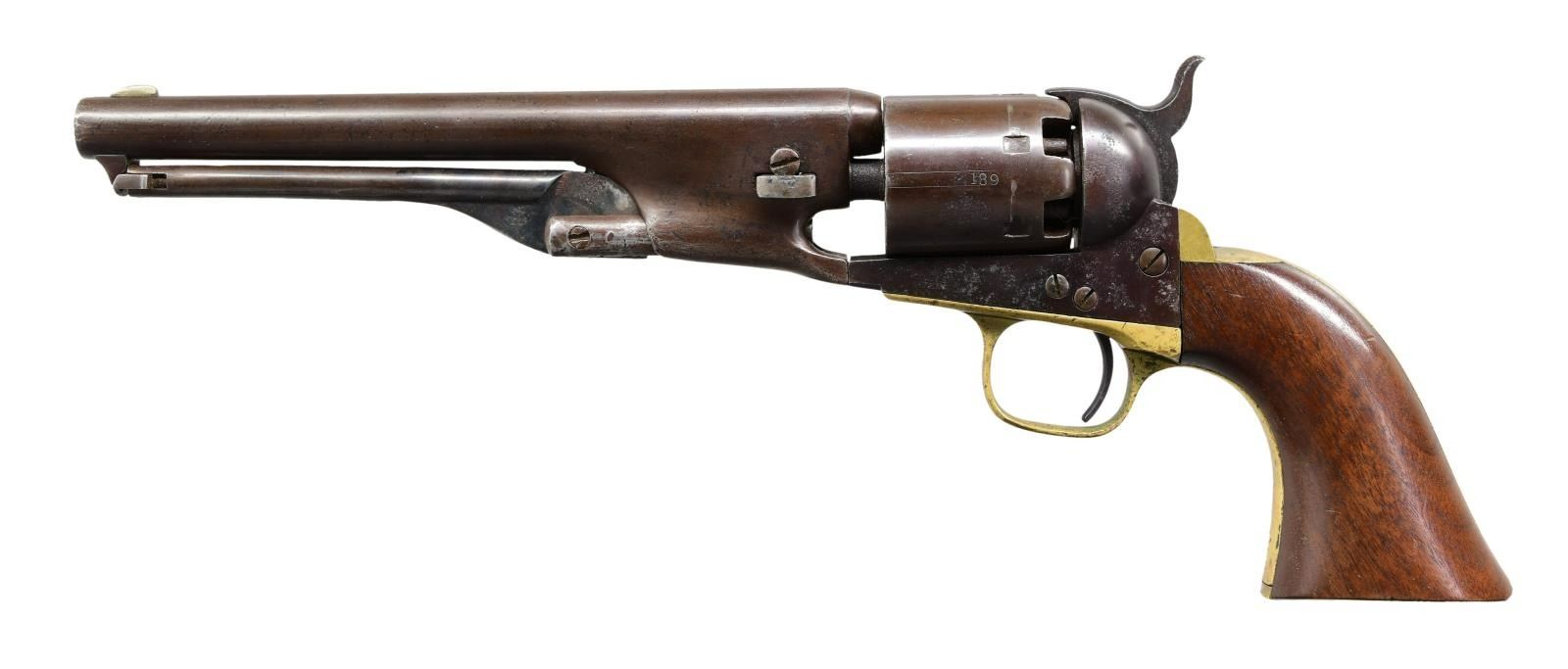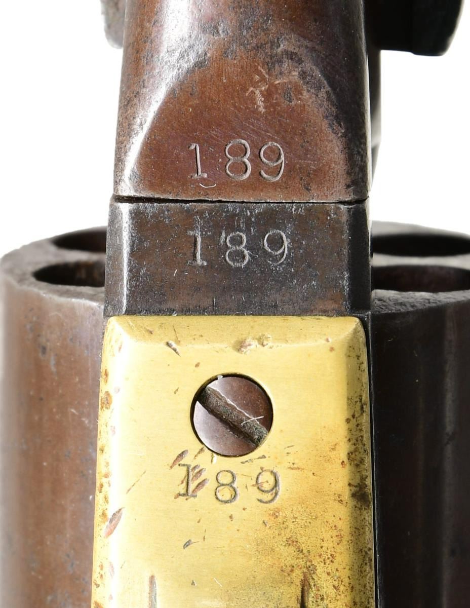 Cal. 36. S# 189. Bbl. 7 1/2" round w/ German silver blade front sight. Six shot round cyl. Brass backstrap & trigger guard. 1 piece walnut grip. Bbl., frame, grip straps, cyl. & wedge have matching numbers. Mfg. 1861, first year of production, during the American Civil War. CONDITION: metal shows heavy cleaning w/ some remaining pitting having an added smooth brown finish. Frame markings are weak. Sanded & refinished grips have dents at butt. Cyl. does not index properly when action is cycled. Dark pitted bore has largely intact rifling. (01-25193/DS). ANTIQUE. $1,500-2,000.