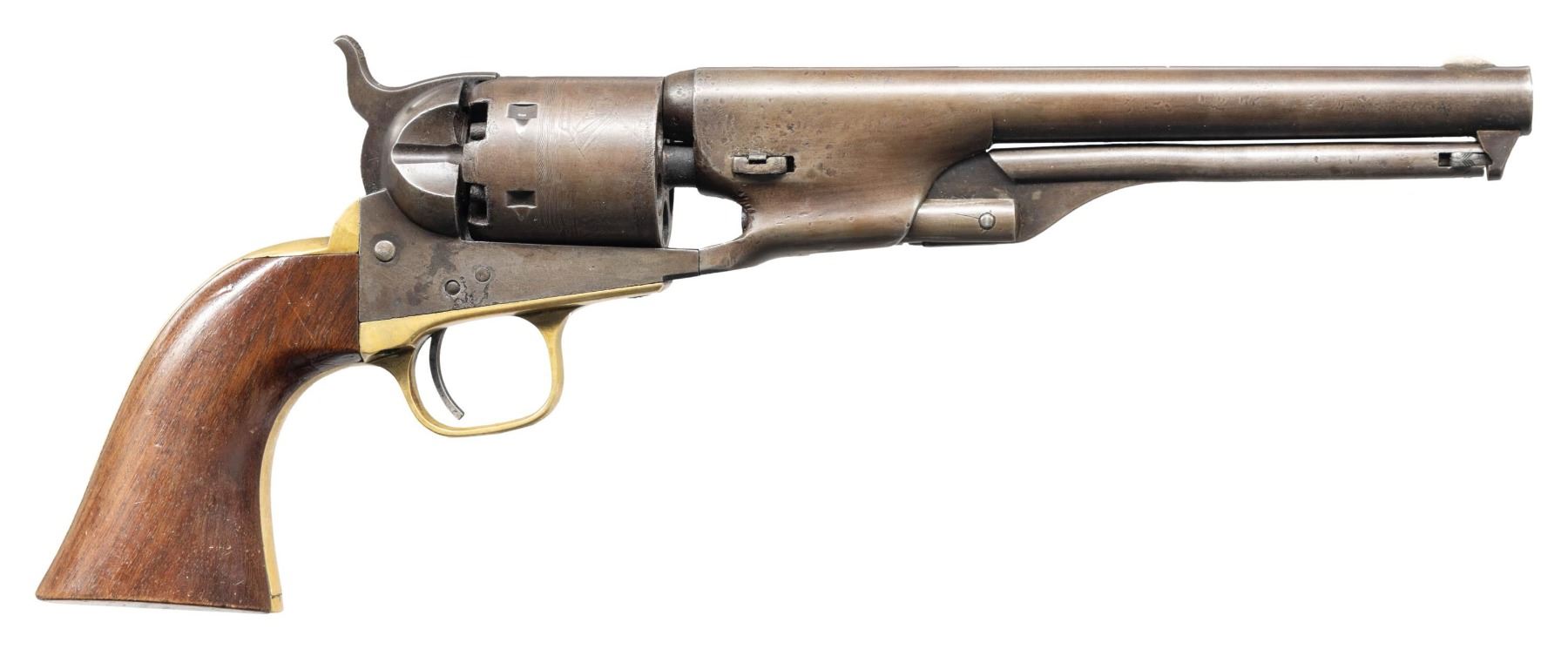 Cal. 36. S# 18577. Bbl 7 1/2" round with blade sight and New York address. Round 6-shot cyl with Texas Navy scene roll engraving. Frame, bbl, cyl, and grip straps have matching numbers. 1-pc walnut grip. Mfg. 1865. CONDITION: metal has a gray appearance showing numerous small dents and spots of pitting. Cyl retains 80% lightly faded scene. Brass grip straps shows evidence of past cleaning. Grips have lightly worn finish showing scratches and marks. Some action screws are replacements. Sound action. Lightly pitted bore retains strong rifling. (01-28541/DS). ANTIQUE. $1,200-1,800.