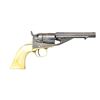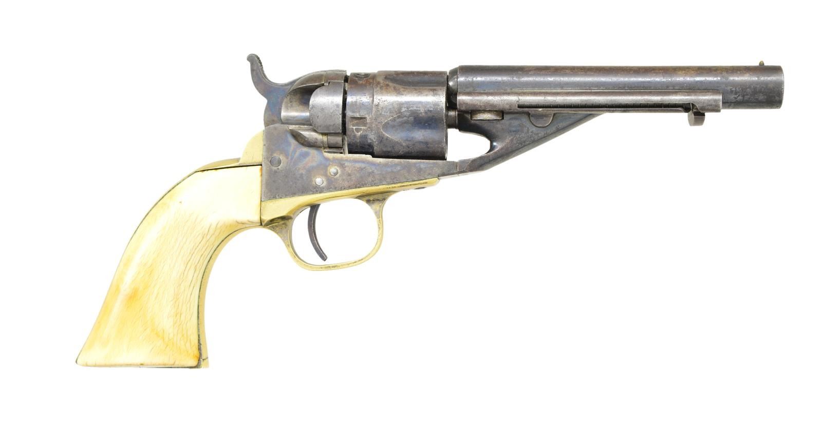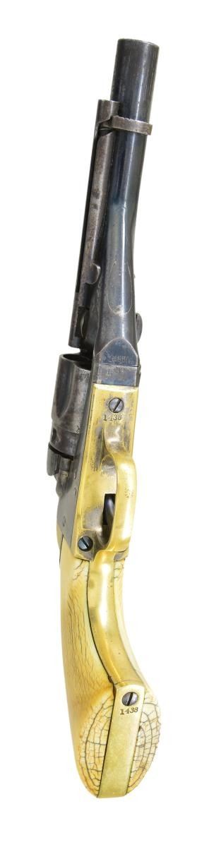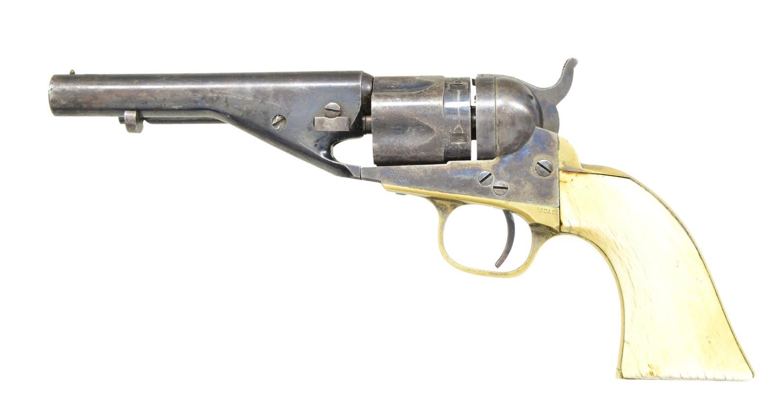 Cal. 38 RF. S# 1438. Bbl. 4 1/2" rnd. w/ bead sight & New York address. Loading lever hole is plugged. Five shot rnd. rebated fluted cyl. Conversion loading gate is numbered "879". Blue finish w/ case colored receiver, hammer & trigger. Left side of frame is marked "COLT / PATENT". Silver finished brass backstrap & triggerguard. One piece ivory grips. Bbl., frame & grip straps have matching numbers. Wedge & cyl. are unnumbered. Est. quantity of 6,500 produced 1873-1875. CONDITION: bbl. & cyl. retain over 50% dull blue blending w/ areas of fading & sm. spots of surface corrosion. Frame & hammer retain 70% dark visible case colors. Grip straps retain a sm. amount of silver finish in protected areas. Ivory grips show age related checking & have acquired a mild yellow coloration. Strong mechanics. Lightly pitted bore retains sound rifling. PROVENANCE: From the Collection of James B. Taylor. (01-20557/DS). ANTIQUE. $2,000-3,000.