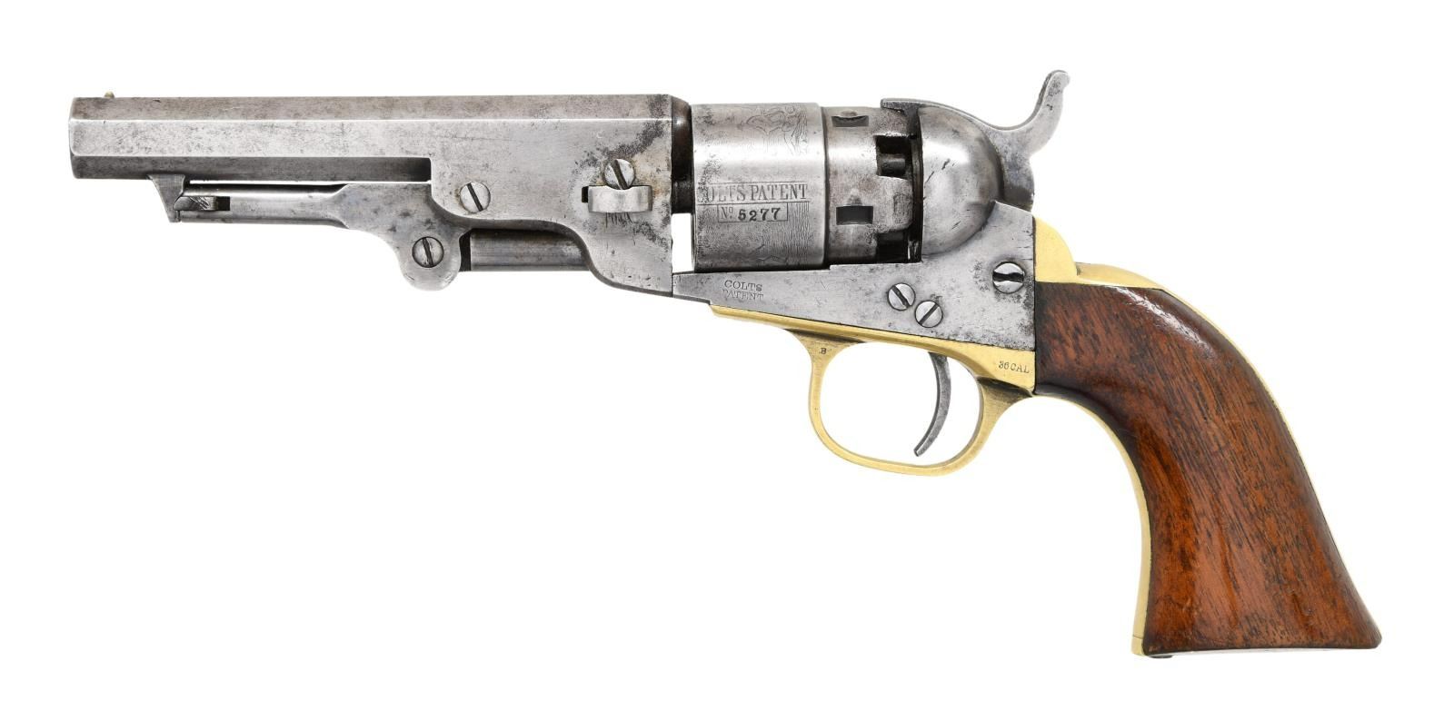 Cal. 36. S# 15277. Bbl. 4 1/2", octagon with bead sight and New York address. Five-shot round rebated cyl. with stagecoach scene roll engraving. Brass trigger guard and backstrap. 1 piece walnut grip. CONDITION: metal has a cleaned gray appearance with a series of small dents on the right bbl. flat. Cyl. retains a clearly visible scene. Grips show wear and handling marks. Good mechanics. Lightly pitted bore. (01-24435/DS). ANTIQUE. $1,200-1,800.