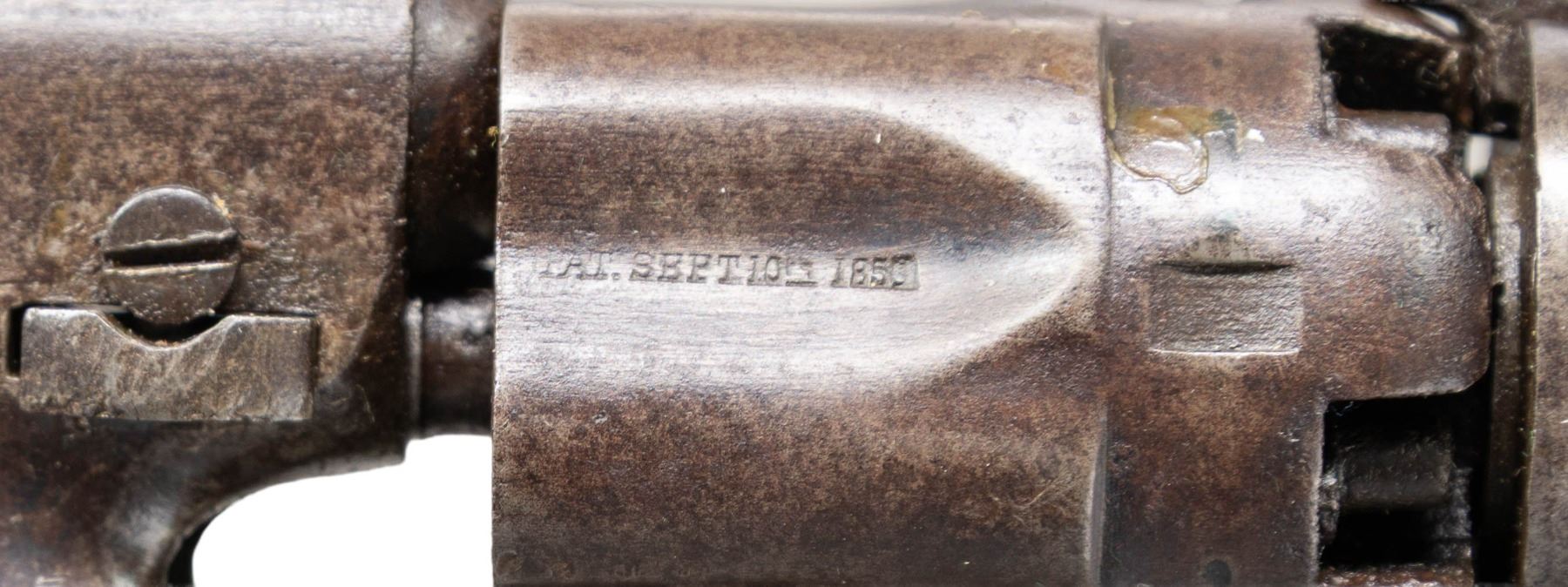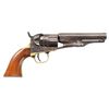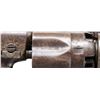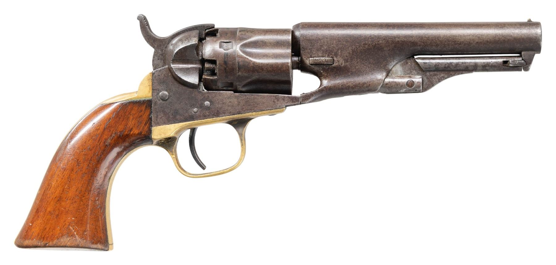 Cal. 36. S# 16154. Bbl 4 1/2" rnd with New York address and brass bead. 5-shot rebated fluted cyl. Silver plated brass grip straps. Bbl, frame and grip straps have matching numbers. 1-pc walnut grip. Mfg. 1864. UNATTACHED ACCESSORIES: modern wooden lap desk with green felt fitted interior. Case contains powder flask, oil bottle, cap tins, pocket knife, ink pen, coins and case keys. CONDITION: metal has faded to brown showing some light pitting. Brass grip straps show traces of dark tarnished silver in protected areas. Grips show wear and handling marks. Sound action. Bore retains strong rifling. (01-28516/DS). ANTIQUE. $1,200-1,800.