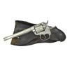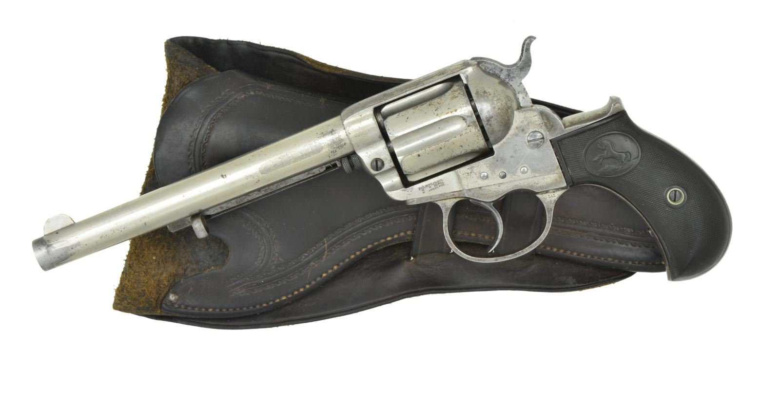 HISTORY. Cal. 41 Colt. S# 9490. Bbl. 6” w/ etched panel cal. marking & semicircular sight. Round six shot long flute cyl. Full nickel finish. 2 piece checkered hard rubber rampant colt grips. UNATTACHED ACCESSORIES: this desirable revolver belonged to Texas Ranger Tommy Degraffenried & was at once time displayed in the Texas Range hall of fame in Waco, Texas. Letters from Gary Burghoff & T. N. Taylor detailing history of the revolver’s prior ownership. Colt mfg. co. letter listing the following information: “Serial Number: 9490”, “Caliber: .41/c”, “Barrel Length: 6’”, “Finish: Nickel”, “Type of Stocks: Rubber”, “Shipped To: B. Kittredge & Company”, “Address: Cincinnati, Ohio”, “Date of Shipment: April 22, 1880” & “Number of Same Type Guns in Shipment: 13”. Also included is a Mexican style double loop leather holster w/ stamped borders. Holster is in good condition. CONDITION: very fine. Retains over 70% original nickel finish. Grips show light wear. Sound mechanics. Bore retains strong rifling. (01-22903/DS). ANTIQUE. $2,000-4,000.