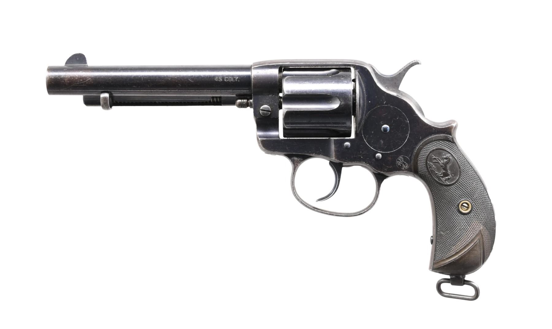 Cal. 45 Colt. SN. 40317. Bbl. 5 1/2". 6 shot long flue cyl. Blue finish. 2 piece checkered hard rubber rampant colt grips. w/ lanyard loop at butt. Total of 51,210 mfg. 1878-1905. CONDITION: 70% lightly faded blue shows edge wear & scratches. Grips show light wear w/ some discoloration. Tight action. Very good bore. (24-3764/DS). CURIO. $2000-3000.