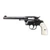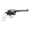 Cal. 38 Colt. S# 10731. Bbl. 6". Early Model 1905 USMC commercial double action revolver mfg. by Colt. Top of the bbl. is marked "COLT'S PT. F.A. MFG. CO. HARTFORD CT, U.S.A./ PATENTED AUG.5.1884 NOV.6.88. MAR.5.95.", with "COLT. D.A. 38" marked on the left. Left side of the frame is marked with the encircled Rampant Colt logo and "VP" proof. Metal components exhibit a blue finish overall, with the trigger and rear strap of the hammer exhibiting a nitre blue finish. Frame is mounted with 2-piece smooth Mother of Pearl grips. Half-moon blade front sight, with "U" frame notched rear sight. Matching assembly # "753" is marked on the frame, cyl. crane, as well as on the cyl. latch. Lanyard loop swivel on butt has been ground. CONDITION: metal components retain fair amounts of their original factory blue finish, exhibiting areas of wear and thinning overall that show through to gray patina, with some scattered spots of light surface oxidation and pitting. Bright bore, exhibiting scattered spots of mild pitting, while retaining strong rifling throughout. Action functions appropriately when cycled by hand. Grips show some age related discoloration, as well as some scattered marks from handling and storage, but otherwise remain sturdy and serviceable. (24-6970/MLW). CURIO. $300-500.