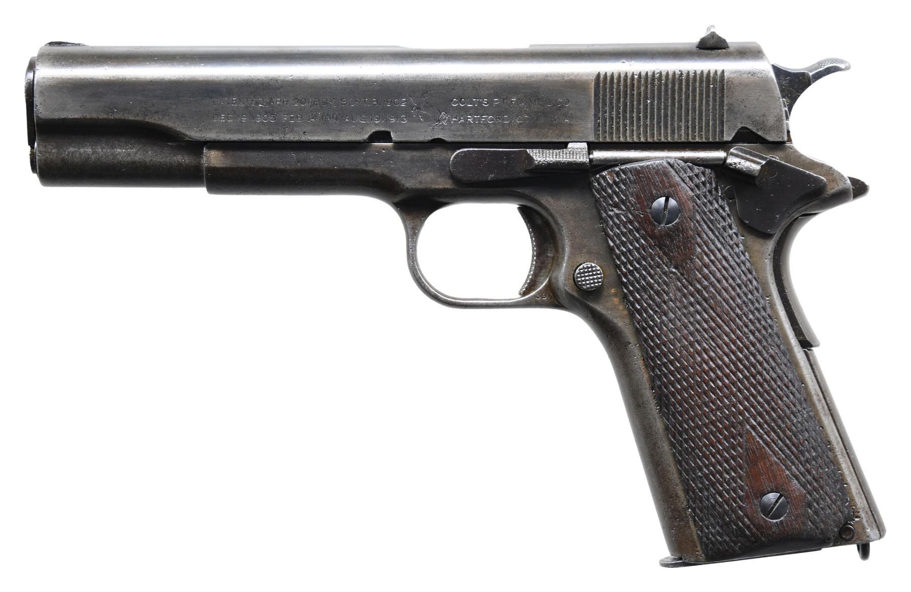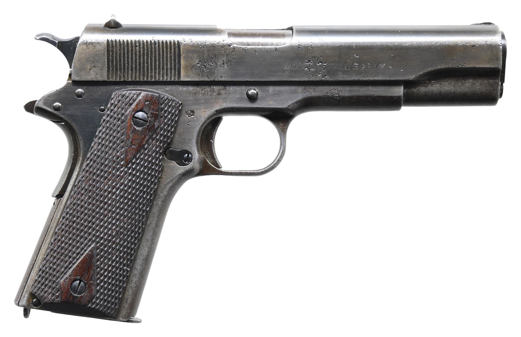 Cal. 45 ACP. S# 571094. Originally mfg. late 1918 w/in S# block 450,000-629,500. Left side of frame has "GBE" import mark along with eagle S12 proof. Pre WWII field replacement Springfield 5" bbl. Replacement 1911A1 trigger. Front side has been filed down & rear sight filed from U notch to square notch. Balance of remaining parts appear correct for time period including dbl. diamond checkered walnut grips. MAGS: 1 Barnes & Kobert 2 tone 7 rd. CONDITION: frame & slide have heavily cleaned & worn brown patina appearance showing traces of rough blue. Small parts show some blue with deep pitting. Fair worn grips. Poor pitted bore. (25-2641/MD). CURIO. $700-1,100.