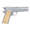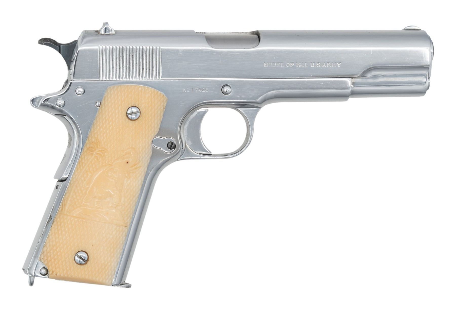 Cal. 45 ACP. S# 17426. Military pistol originally mfg. 1912 has been bright polished refinish. Pistol has most of military parts with replacement white plastic grips & replacement hammer. MAGS: 1 Scovill 7 rd. w/ refinish to base. CONDITION: good refinish with scattered areas of peeling finish to patina. Good grips. Barrel shows good blue refinish with polishing on top of barrel; good rifling with light pitting. (25-2654/MD). CURIO. $700-1,000.